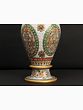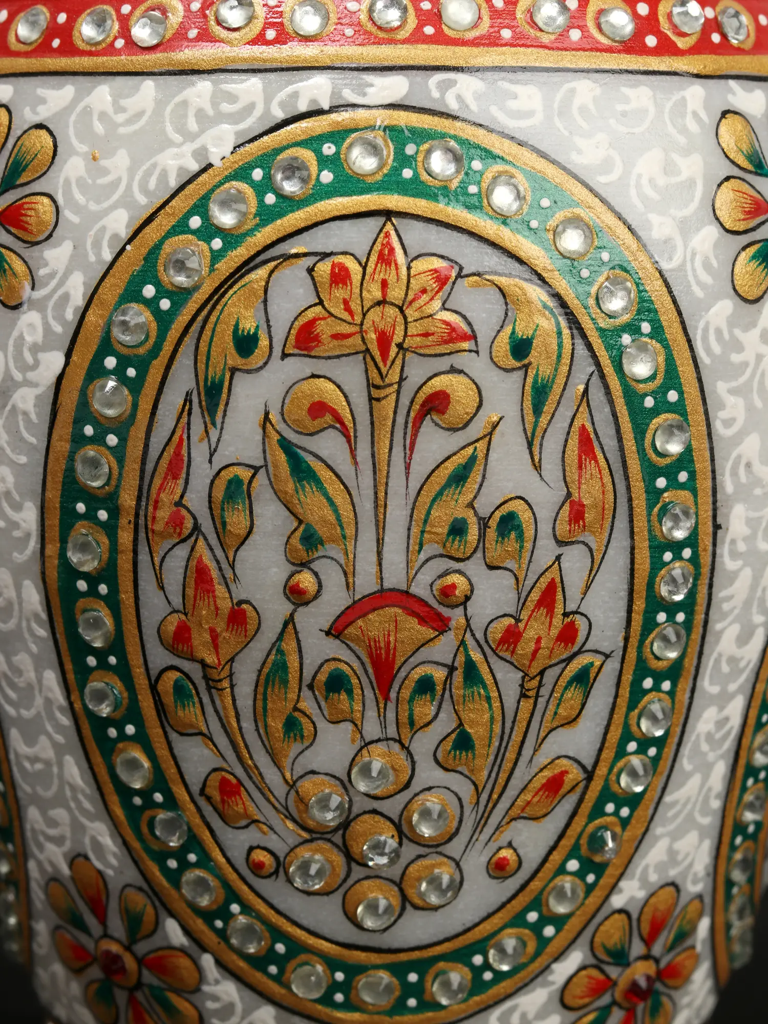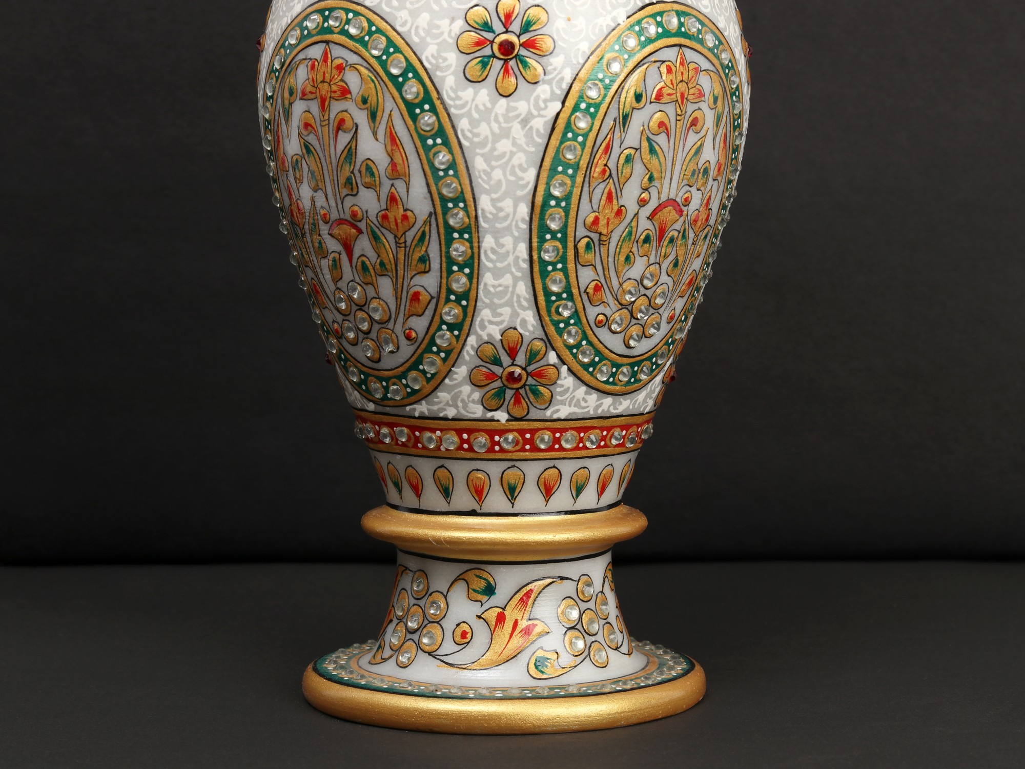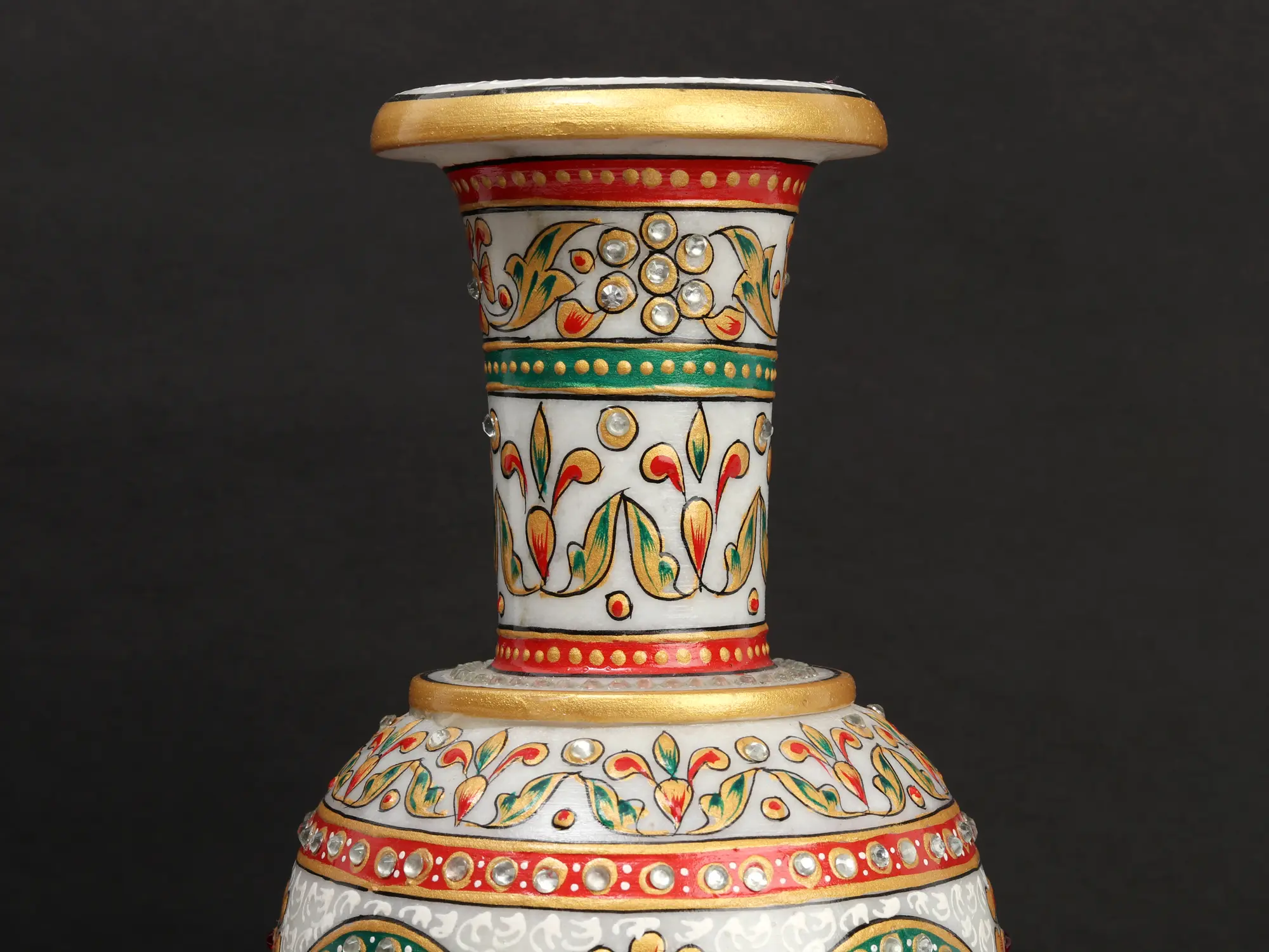 The vase's beauty lies in its meticulous detailing. The creamy white marble provides a striking backdrop for the vibrant hand-painted floral motifs and delicate stone embellishments. Each element is carefully placed, creating a visually stunning effect that is both sophisticated and captivating. The gold accents add a touch of opulence, while the vibrant hues of red and green bring a burst of color and energy. The artistry involved in creating this piece is evident in every curve and detail, showcasing the skill and dedication of the artisans who brought it to life. This isn't just a vase; it's a testament to the power of handcrafted beauty.