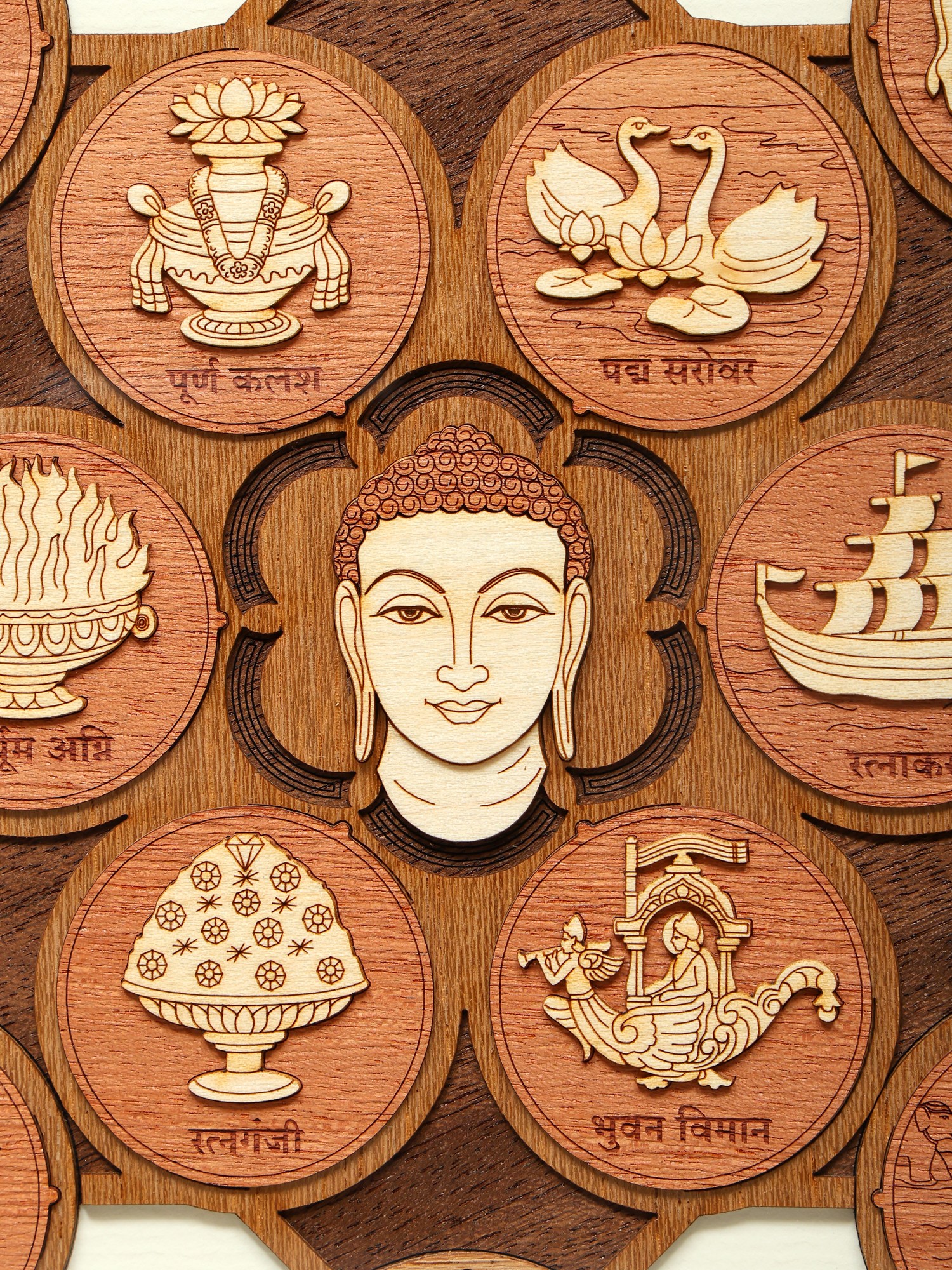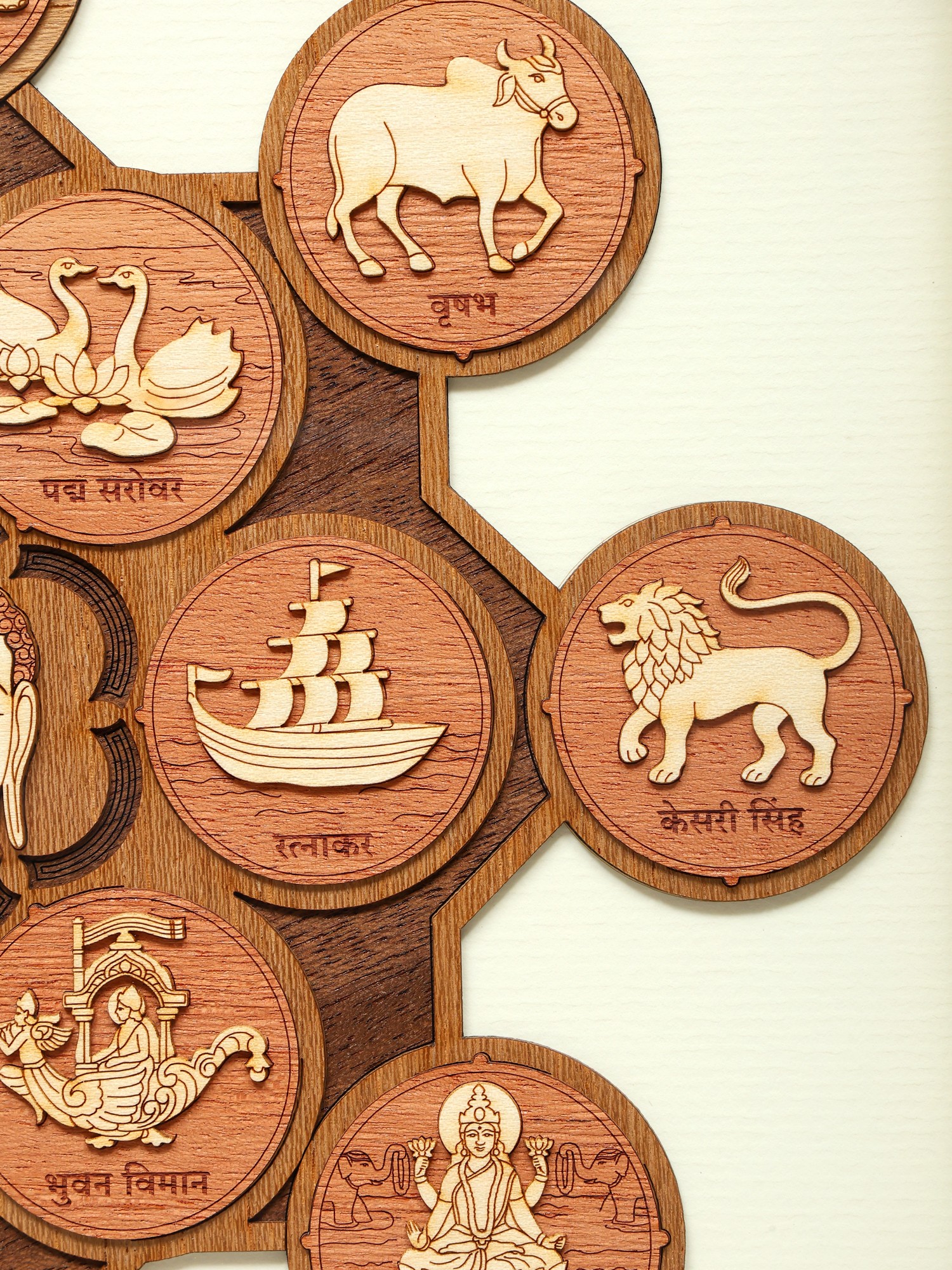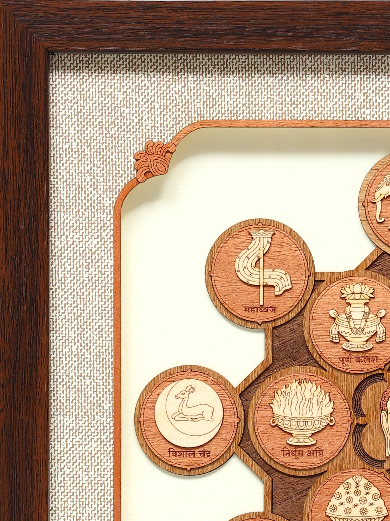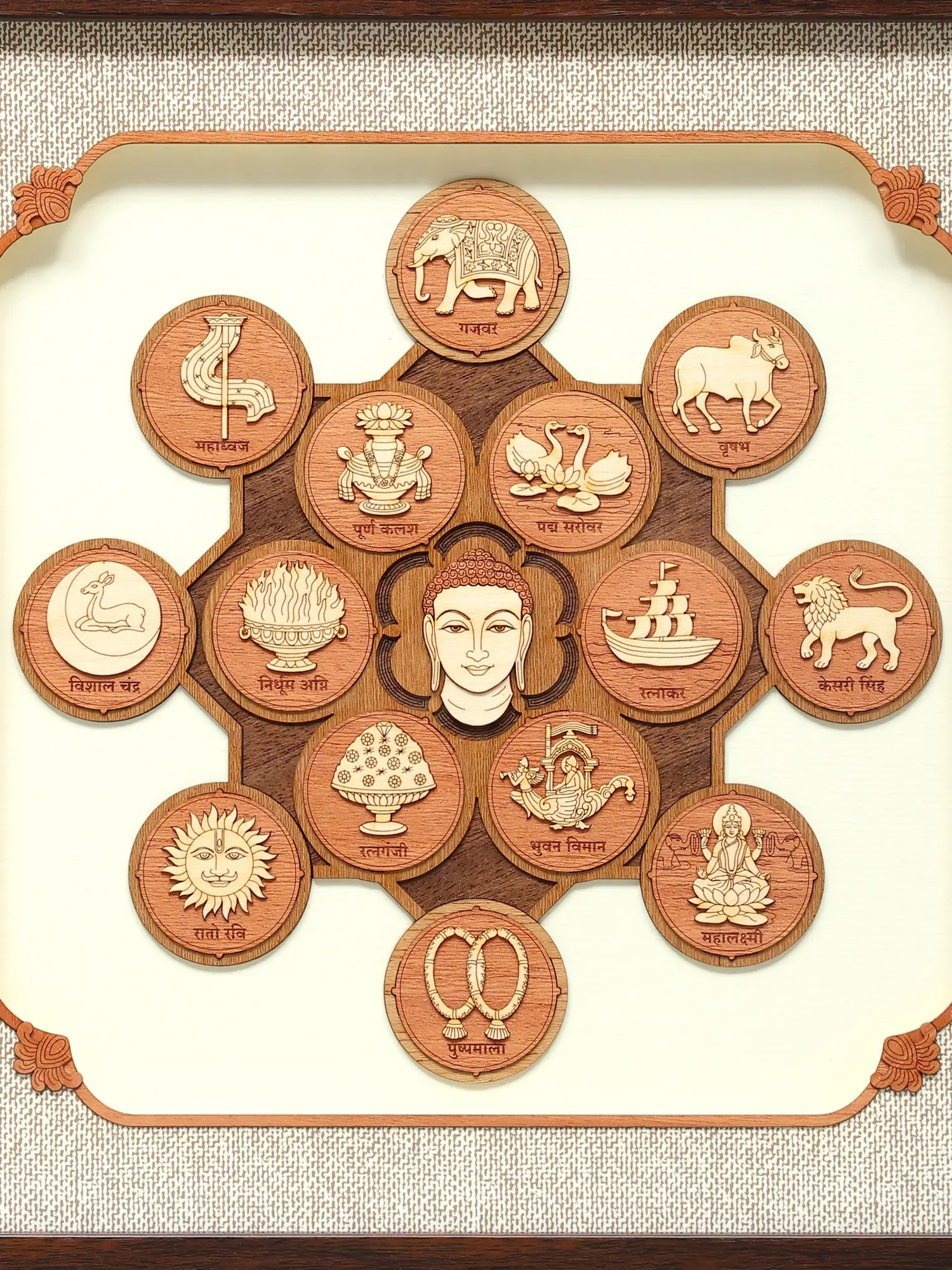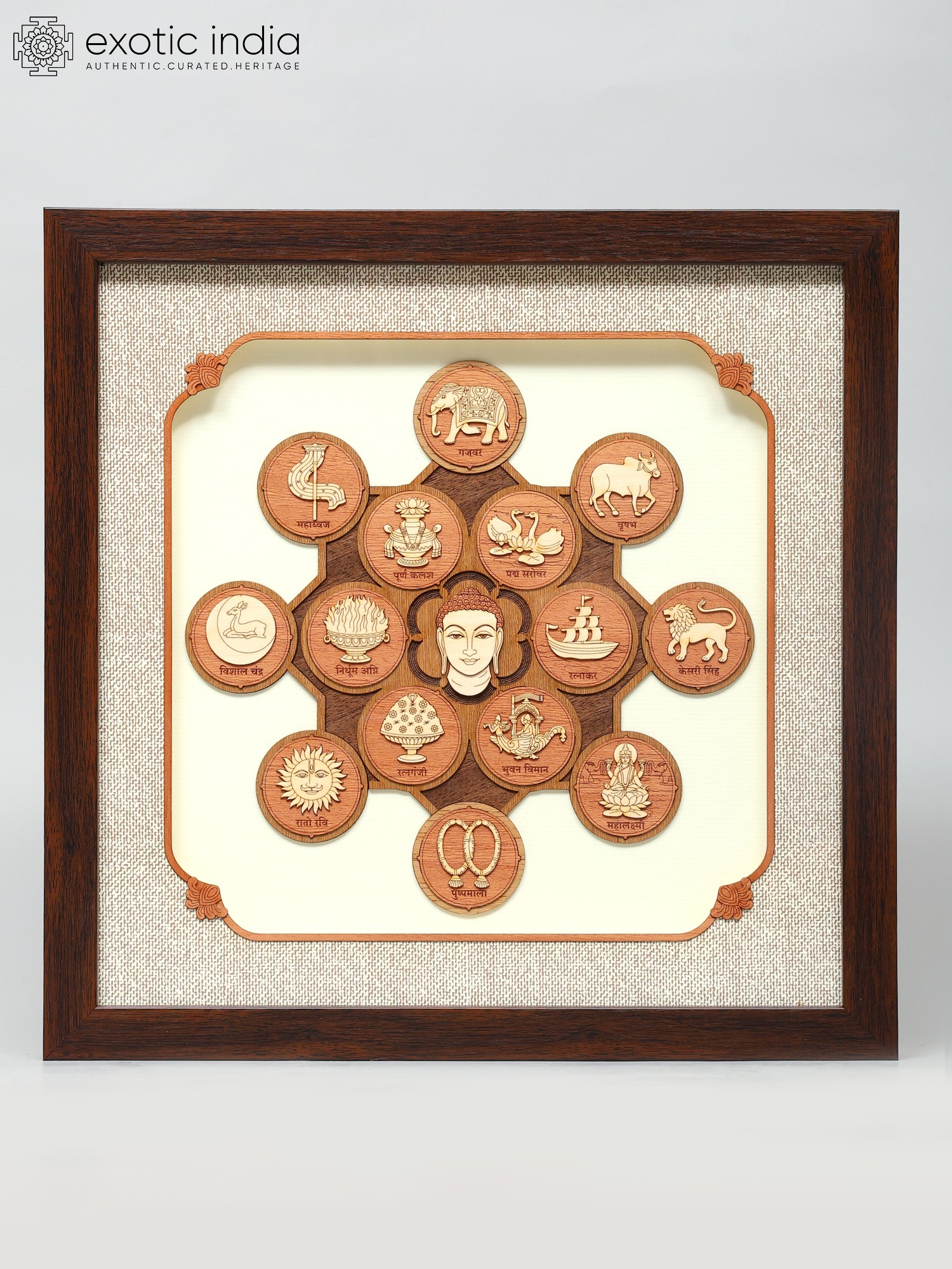 12" Fourteen Auspicious Dreams (Swapna) in Jainism | Wood Carved Frame | Wall Hanging