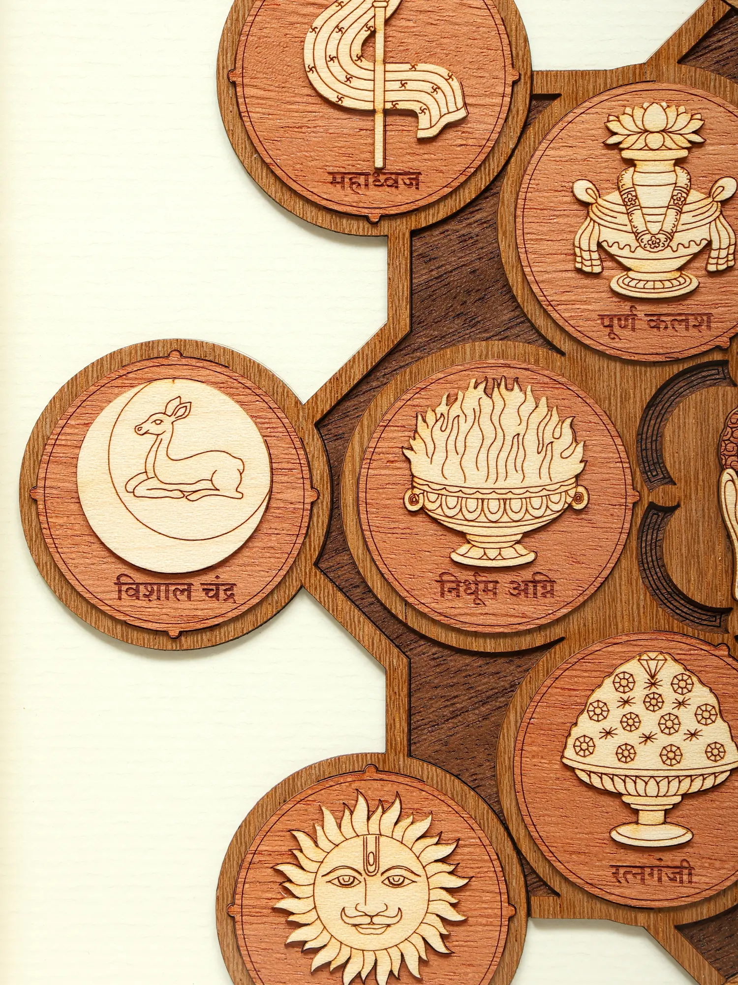 Blessing Lord Ganesha with Auspicious Hindu Symbols | Wood Carved Frame | Wall Hanging