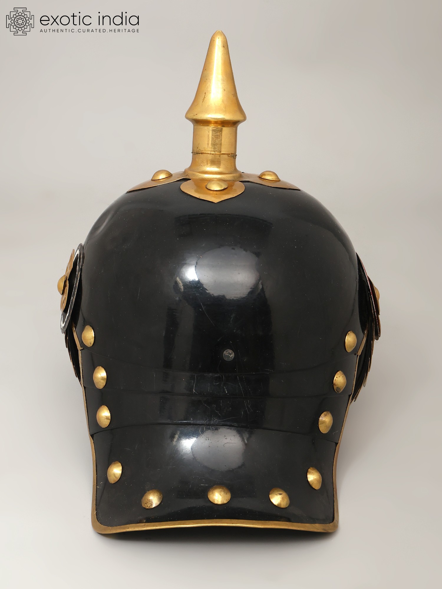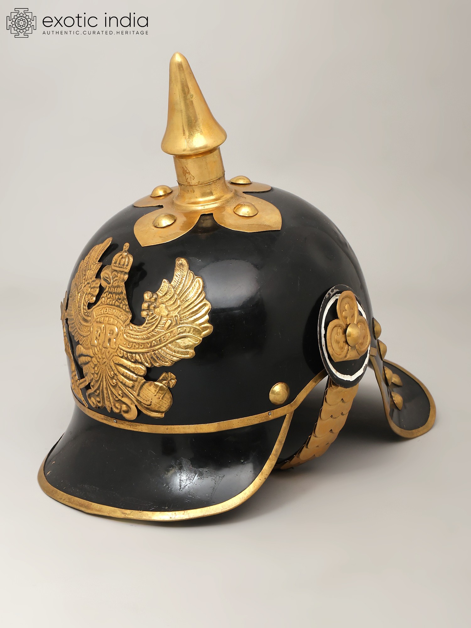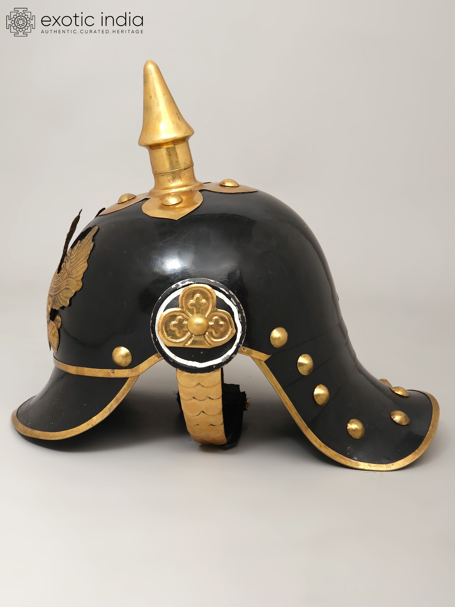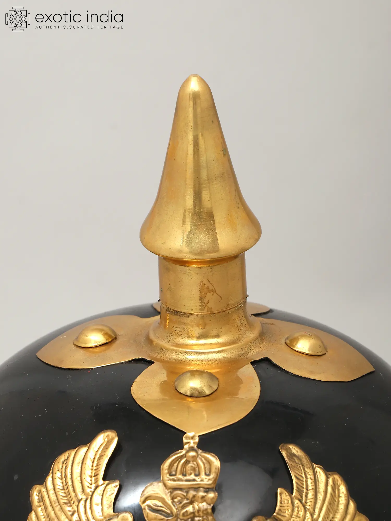 Add a striking and historically-inspired accent to your home or office with this meticulously crafted piece. This impressive decorative item captures the essence of a bygone era, bringing a sense of strength and regal authority to any space. The piece is a perfect addition for those who appreciate historical artifacts, military history, or simply seeking a bold and unique decorative element. Crafted with careful attention to detail, it reflects the iconic design of a classic military helmet. The smooth, dark finish of the main body is accentuated by intricate metallic embellishments, creating a visually captivating contrast. The metallic highlights showcase a rich, golden hue, adding a touch of opulence and historical authenticity.