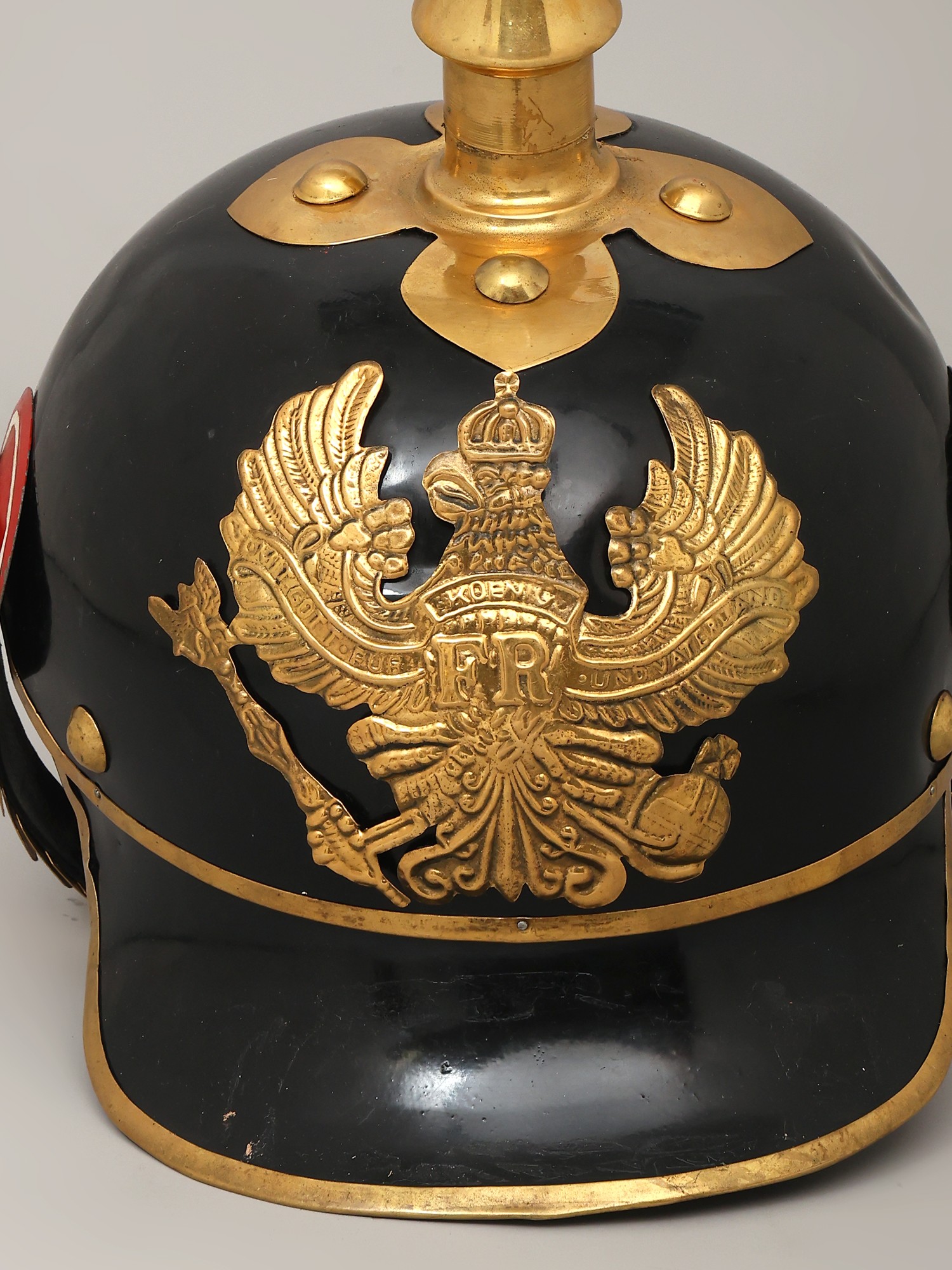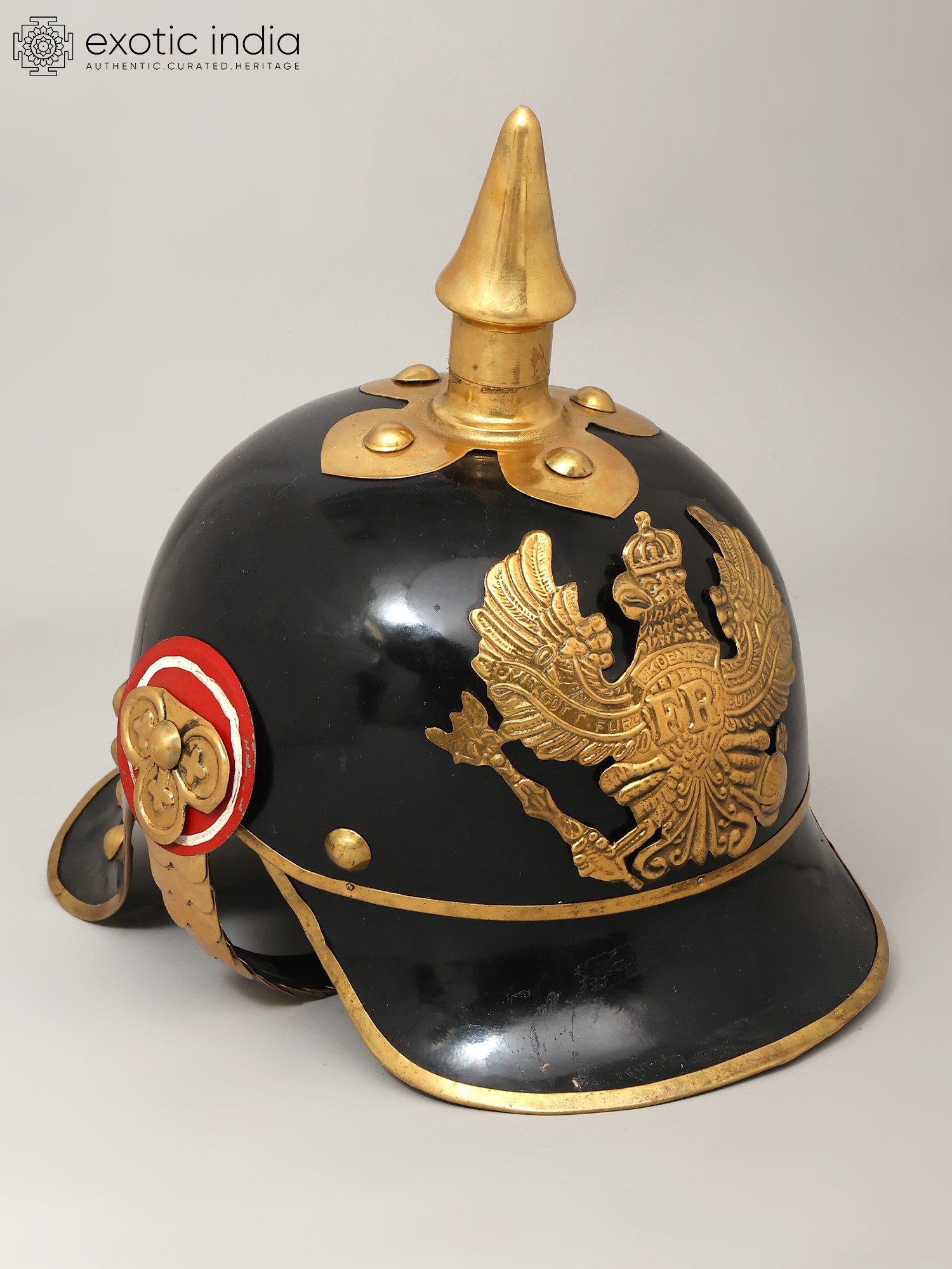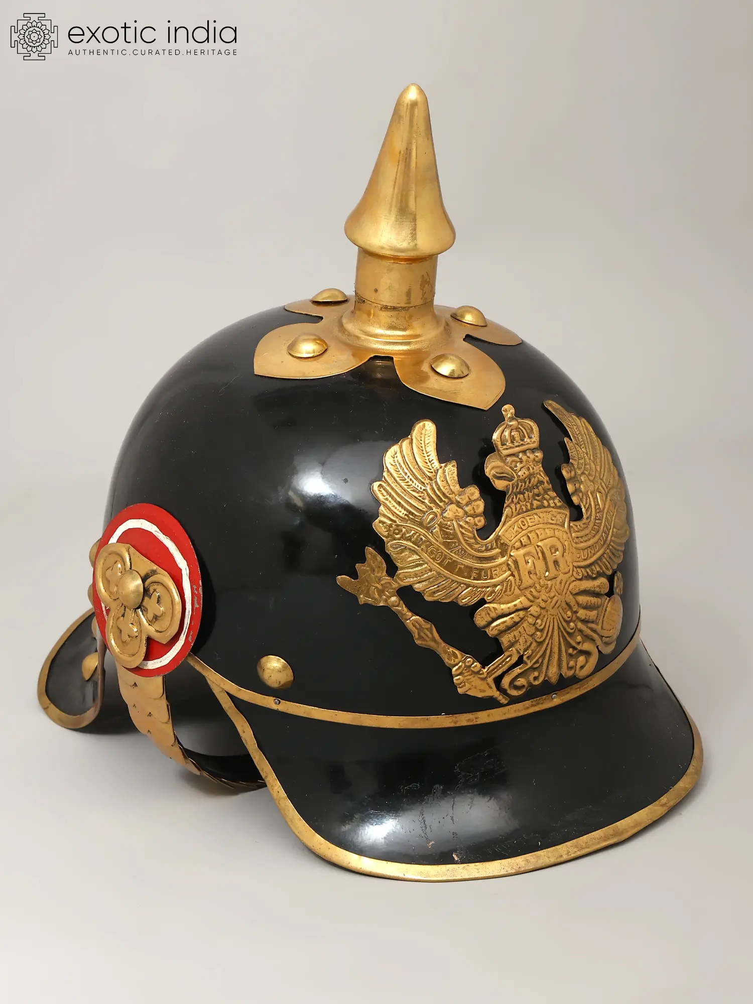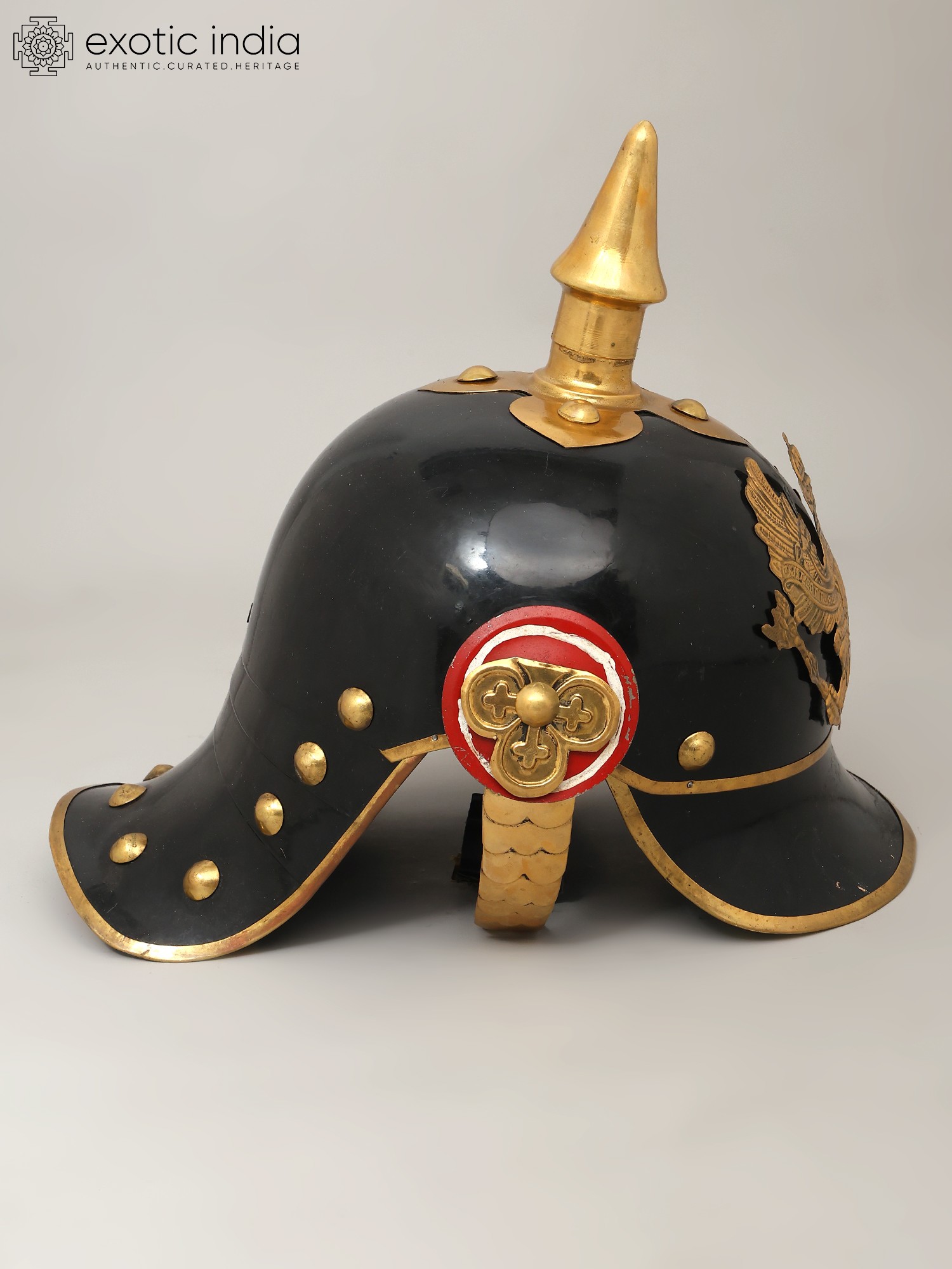 Add a striking and historically-inspired accent to your home or office with this meticulously crafted piece. This impressive decorative item captures the essence of a bygone era, bringing a sense of strength and regal authority to any space. The piece is a perfect addition for those who appreciate historical artifacts, military history, or simply seeking a bold and unique decorative element. Crafted with careful attention to detail, it reflects the iconic design of a classic military helmet. The smooth, dark finish of the main body is accentuated by intricate metallic embellishments, creating a visually captivating contrast. The metallic highlights showcase a rich, golden hue, adding a touch of opulence and historical authenticity.