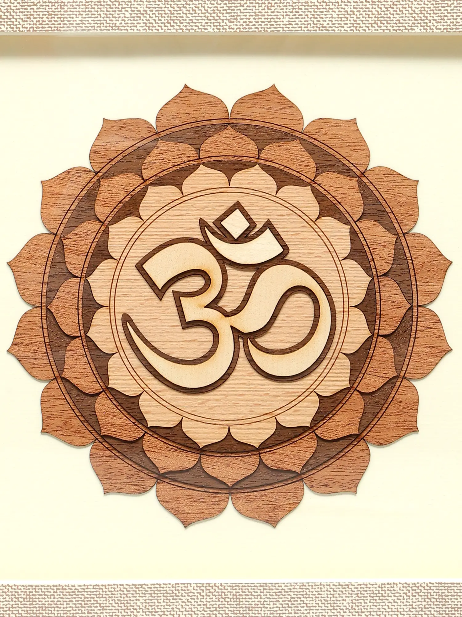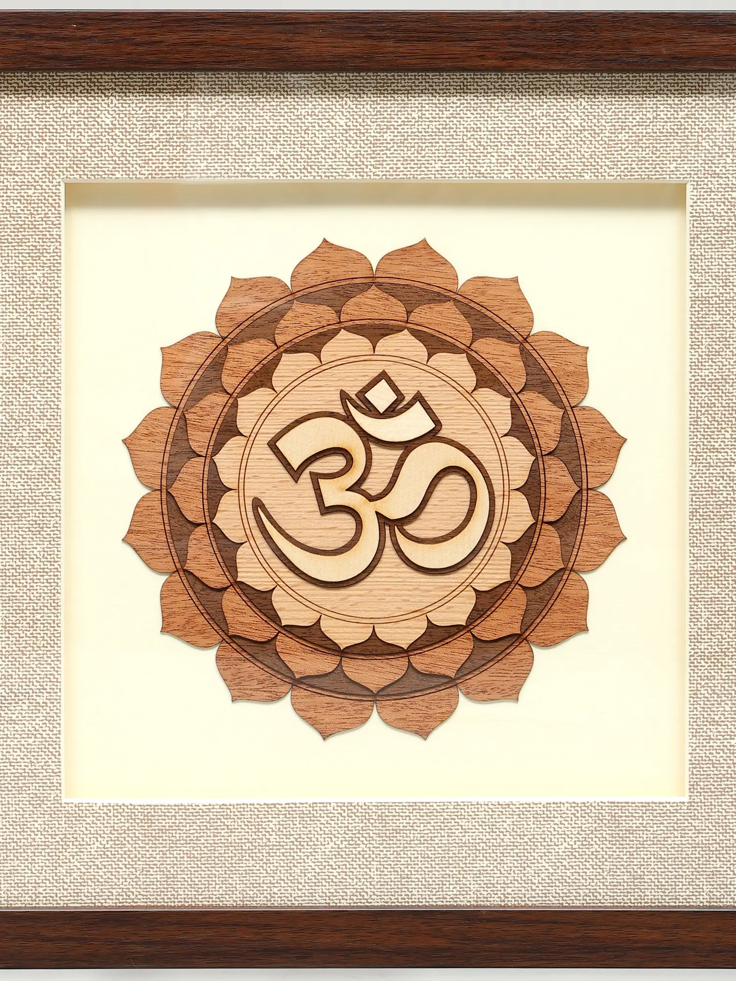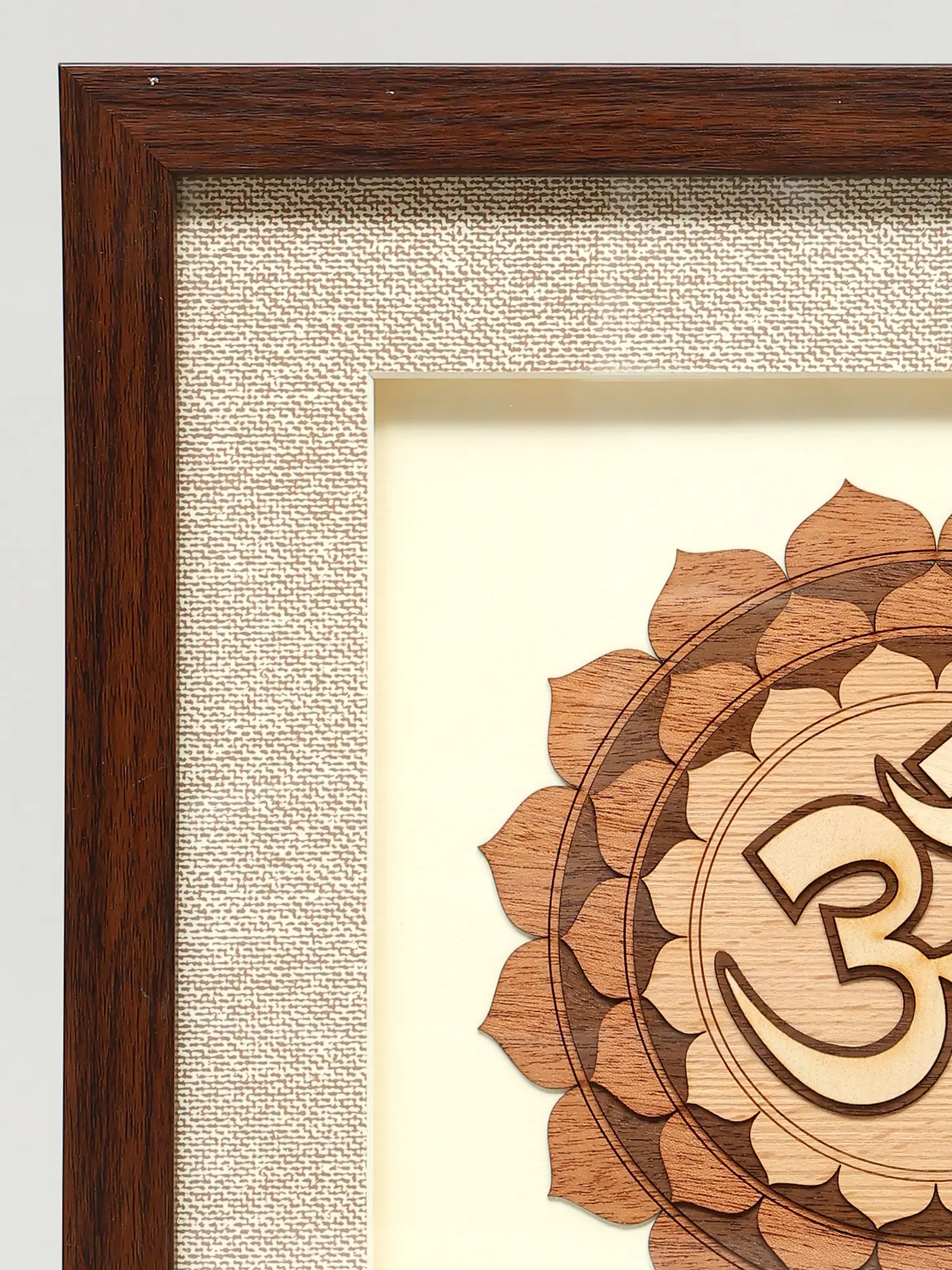 This piece is more than just a decorative item; it is a testament to the artistry of wood carving. The Om symbol is delicately rendered, surrounded by a stylized lotus flower, a symbol of purity, enlightenment, and rebirth. The contrast between the lighter wood of the Om symbol itself and the slightly darker hues of the surrounding lotus petals creates a subtle depth and dimension. The design is further enhanced by its placement within a neutral-toned, textured inner border and an elegant, dark-stained wooden frame, providing a sophisticated and timeless appeal. The texture of the border adds another layer of intricacy, elevating the overall aesthetic and ensuring it seamlessly blends with a variety of interior styles, from modern minimalist to traditionally ornate.