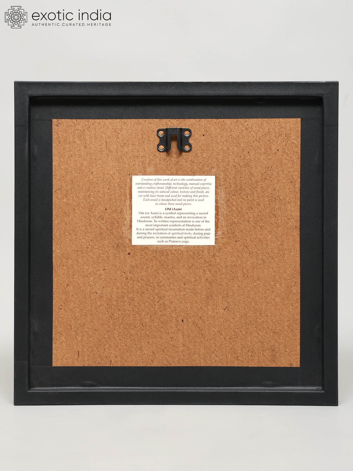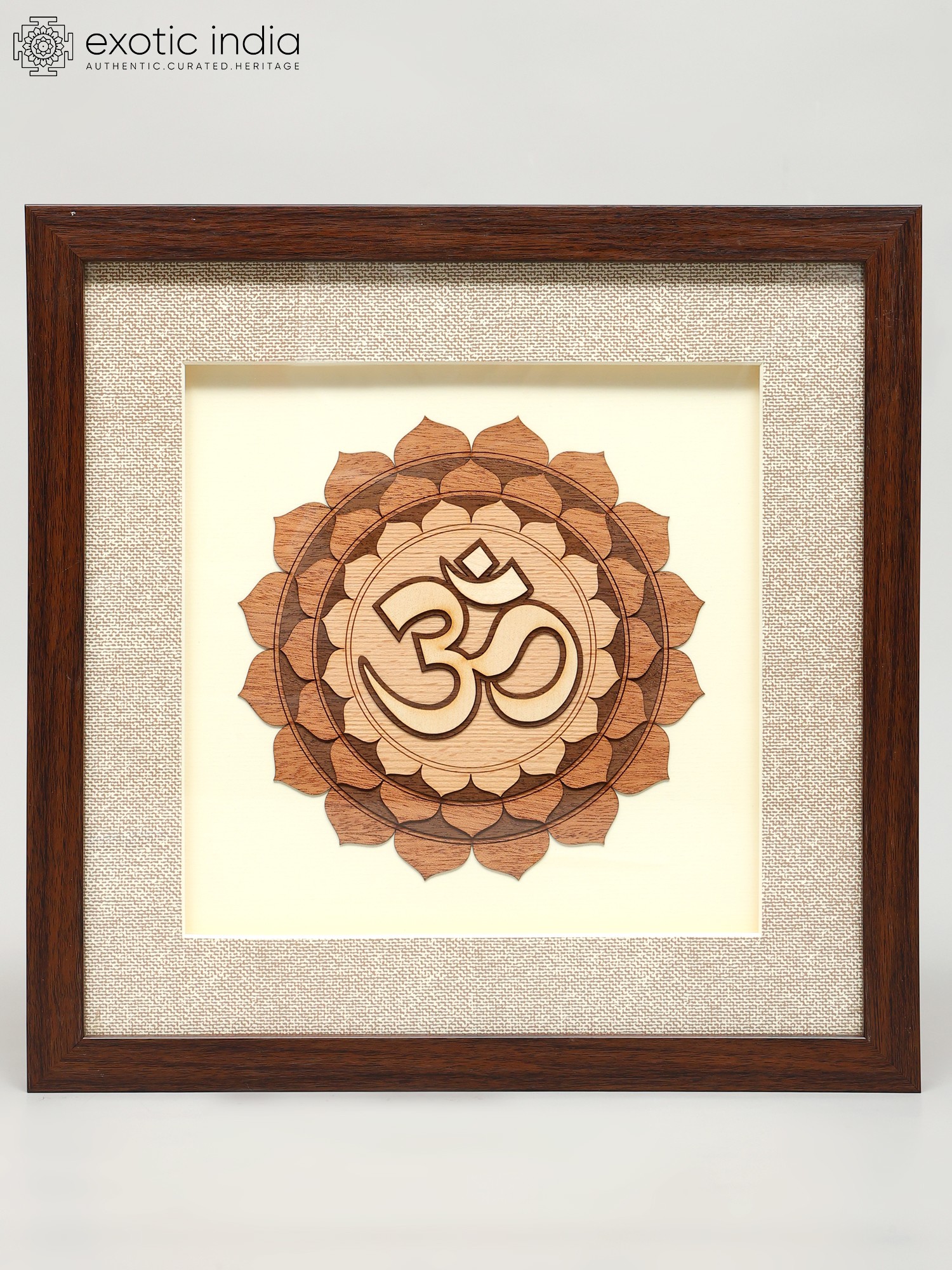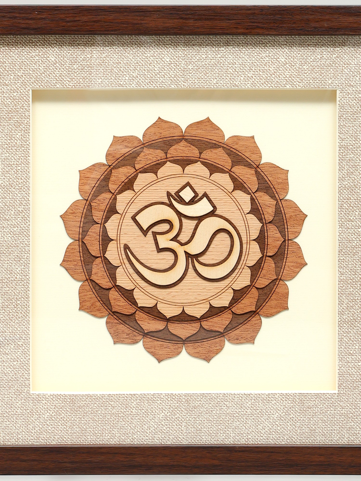 This piece is more than just a decorative item; it is a testament to the artistry of wood carving. The Om symbol is delicately rendered, surrounded by a stylized lotus flower, a symbol of purity, enlightenment, and rebirth. The contrast between the lighter wood of the Om symbol itself and the slightly darker hues of the surrounding lotus petals creates a subtle depth and dimension. The design is further enhanced by its placement within a neutral-toned, textured inner border and an elegant, dark-stained wooden frame, providing a sophisticated and timeless appeal. The texture of the border adds another layer of intricacy, elevating the overall aesthetic and ensuring it seamlessly blends with a variety of interior styles, from modern minimalist to traditionally ornate.
