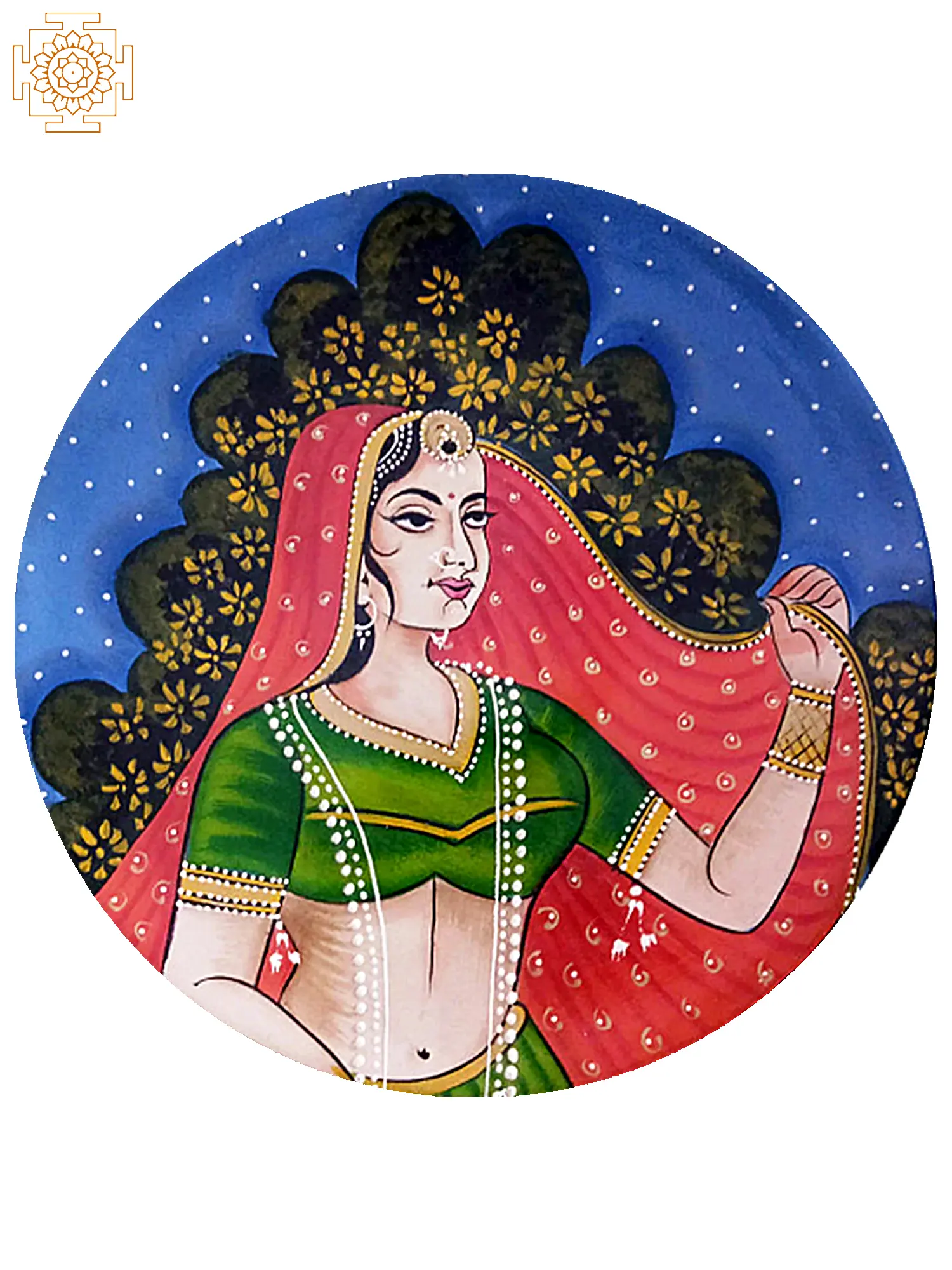 Not just a mere decoration, this work of art serves as a window to a majestic era, sparking conversations and admiration, capturing the essence of royalty and tradition. Embellished in vivid shades of lehenga choli and adorned with rich ornaments, the royal lady depicted in this artwork radiates grace and beauty. Performing the gesture of “Pardah,” She symbolises dignity and respect. Hang this wooden masterpiece in your home to infuse your space with regal charm and cultural richness. Enrich your decor and immerse yourself in the allure of Rajasthan’s heritage.