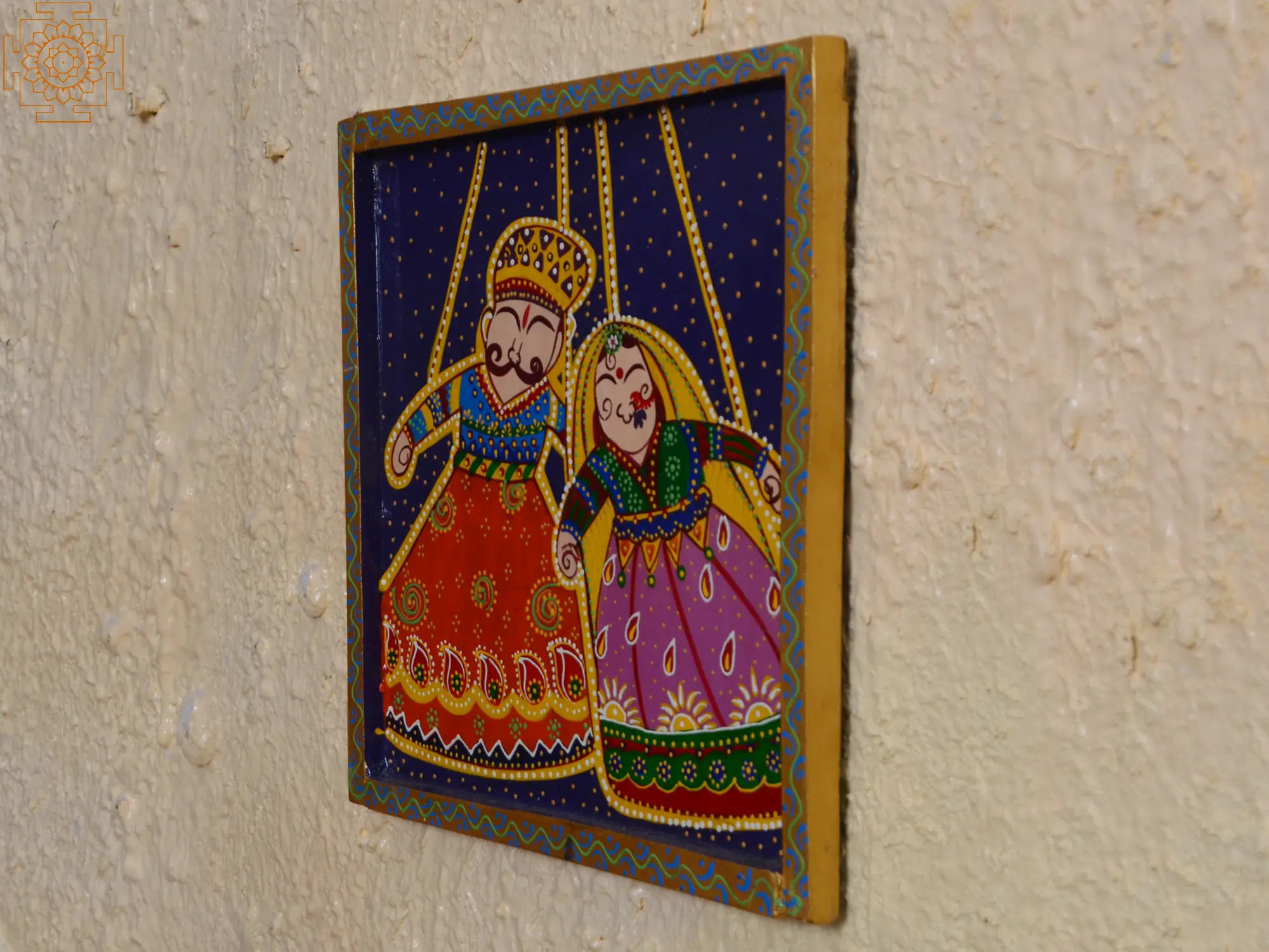 This artwork, created with precision, displays a traditional couple, a Rajasthani man and woman, as puppets (Kathputli) emerging as hand-painted marvels on a wooden canvas, transforming art into an enthralling tale. Kathputli is a string puppet theater that originated in Rajasthan, India, and is the most popular type of Indian puppetry.