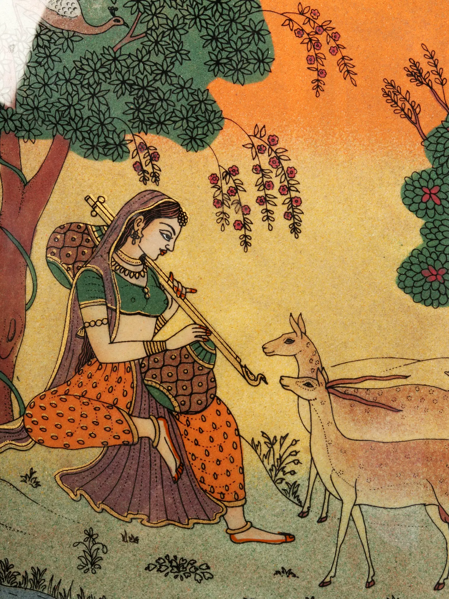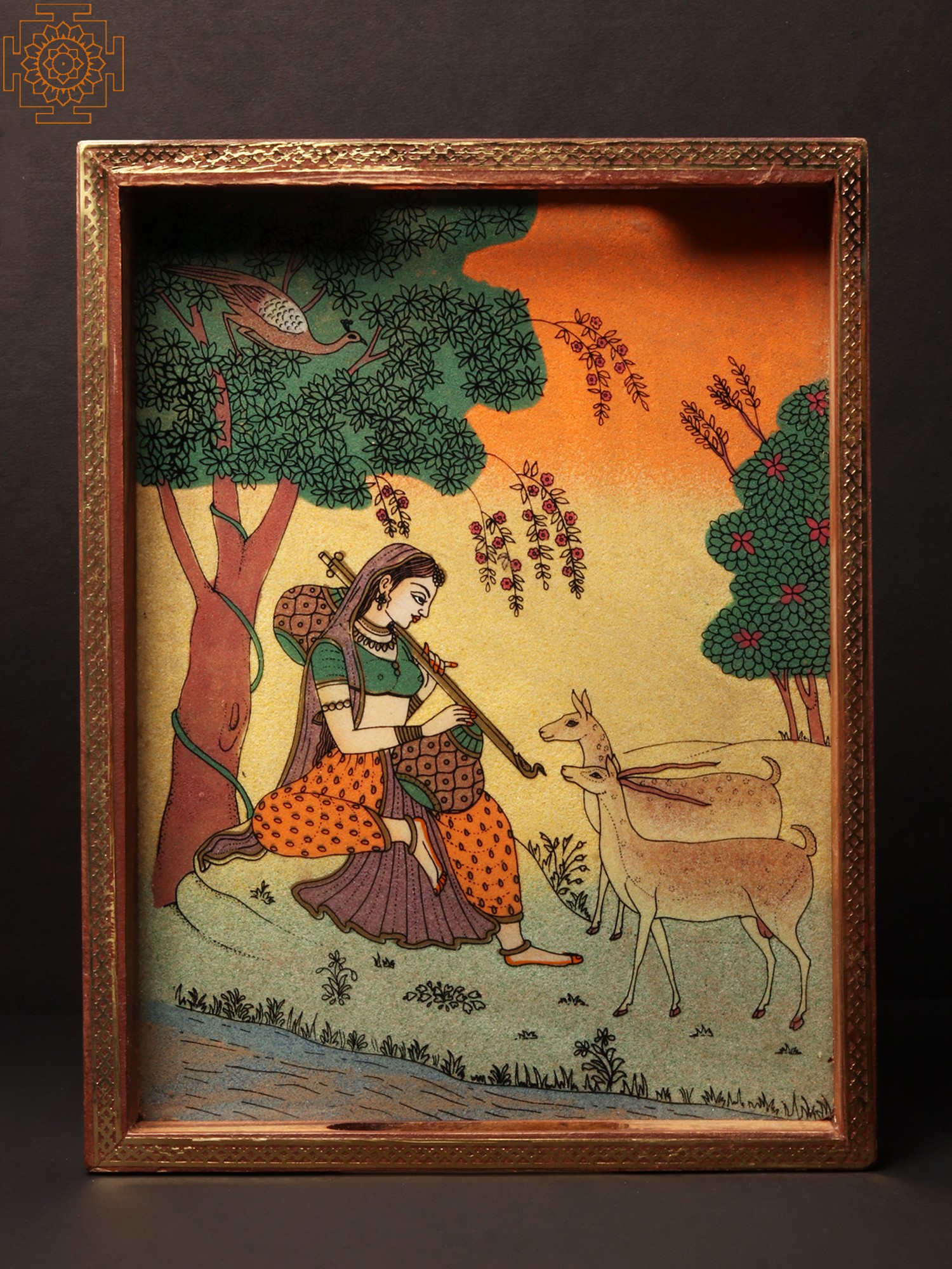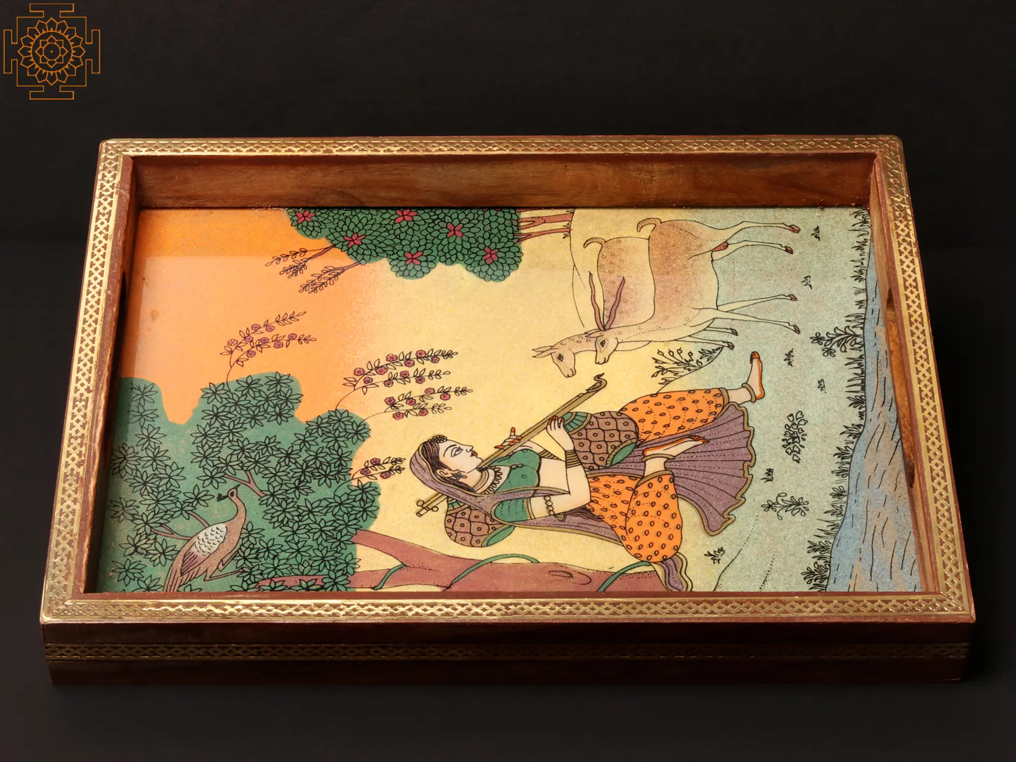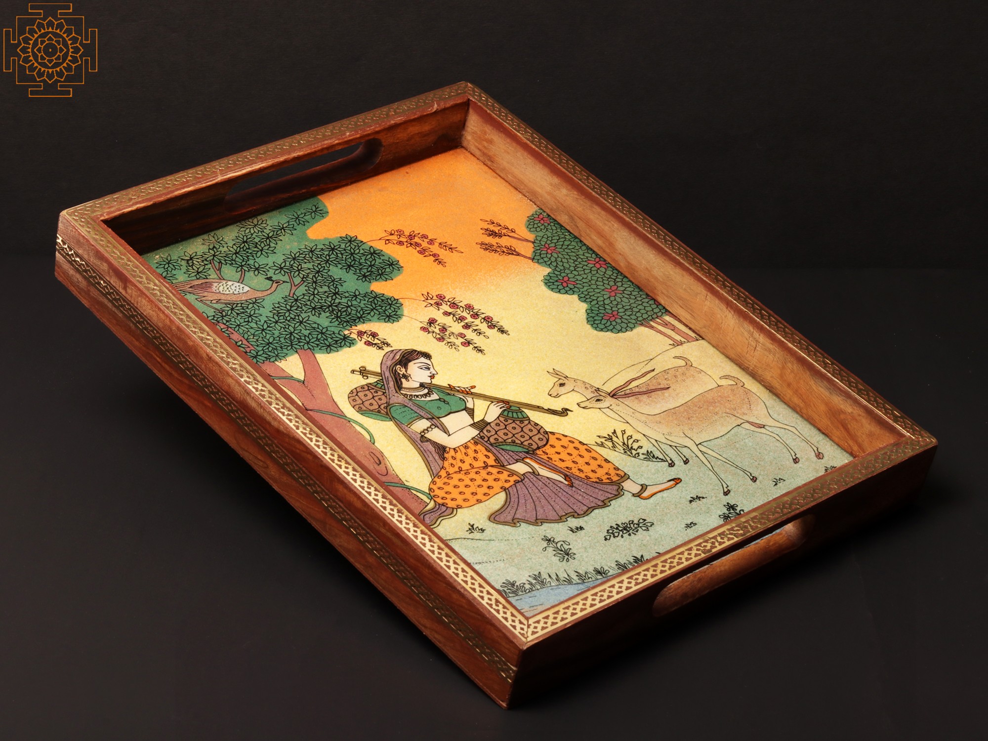 Elevate your serving experience with this exquisite wooden tray, a testament to the rich artistic heritage of the Mughal era. Crafted from fine wood, its sturdy construction ensures durability, while the intricate painting adorning its surface transports you to a scene of pastoral serenity. The artwork depicts a graceful figure, perhaps a princess or a muse, lost in the melody of her flute, surrounded by lush foliage and gentle deer. The vibrant hues and delicate brushstrokes capture the essence of traditional Indian miniature paintings, adding a touch of timeless beauty to any occasion.
