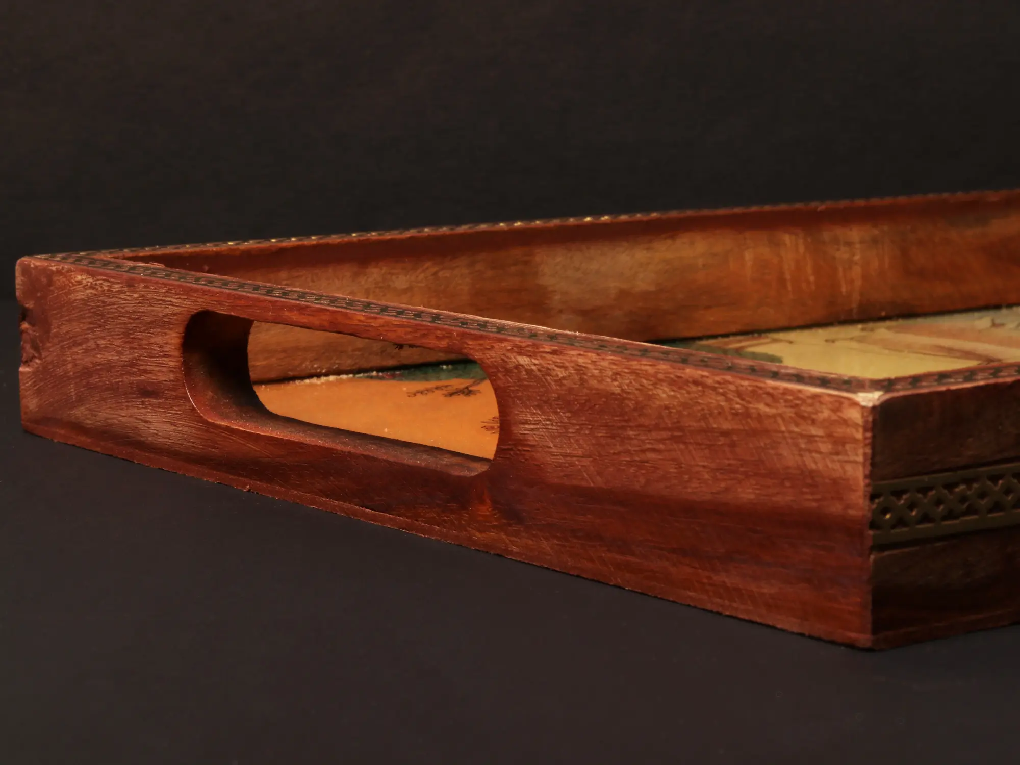 Beyond its captivating aesthetics, this tray is designed with practicality in mind. The generous surface area provides ample space for serving drinks, snacks, or even a light meal. The smooth, polished wood is easy to clean, making it a hassle-free addition to your kitchenware collection. Integrated handles on either side offer a comfortable and secure grip, allowing for effortless carrying. The subtly decorative brass inlay along the edges adds a touch of sophistication and protects the wood from wear and tear, ensuring this piece remains a cherished item for years to come.