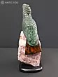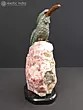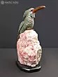 Every detail of this piece reflects meticulous hand carving and careful selection of materials. The woodpecker itself is brought to life through the detailed carving of gemstone. The smooth, cool touch of the stone contrasts beautifully with the raw, textured presence of the natural stone that forms the base. The artisans have paid close attention to anatomical details, capturing the characteristic features of the bird. Note the precision in carving the features of the bird and the way it balances on the natural formation. This attention to detail elevates the sculpture from a mere decorative object to a true work of art.
