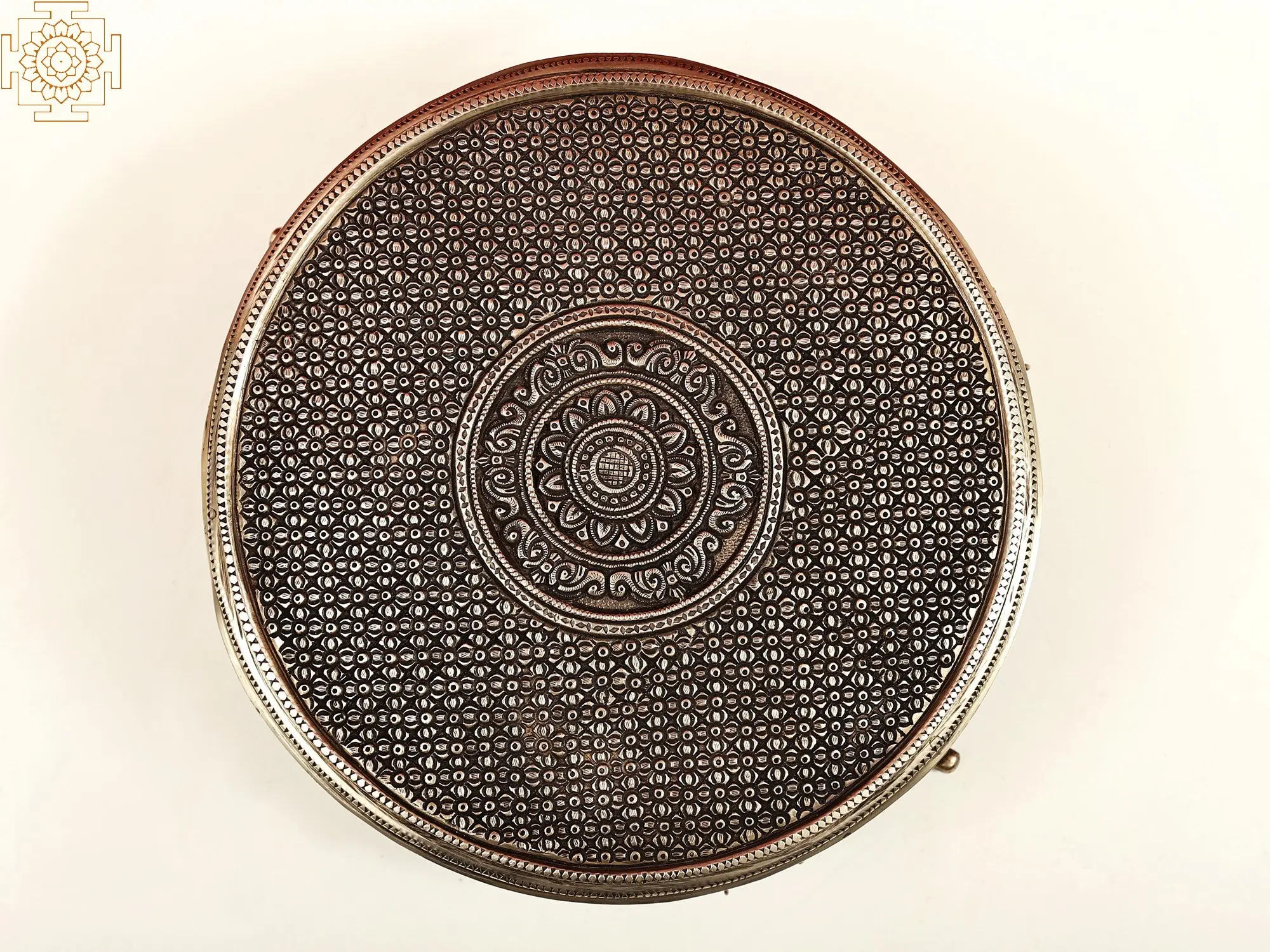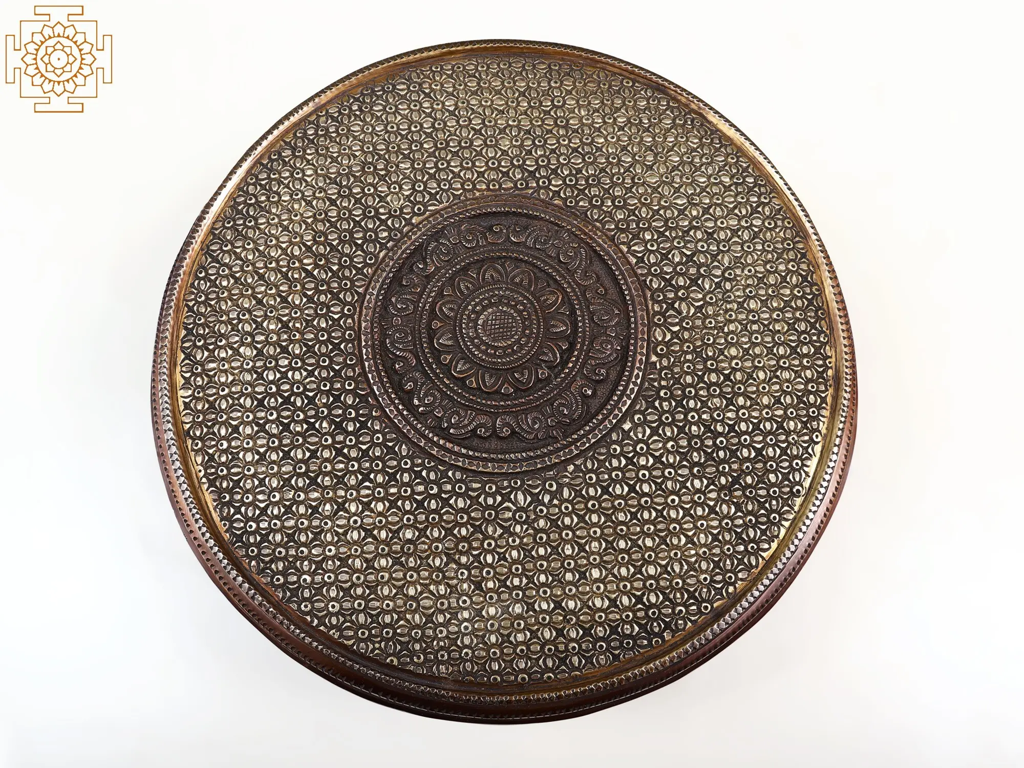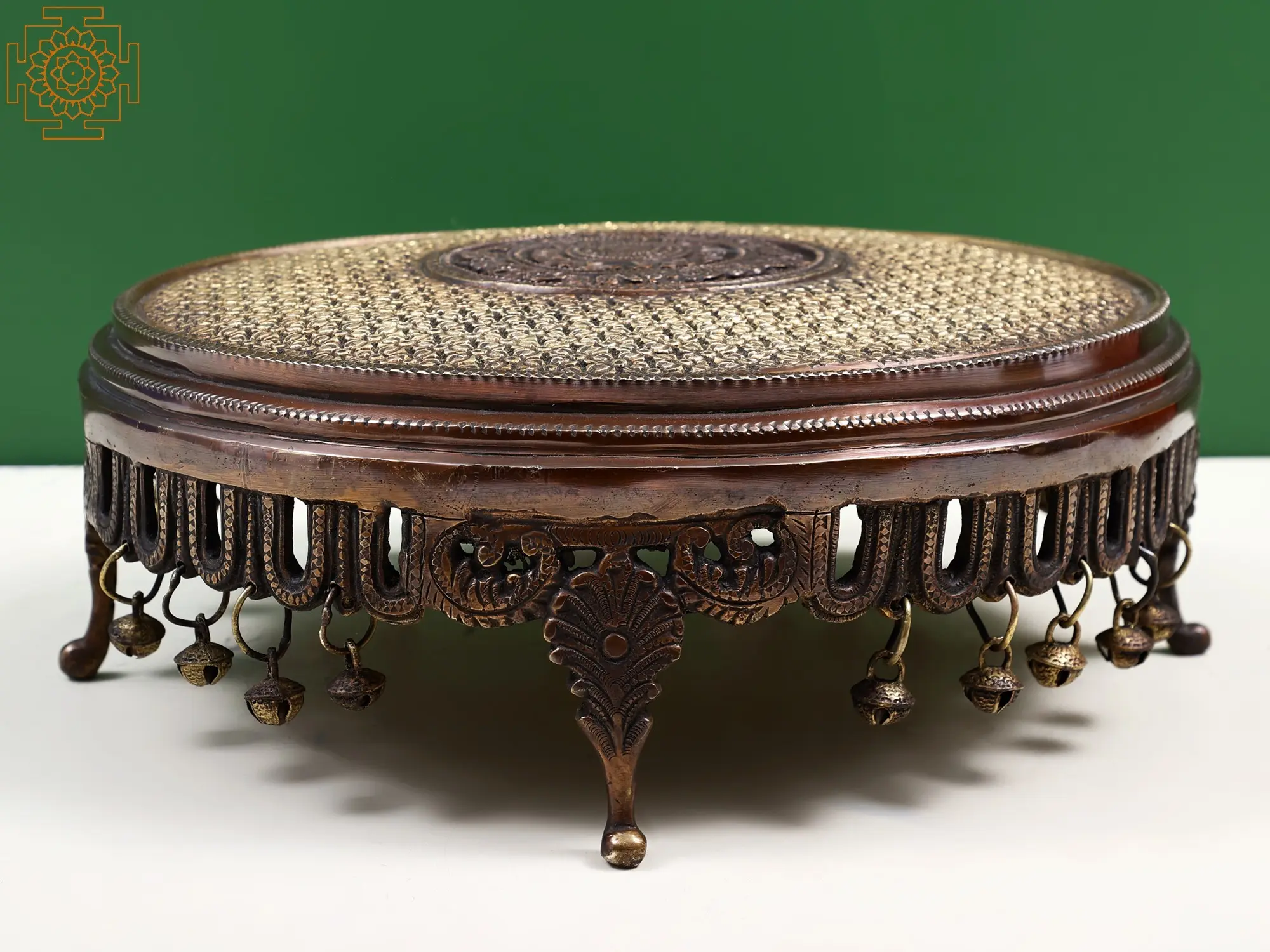 This magnificent Pedestal (Chowki), adorned with intricate blossoms and delicate bells, emerges as a symphony of nature and artistry. Crafted in brass with meticulous precision, it transcends mere aesthetics, serving as a vessel for ceremonial significance. This enchanting chowki becomes a sacred space, a tangible poetry of devotion and celebration. Each petal, a whisper of enchanting elegance, and every bell, a melodious echo of devotion. As a versatile emblem, it finds purpose in spiritual rituals, meditative practices, or as a centrepiece in festive occasions. Symbolising the unity of beauty and spirituality, this artwork becomes a harmonious tapestry of reverence and grace.