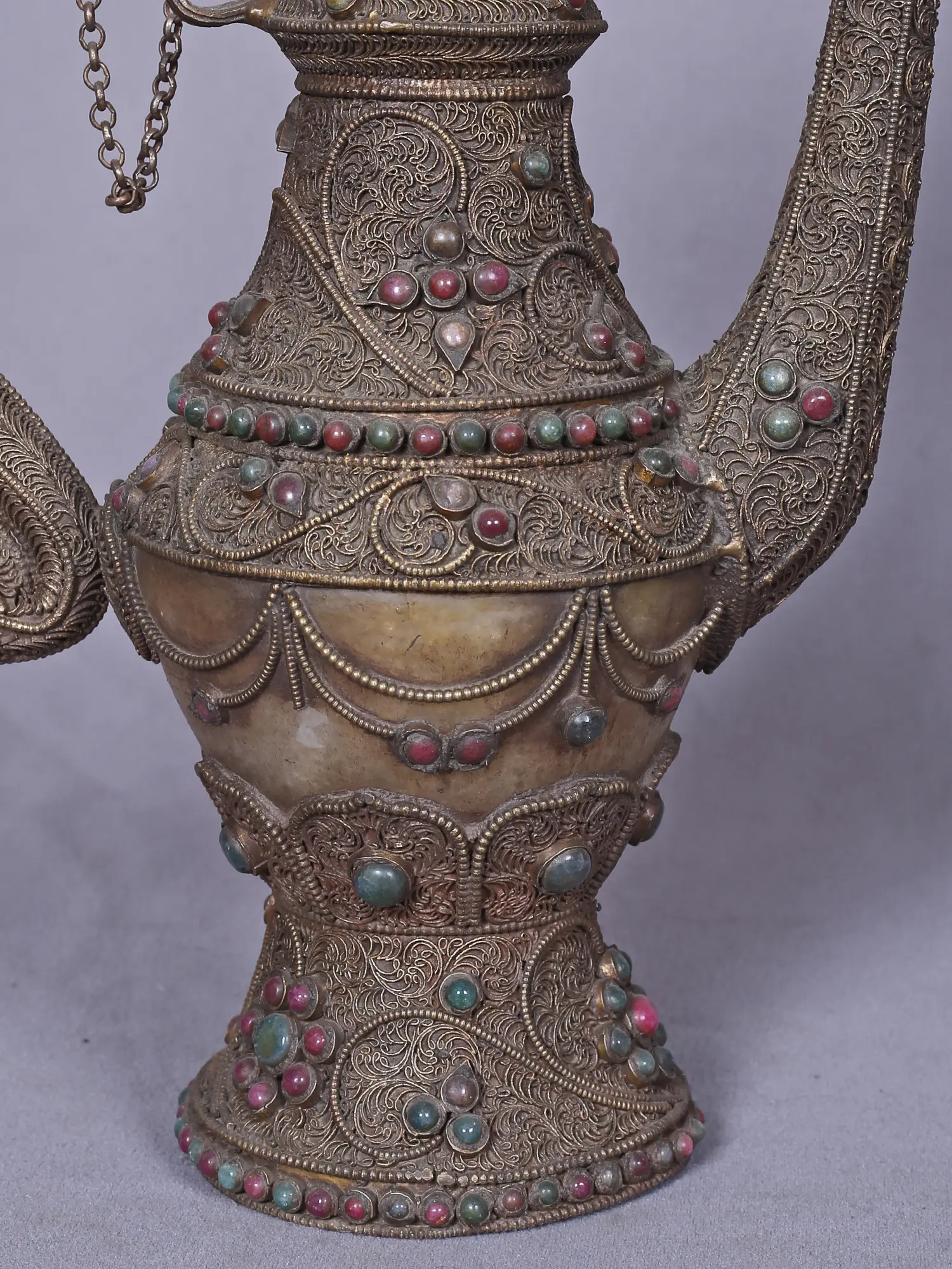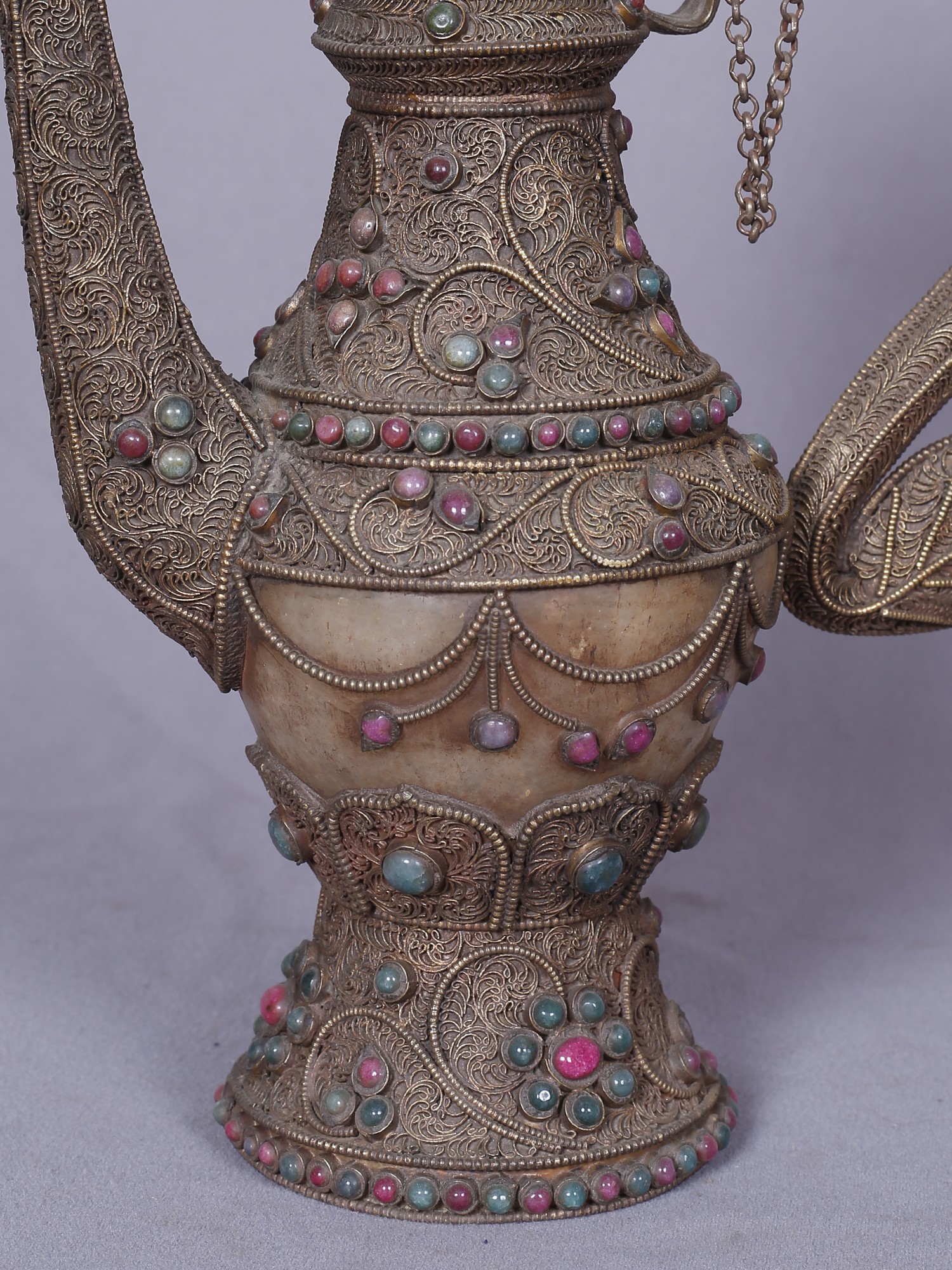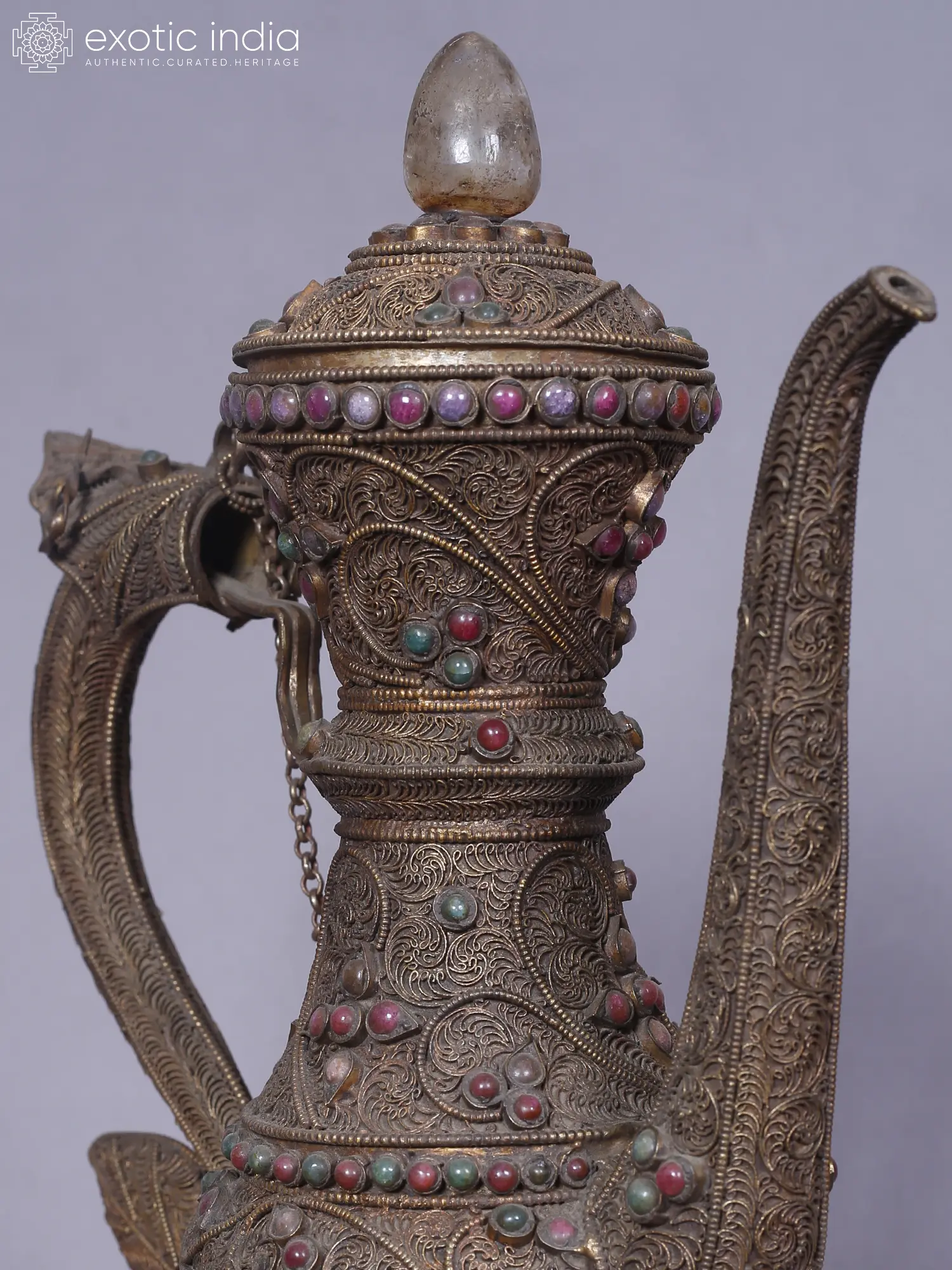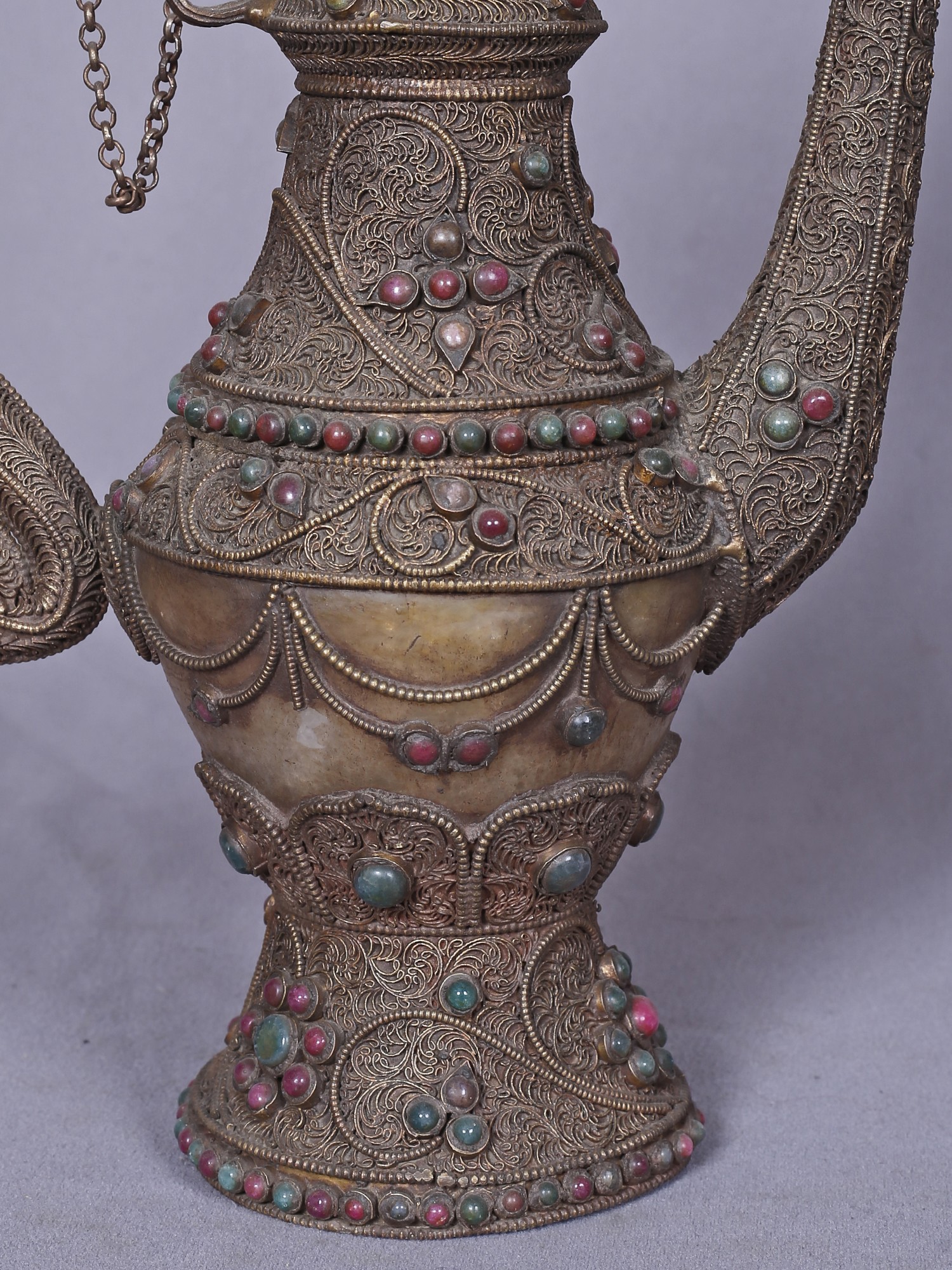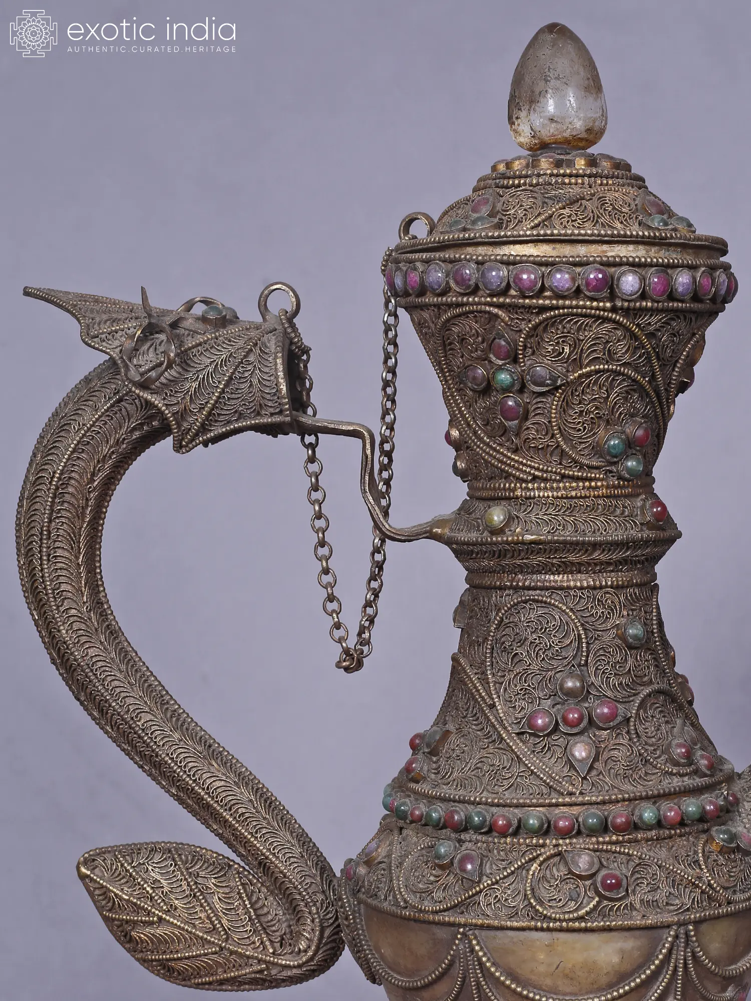 The Surahi's surface is adorned with an intricate network of filigree work, a testament to the patience and skill of the artisan. The delicate patterns flow seamlessly across the body of the piece, creating a visually arresting tapestry of light and shadow. This intricate metalwork is further enhanced by the vibrant inlay of precious and semi-precious gemstones. These meticulously placed gems—ruby, emerald, and other multicolored stones—catch the light, adding depth and dimension to the already stunning design. Each gemstone contributes to the rich visual texture and exquisite beauty of this impressive piece. The careful placement of these stones demonstrates the dedication to quality and craftsmanship behind this remarkable artifact.