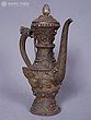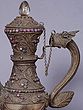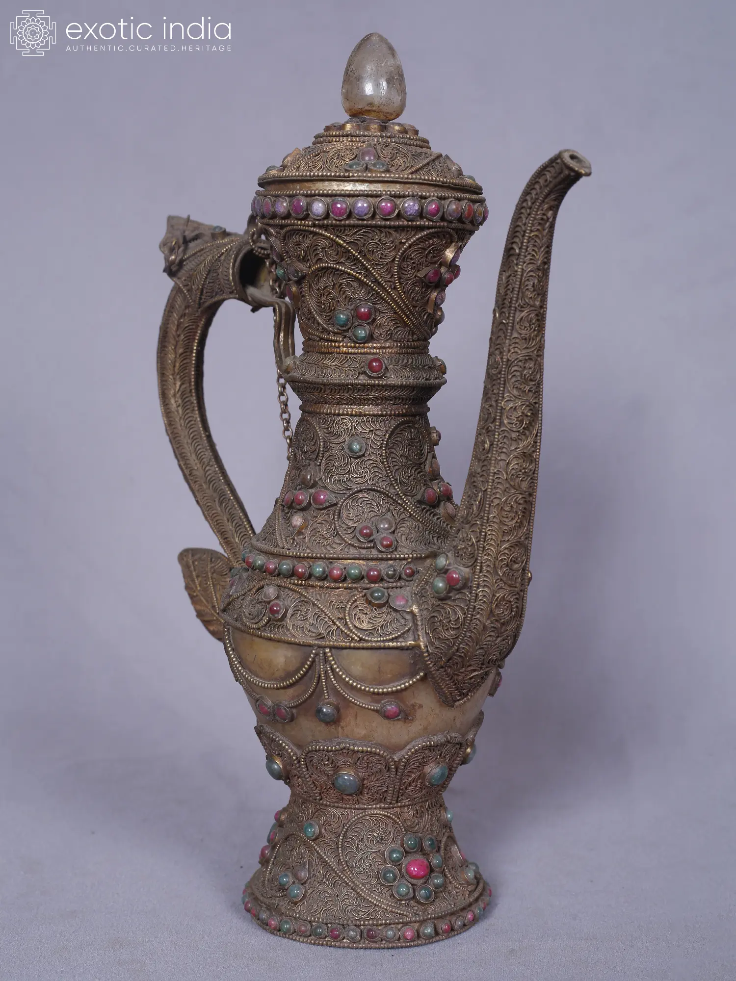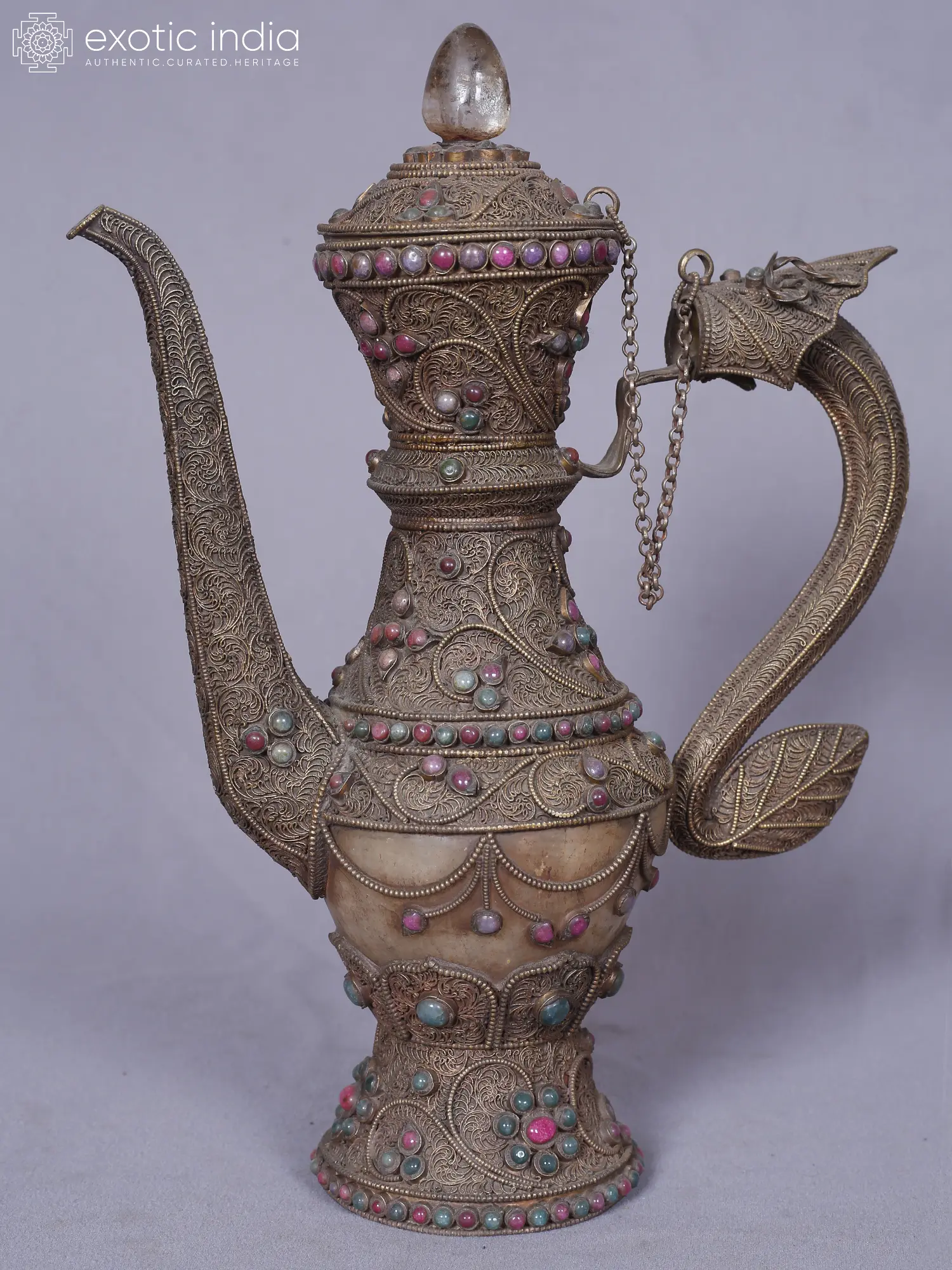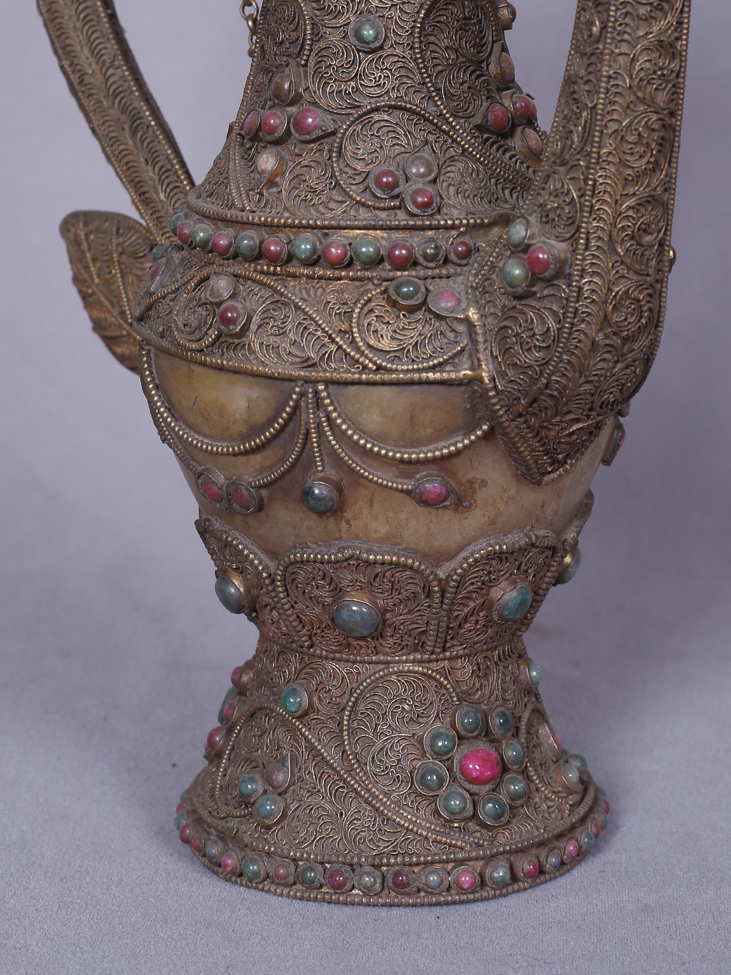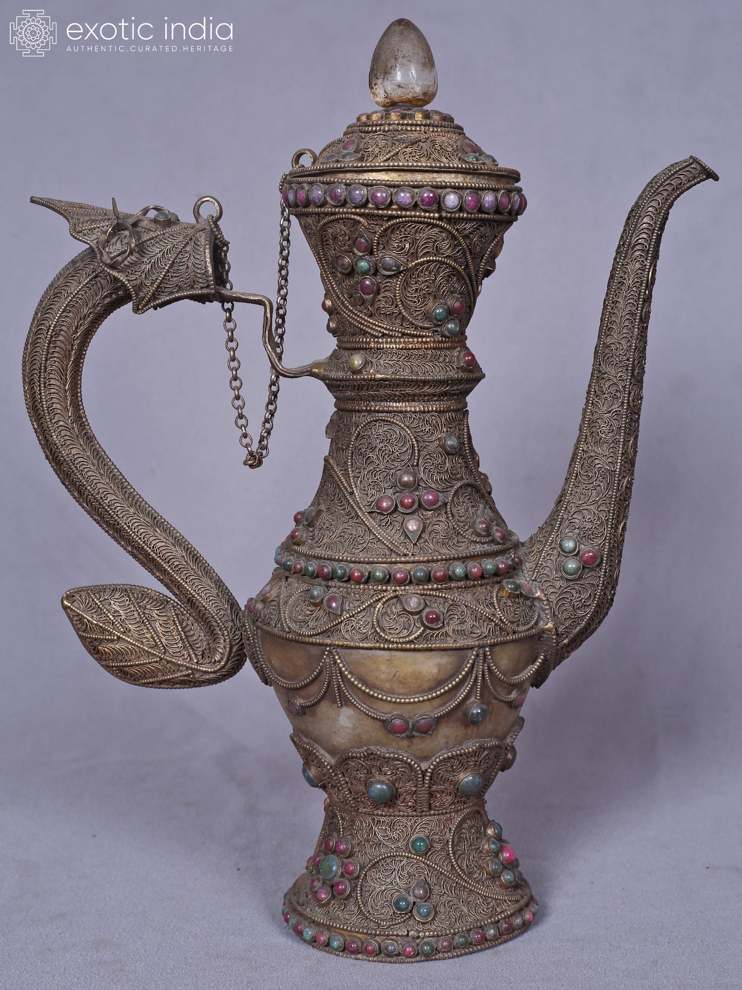 The Surahi's surface is adorned with an intricate network of filigree work, a testament to the patience and skill of the artisan. The delicate patterns flow seamlessly across the body of the piece, creating a visually arresting tapestry of light and shadow. This intricate metalwork is further enhanced by the vibrant inlay of precious and semi-precious gemstones. These meticulously placed gems—ruby, emerald, and other multicolored stones—catch the light, adding depth and dimension to the already stunning design. Each gemstone contributes to the rich visual texture and exquisite beauty of this impressive piece. The careful placement of these stones demonstrates the dedication to quality and craftsmanship behind this remarkable artifact.