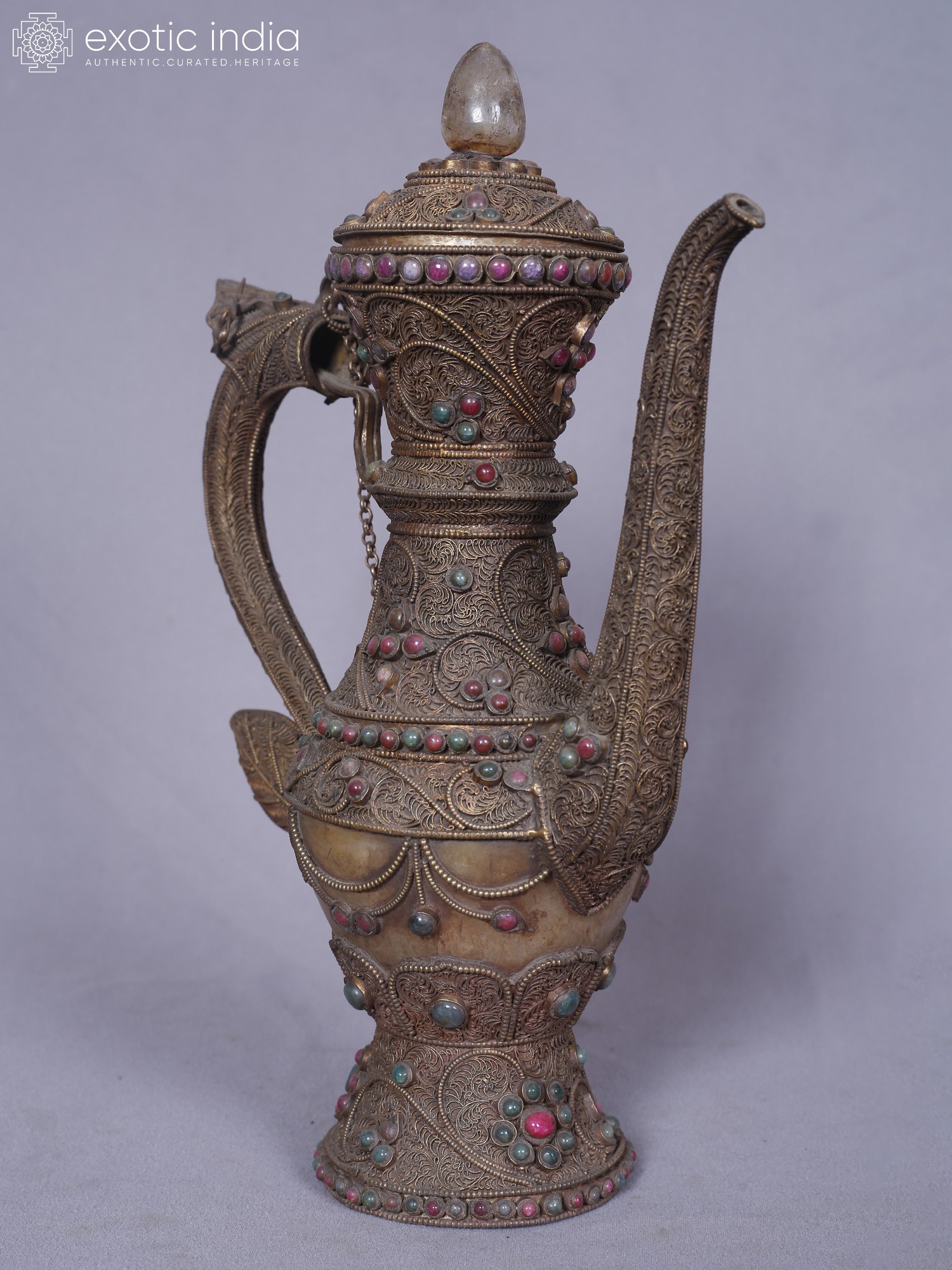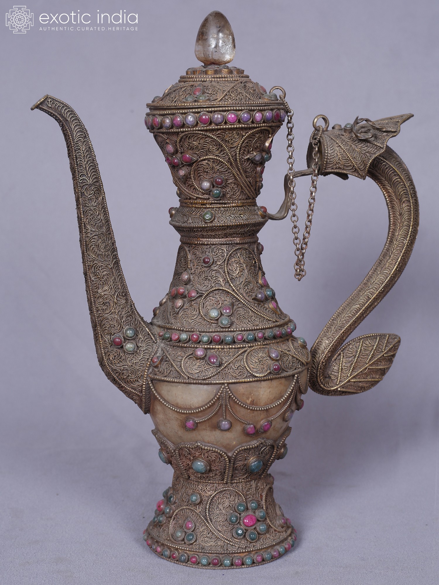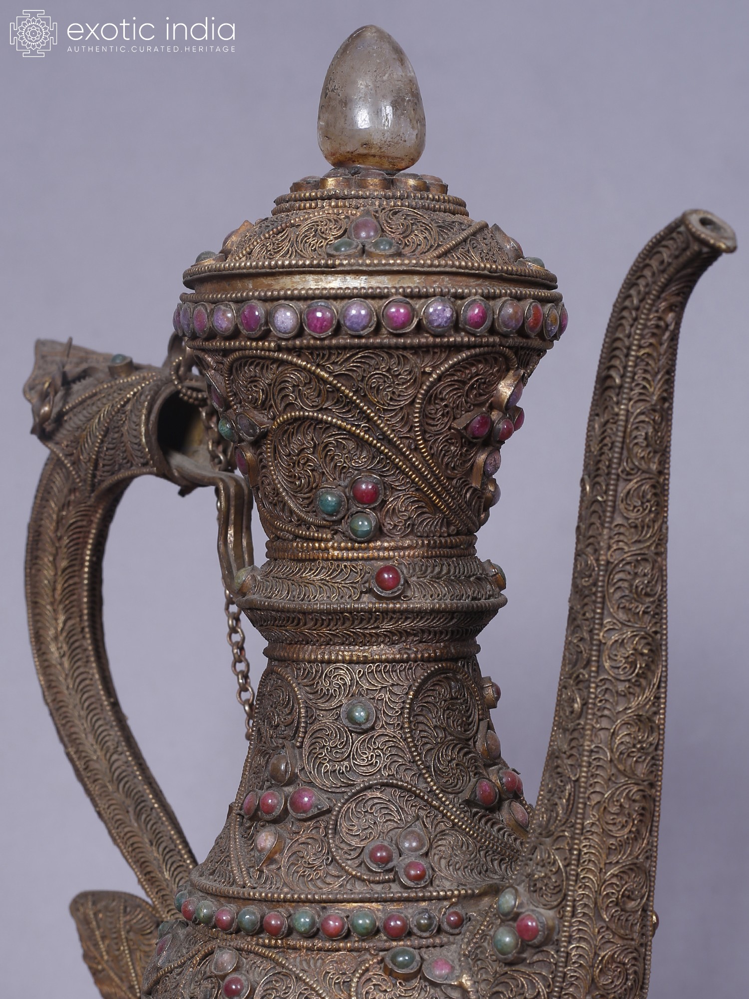 Behold this exquisite 13-inch copper gold-plated Surahi, a testament to the rich heritage of Indian artistry. This stunning piece is not merely a functional vessel; it's a work of art that elevates any space. The intricate detailing and luxurious materials combine to create a truly captivating home decorative item, perfect for adding a touch of regal elegance to your kitchen or dining area. The gracefully curved spout, fashioned in the shape of a dragon’s head, adds a mythical touch, while the meticulously inlaid gemstones shimmer with an enchanting allure. This Surahi is more than just a decorative piece; it’s a conversation starter, a piece of history, and a stunning display of skill.