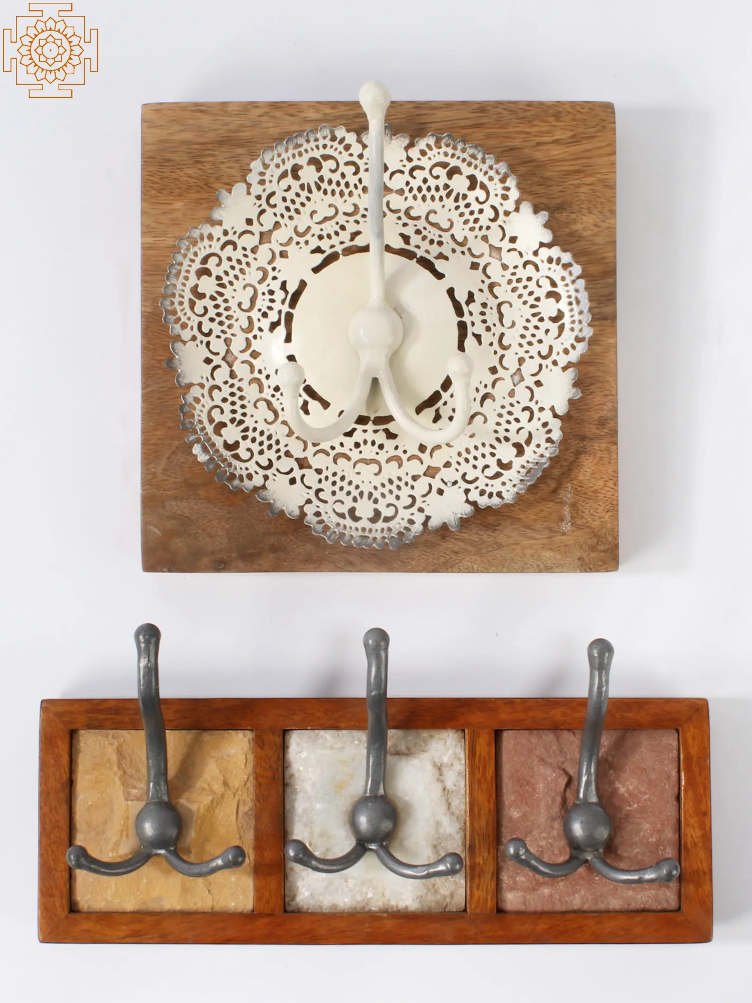The set features two distinct styles, each showcasing a different facet of artisanal craftsmanship. The first piece is a testament to delicate detail, featuring a natural wood backing that highlights the wood's inherent grain and warmth. Mounted upon this rustic base is an intricately cutwork metal piece, reminiscent of a beautiful doily, which serves as a charming backdrop for a cluster of three elegantly curved iron hooks. The combination of the earthy wood and the lacy metalwork creates a piece that is both sturdy and visually captivating, perfect for hanging keys, lightweight scarves, or decorative accessories. The second piece in the set presents a more linear and grounded design. A rich wooden frame encloses three distinct sections, each featuring a unique natural stone insert. These stone panels, varying in earthy tones and subtle textures, provide a visually engaging backdrop for three substantial iron hooks. The hooks themselves are robust and boast a timeless, slightly curved silhouette, offering a reliable place to hang heavier items like coats, bags, or towels. The contrast between the smooth wood, the textured stone, and the solid iron creates a sophisticated and enduring statement piece.