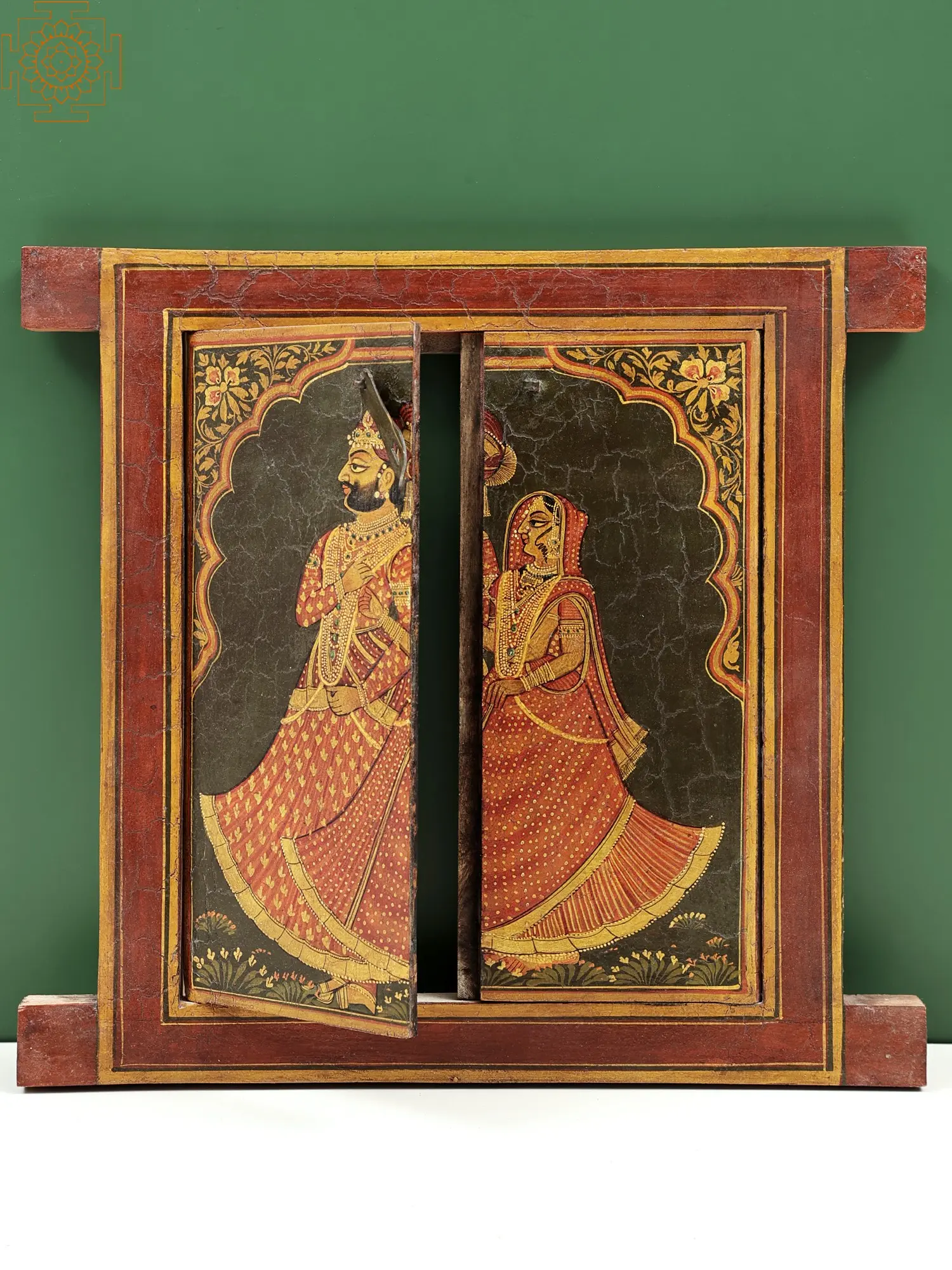 This painting depicts a happy encounter between a king and a queen in the royal garden. They are taking a stroll in the field, caught in the moment of nature's sublime, they might confess their love for each other, again. This window of King and Queen is a blend of the bold, vivid colours favoured by Indian painters. The characters are fixed, but the hues of the paintings are vibrant and full of life. The bright, jewel-like colours evoke the dazzling tones still beloved in contemporary India.