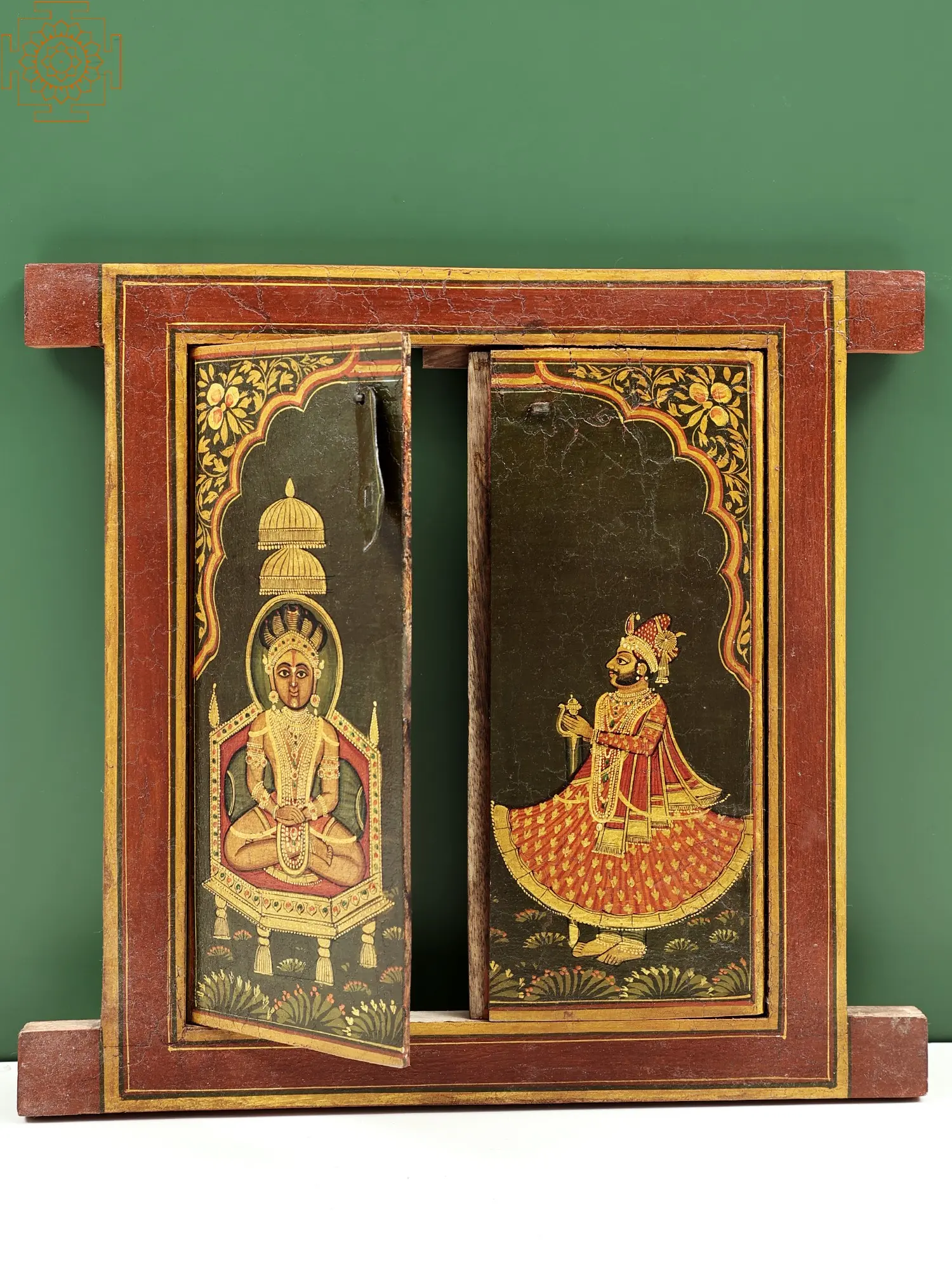 The glorious, hand-painted jharokha window of Tirthankar Parshwanath, is depicted with a snake crown on his head. Seated in Padmasana, palms placed on each other in a meditational posture on a high-raised delightful pedestal. He attired in fine lower garments highly embellished with eye-catching ornaments of gems and pearls all over his broad chest and body. An impressive devotee, dressed impressively in royal costumes and turban, is worshiping Parswanath in reverence with a sword in his hands in salutation. A real aesthetic creation to decorate your dwelling.