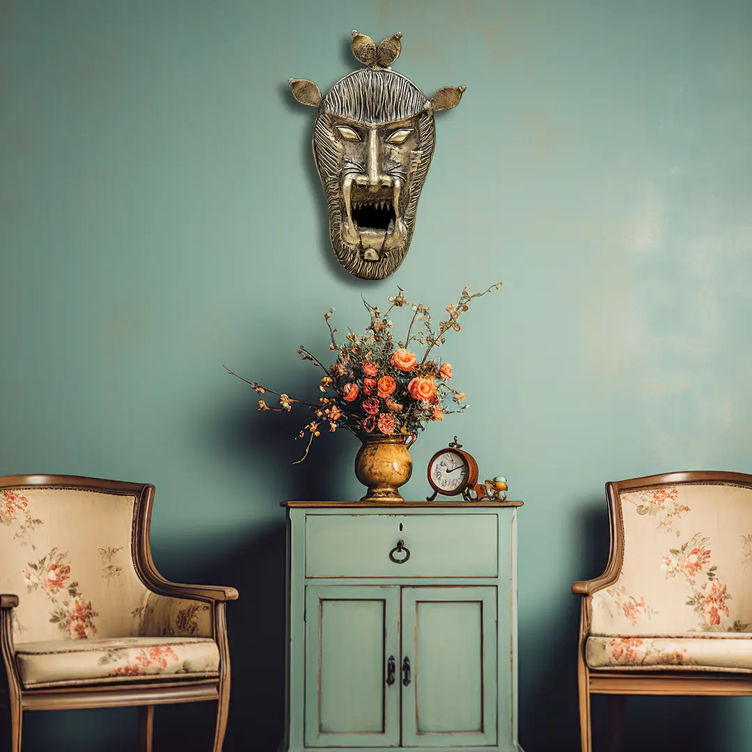 An enigmatic masterpiece, this “Tribal Face Mask”, beckons with the silent allure of ancient rituals and mystic traditions. Crafted with meticulous artistry, this mesmerising creation unveils a fearsome visage, eyes wide open, tongue lolling, and teeth bared in a haunting display.