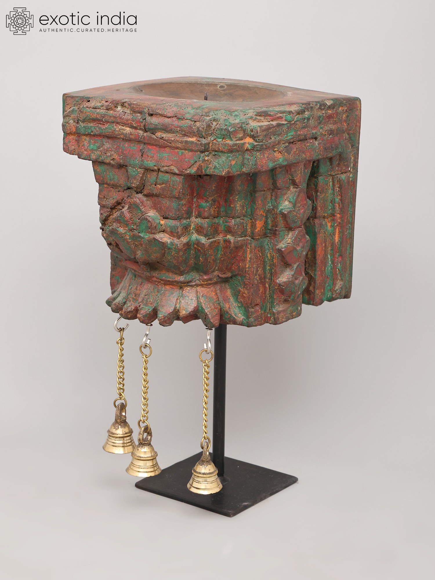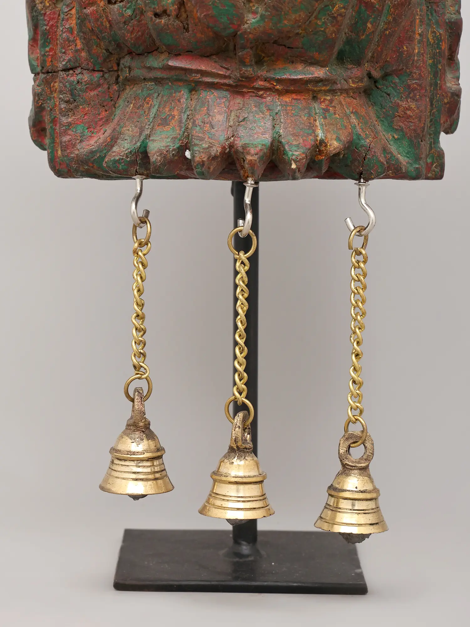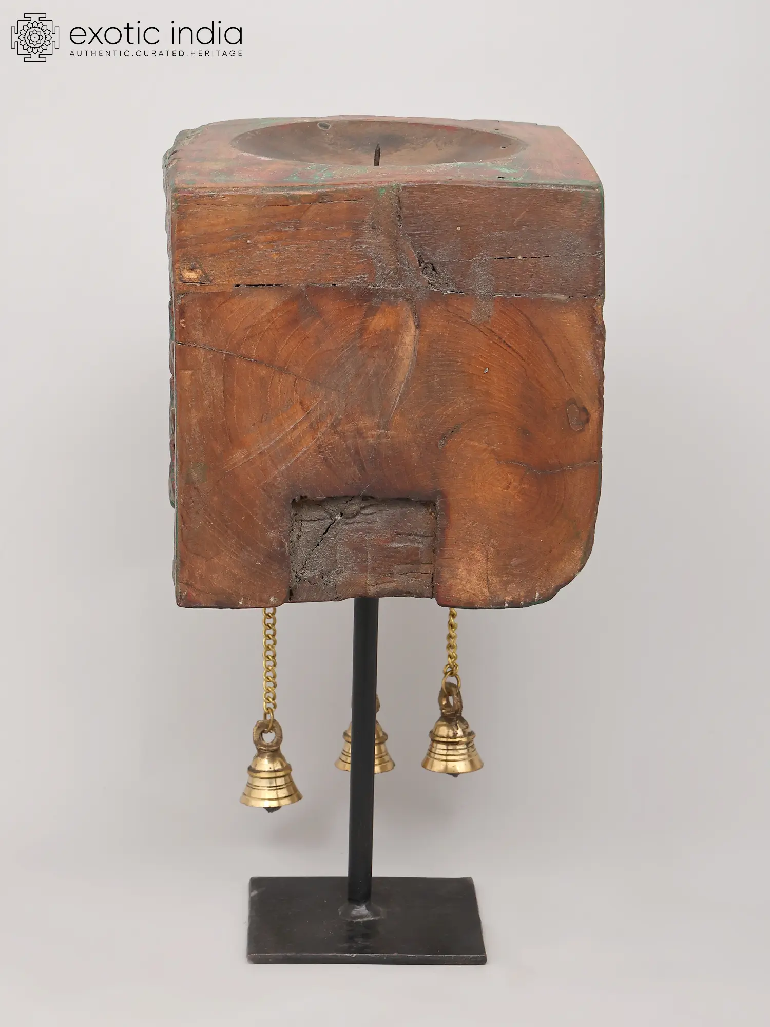 10" Wood Carved Candle Stand with Brass Bells | Home Decor