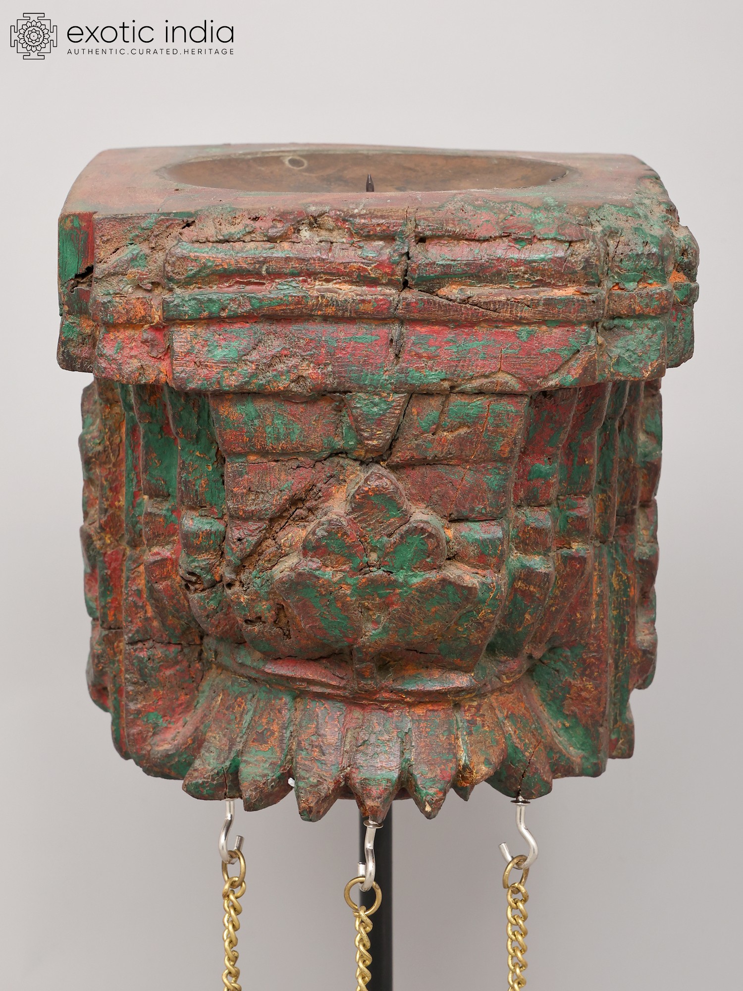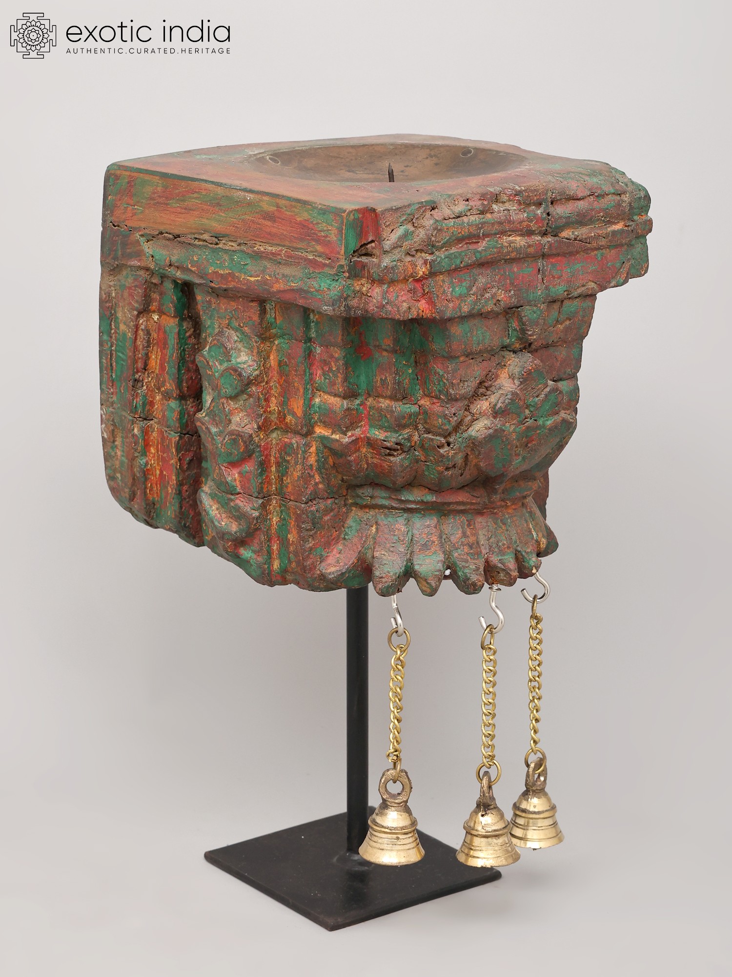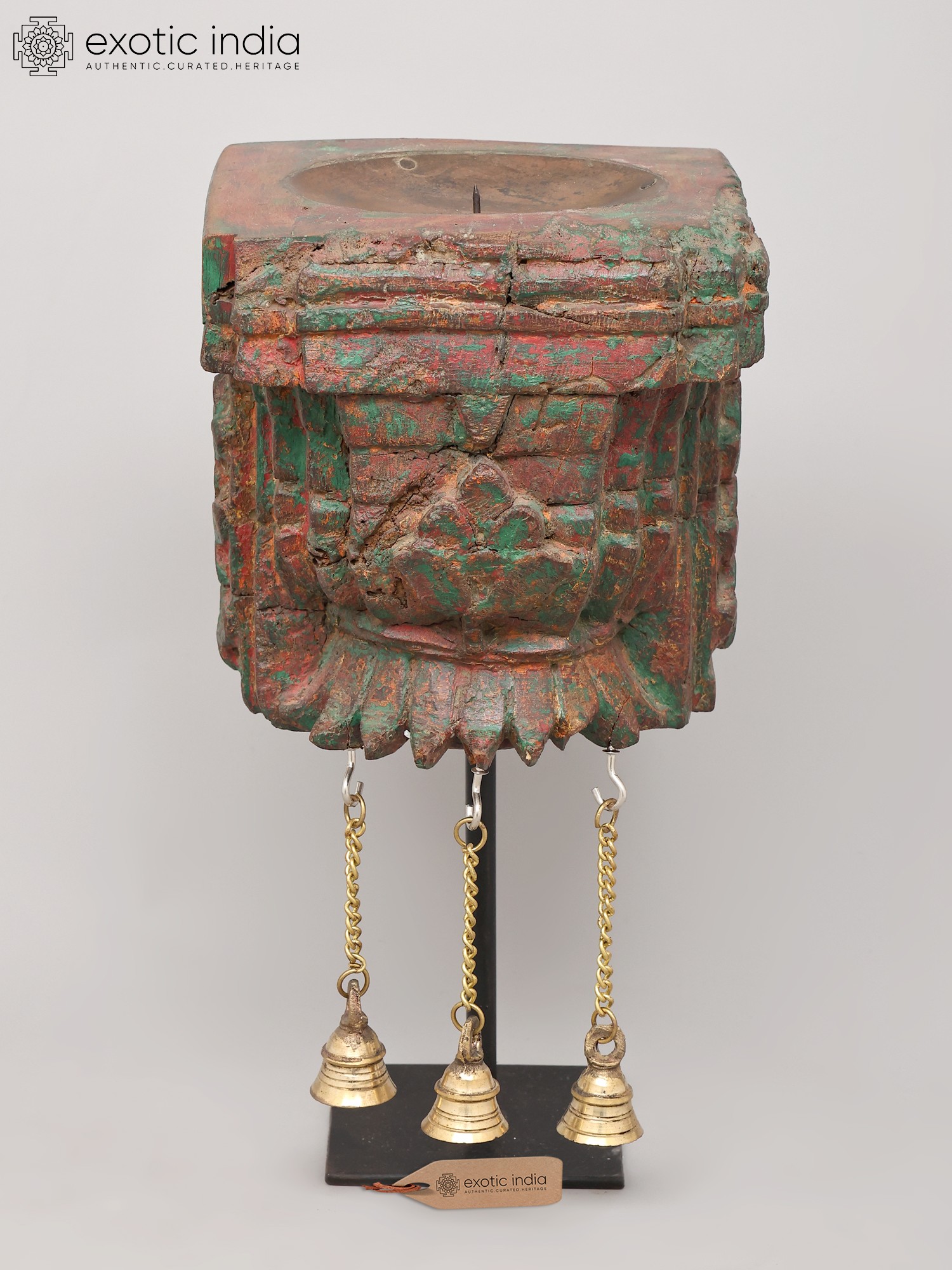 10" Wood Carved Candle Stand with Brass Bells | Home Decor