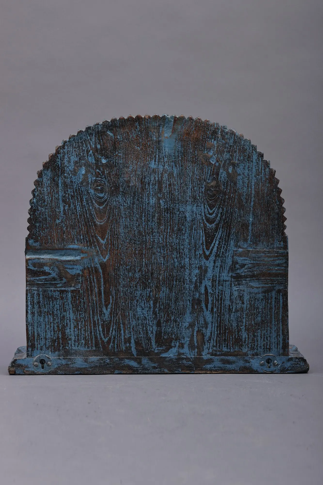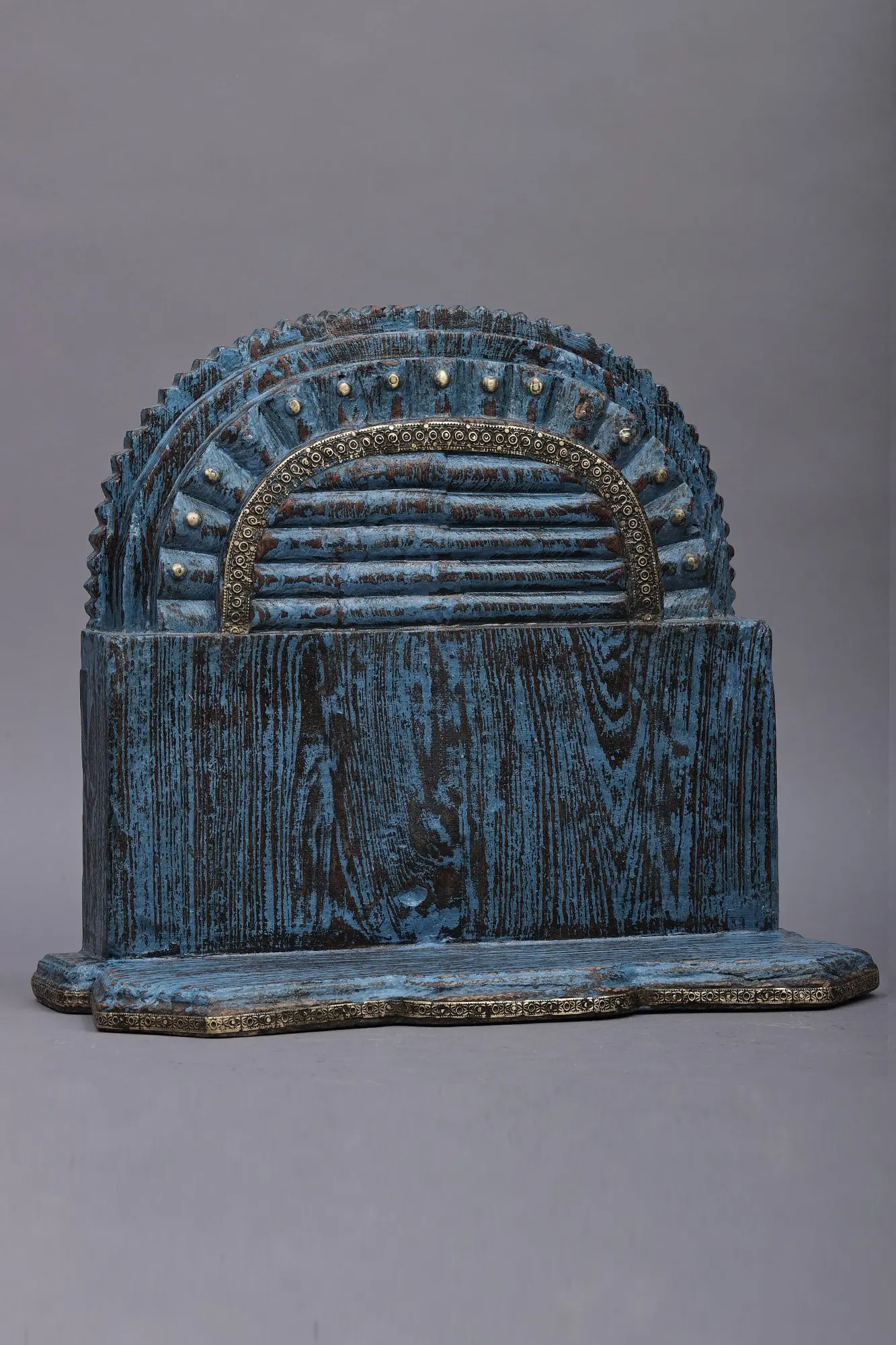 A sturdy, rectangular-shaped piece of fine-quality wood is supported by a wooden panel base. The edges are remarkably covered with a thin carved strip of brass. A luxurious wooden cap, intricately carved out of various geometrically designed wooden pieces, tied to each other is placed on the structure. A brass strip cut and pasted in a cap-shape is looking elegant. In addition, some brass knobs placed on it also add beauty to its look. The overall wall mount will be a wonderful decor for your wall.