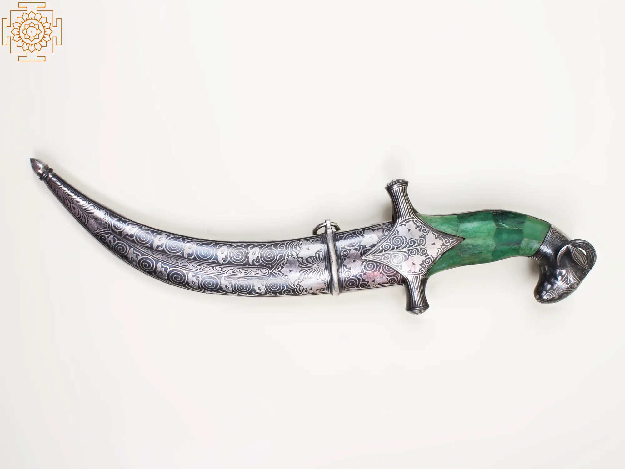 The curved blade is a marvel of craftsmanship, featuring a distinctive patterned surface that speaks to ancient forging methods or decorative inlay. This pattern is not merely a surface treatment but appears to be an integral part of the metal's structure, adding depth and texture. The hilt is equally impressive, designed for both aesthetic appeal and a comfortable grip, should one choose to handle it. The handle itself is adorned with vibrant green stones, meticulously set to create a striking contrast with the metallic elements. These stones, possibly jade or a similar precious material, add a touch of opulence and natural beauty to the piece, enhancing its overall allure. The transition from the blade to the hilt is marked by a beautifully formed guard, also decorated with the same intricate scrollwork found on the scabbard. The pommel culminates in a stylized animal head, adding a regal and powerful finish to the design. The scabbard, designed to perfectly house the blade, is equally ornate, featuring detailed scrollwork and a loop for attachment, further emphasizing its heritage and intended use as a distinguished accessory. The combination of the patterned iron, the vibrant green stones, and the detailed metalwork creates a harmonious and captivating display of artistry. This piece is ideal for collectors, enthusiasts of historical artifacts, or anyone seeking a unique and meaningful decorative item to elevate their living space. It serves as a conversation starter, a focal point, and a beautiful representation of cultural pride and artisanal excellence.