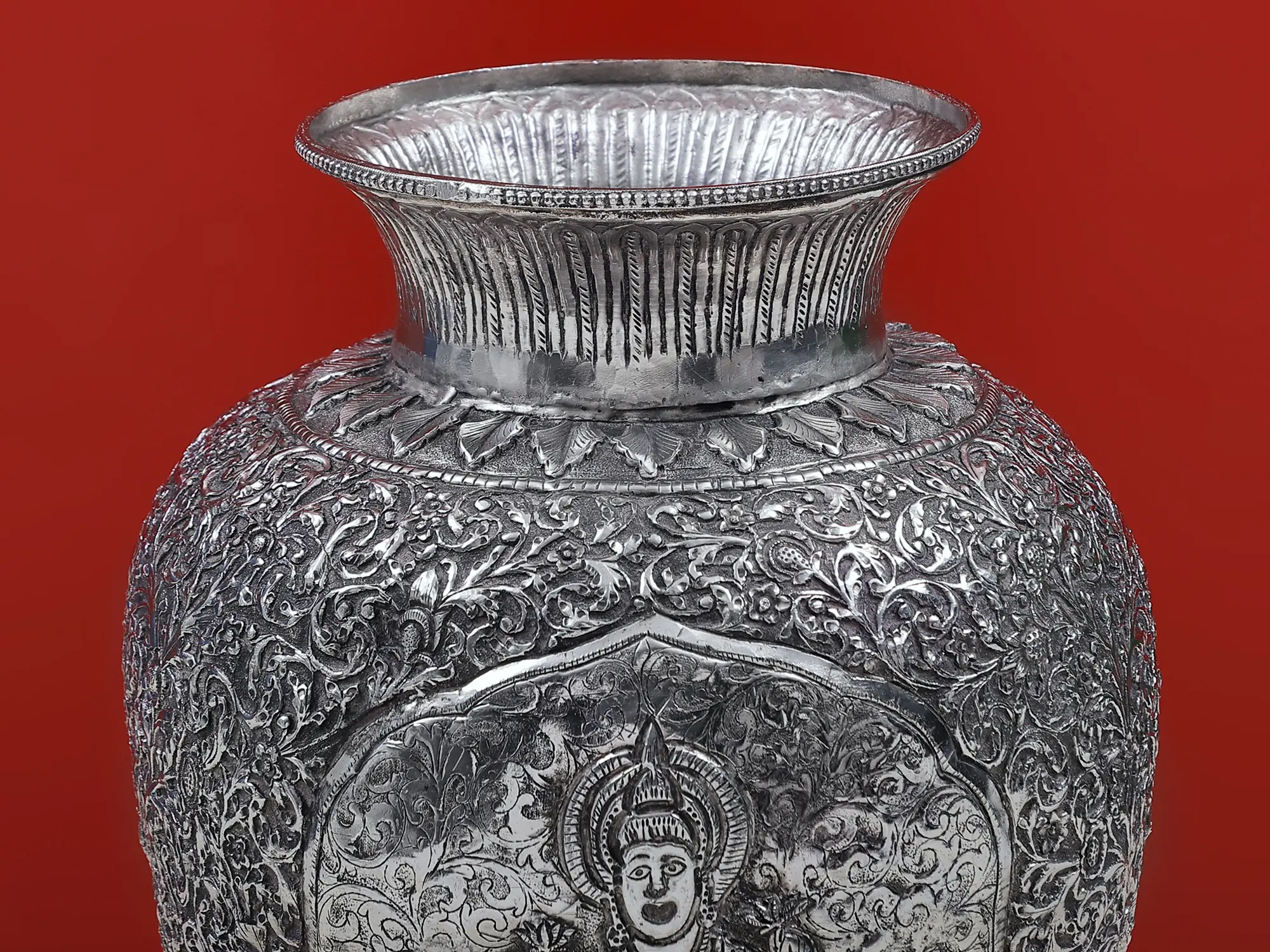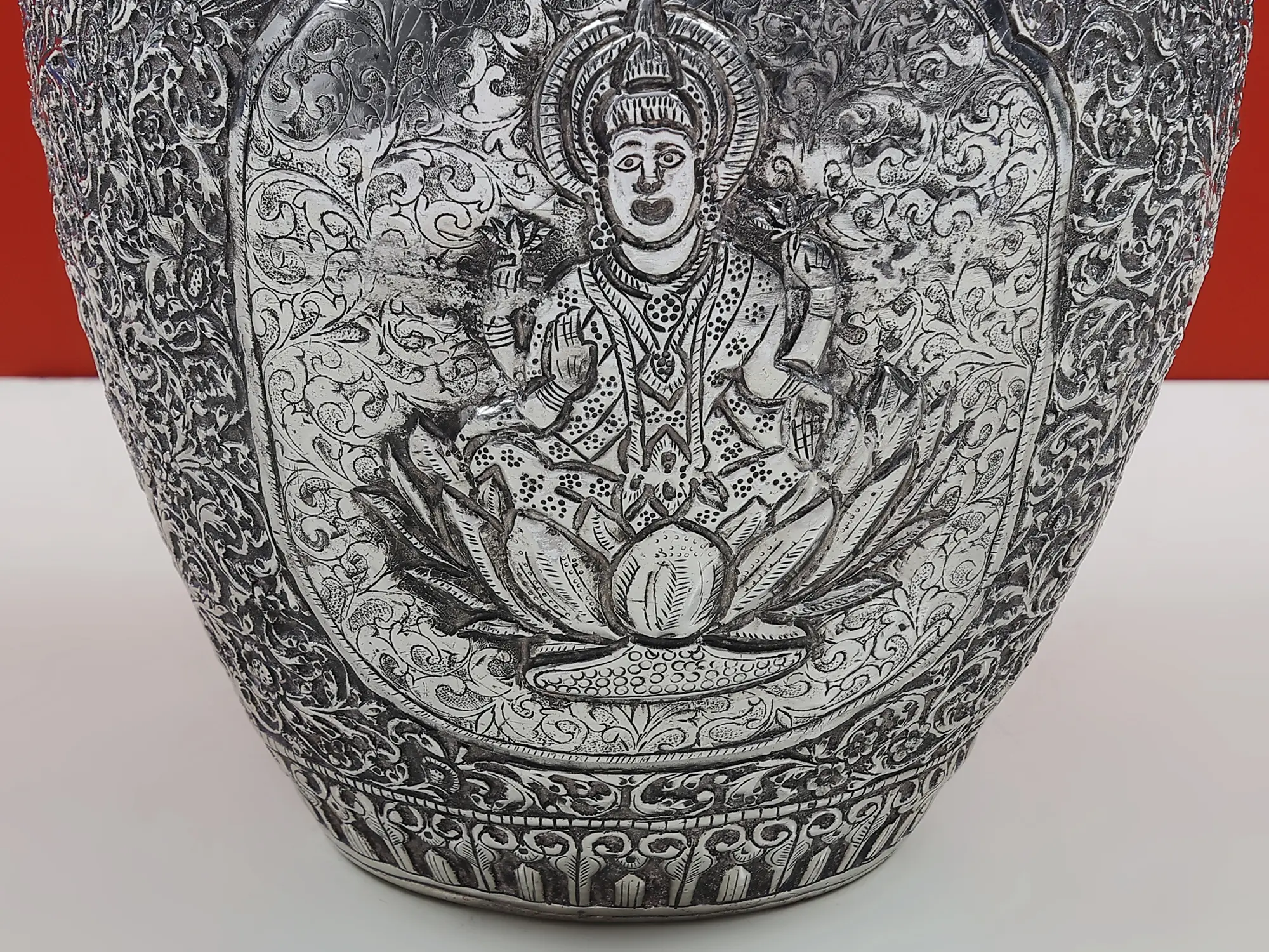 Each strike of the hammer whispers ancient tales, a hymn to the goddess of wealth and prosperity. The vase, a portal to the sacred, reflects the supreme finesse of artisans' hands. As light caresses its surface, Lakshmi's form dances amidst blossoming motifs, bringing abundance to life. This masterpiece transcends a mere vessel; it's a sanctuary where art and spirituality converge, and the goddess herself breathes through every meticulously packed nuance.