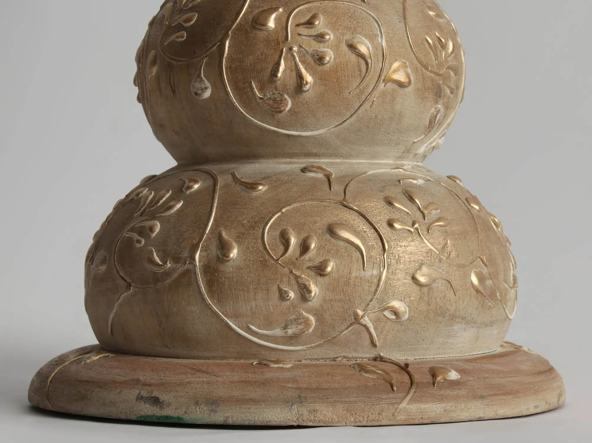 Elevate your home décor with this exquisitely crafted candle holder, a unique piece that seamlessly blends rustic charm with an artistic flair. The tiered, wooden base, reminiscent of stacked natural elements, serves as a captivating foundation. Each section of the base is adorned with intricate, raised floral patterns, finished in a subtle yet elegant gold accent that catches the light beautifully. This detailed carving adds a touch of antique sophistication, making it a standout addition to any table, mantelpiece, or shelf.