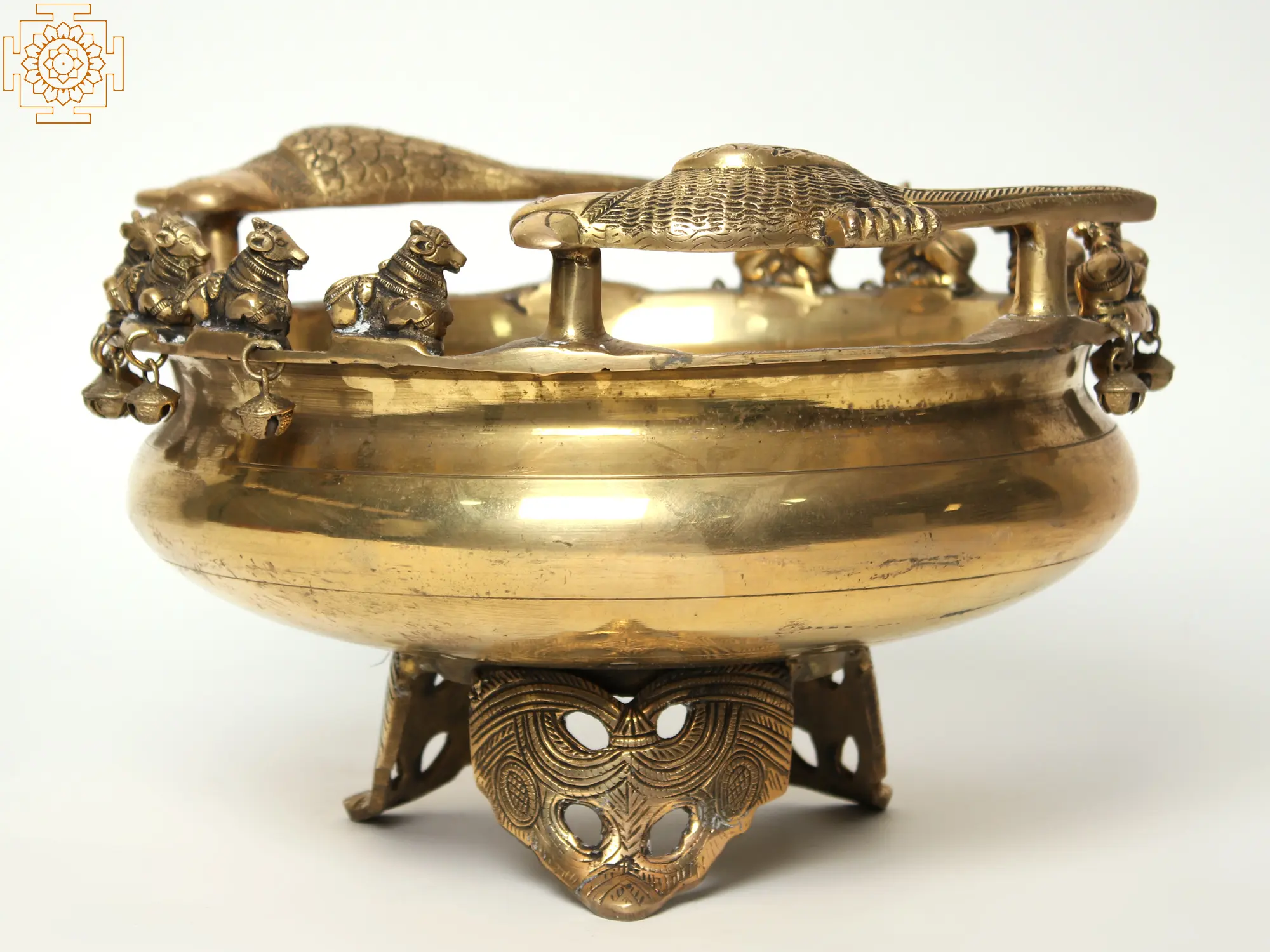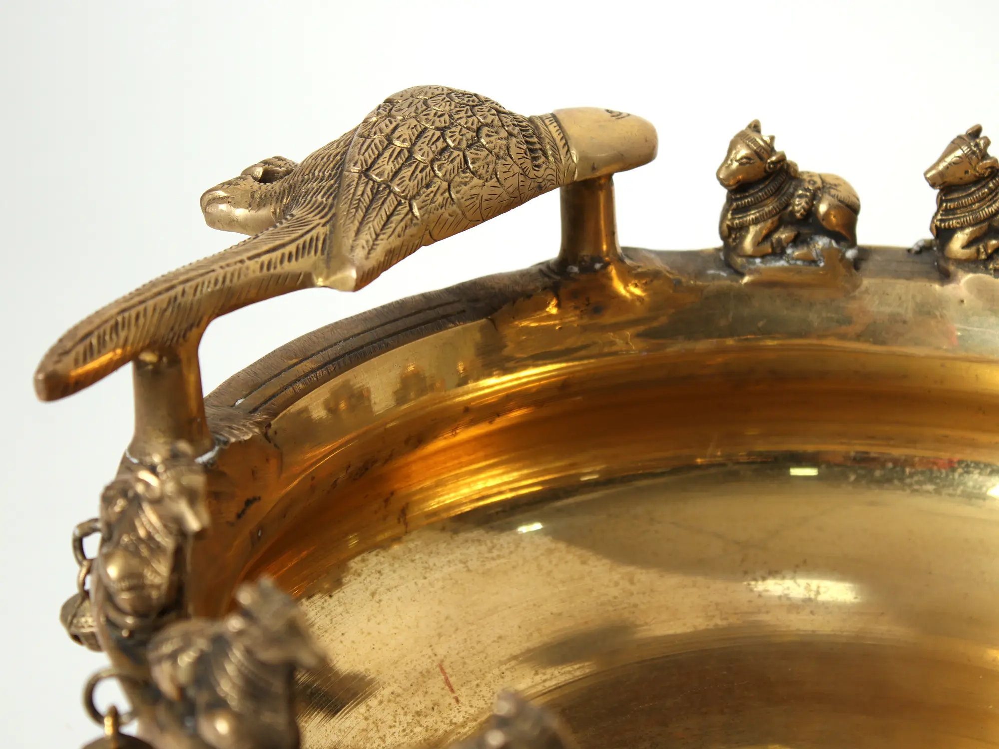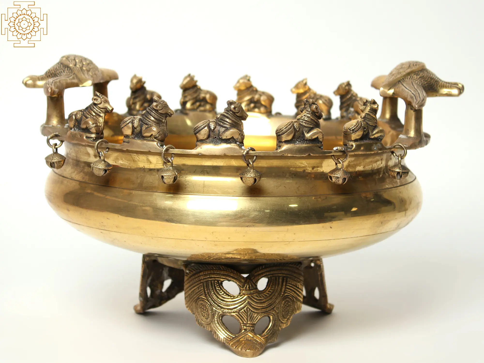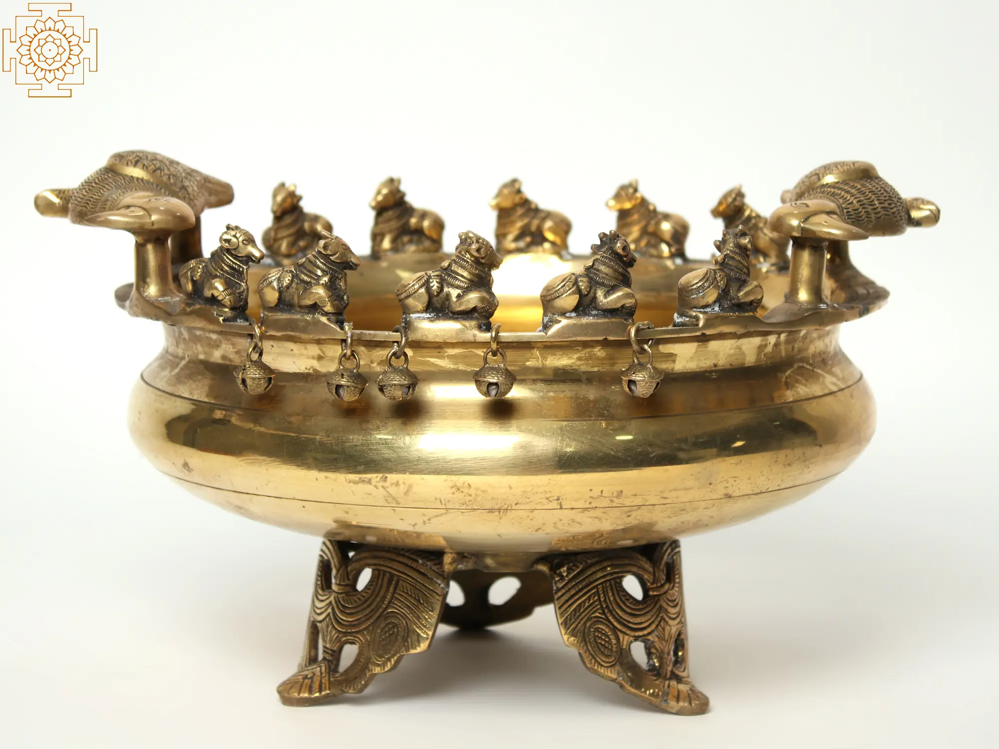 The Urli having two Parrot motifs as handles and Lord Nandi statues arranged in a circle on the mouth of the Urli is a nice hint towards the story. The Urli is constructed traditionally by skilled artisans and also contains small bells under the Nandi motifs. It also has an elaborate stand to provide support in style. All over this Urli is a magnificent home decor item with an equally magnificent back story.