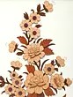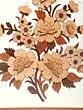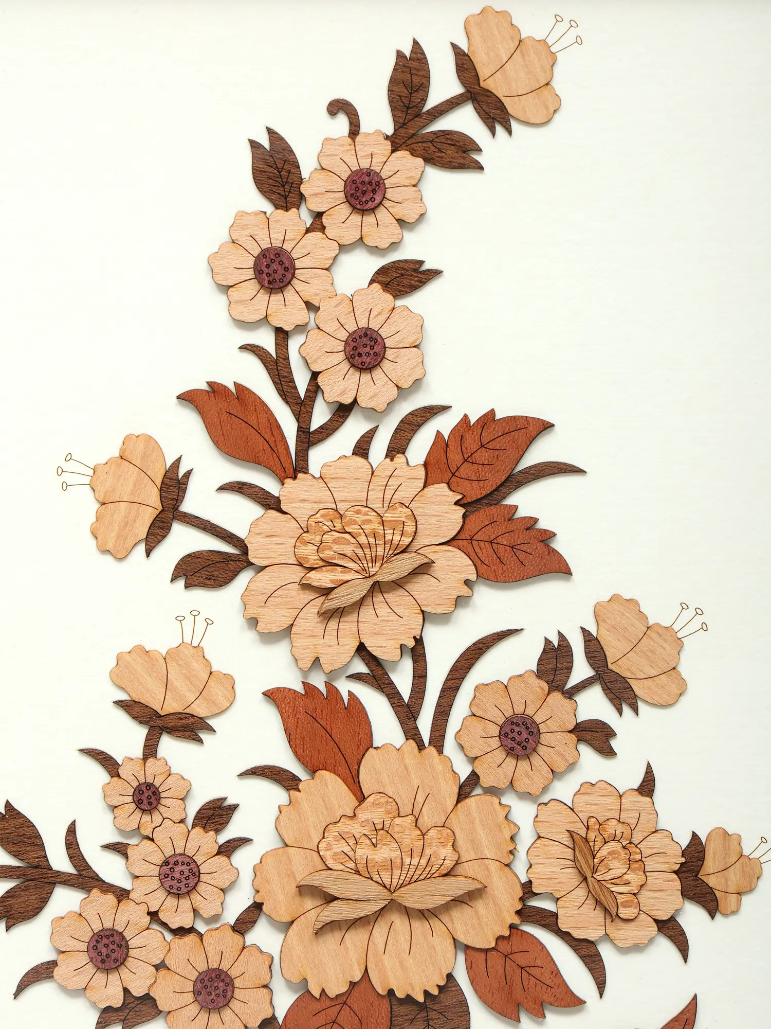 Each element of this piece has been carefully considered and executed with the utmost skill. The flowers, leaves, and stems are intricately carved from wood, showcasing the artist's dedication to their craft. The natural wood tones create a warm and inviting aesthetic, while the layered design adds a sense of depth and visual interest. The design sits on a patterned backdrop, further enhancing its appeal.
