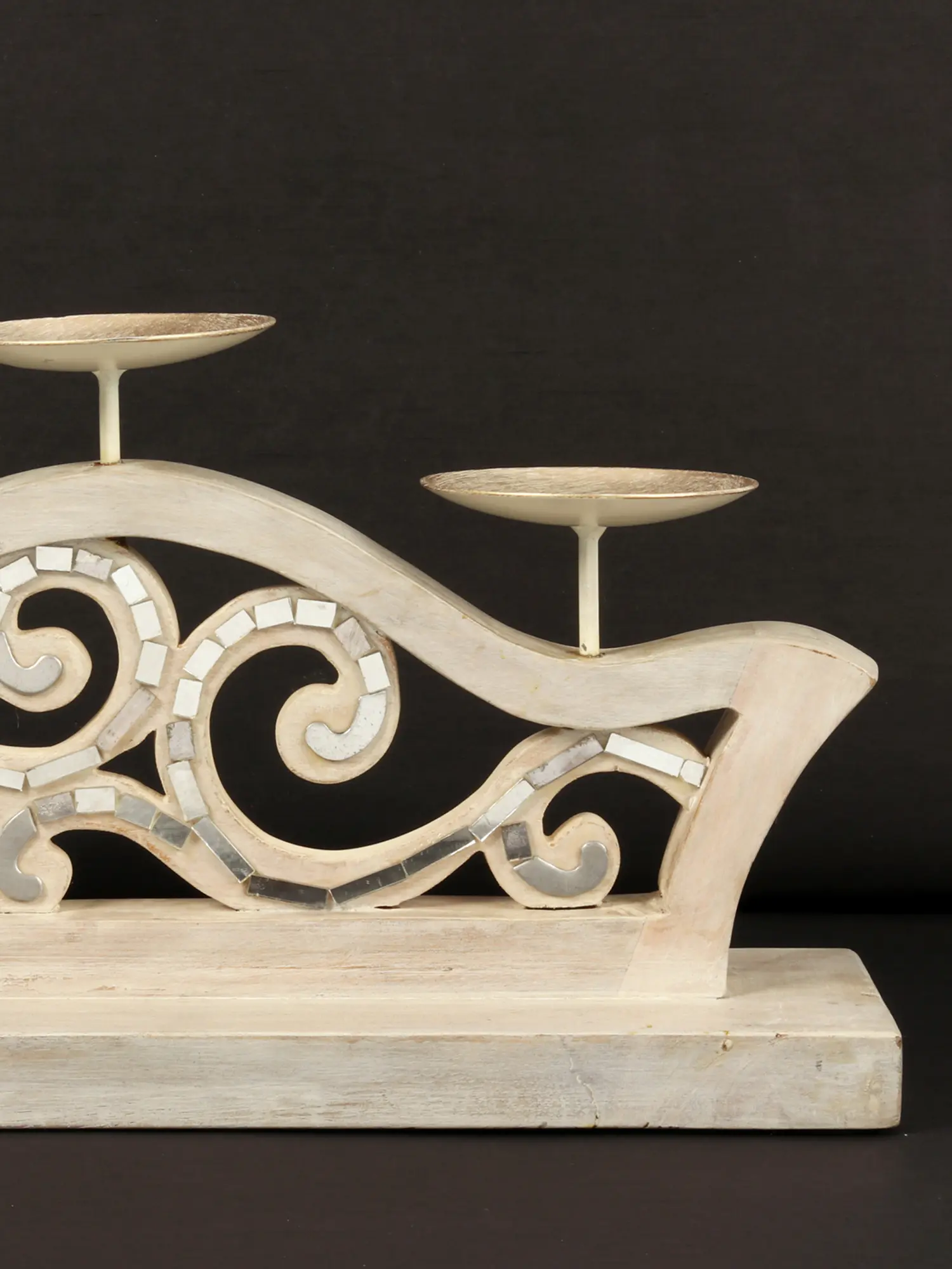 The heart of this candle holder's appeal lies in its beautifully intricate cutwork. The flowing, organic lines are reminiscent of natural forms, perhaps stylized waves or curling vines, creating a sense of movement and grace. Each curve and swirl is meticulously shaped, showcasing the craftsmanship involved. This detailed lacework is further enhanced by delicate inlays of mirror-like accents, strategically placed to catch and reflect the flickering candlelight. As the flames dance, these reflective details create a mesmerizing play of light and shadow, adding depth and sparkle to the piece. The soft, distressed finish of the wooden elements provides a rustic charm that beautifully contrasts with the modern gleam of the mirrored inlays, resulting in a versatile aesthetic that complements a wide range of interior styles.