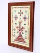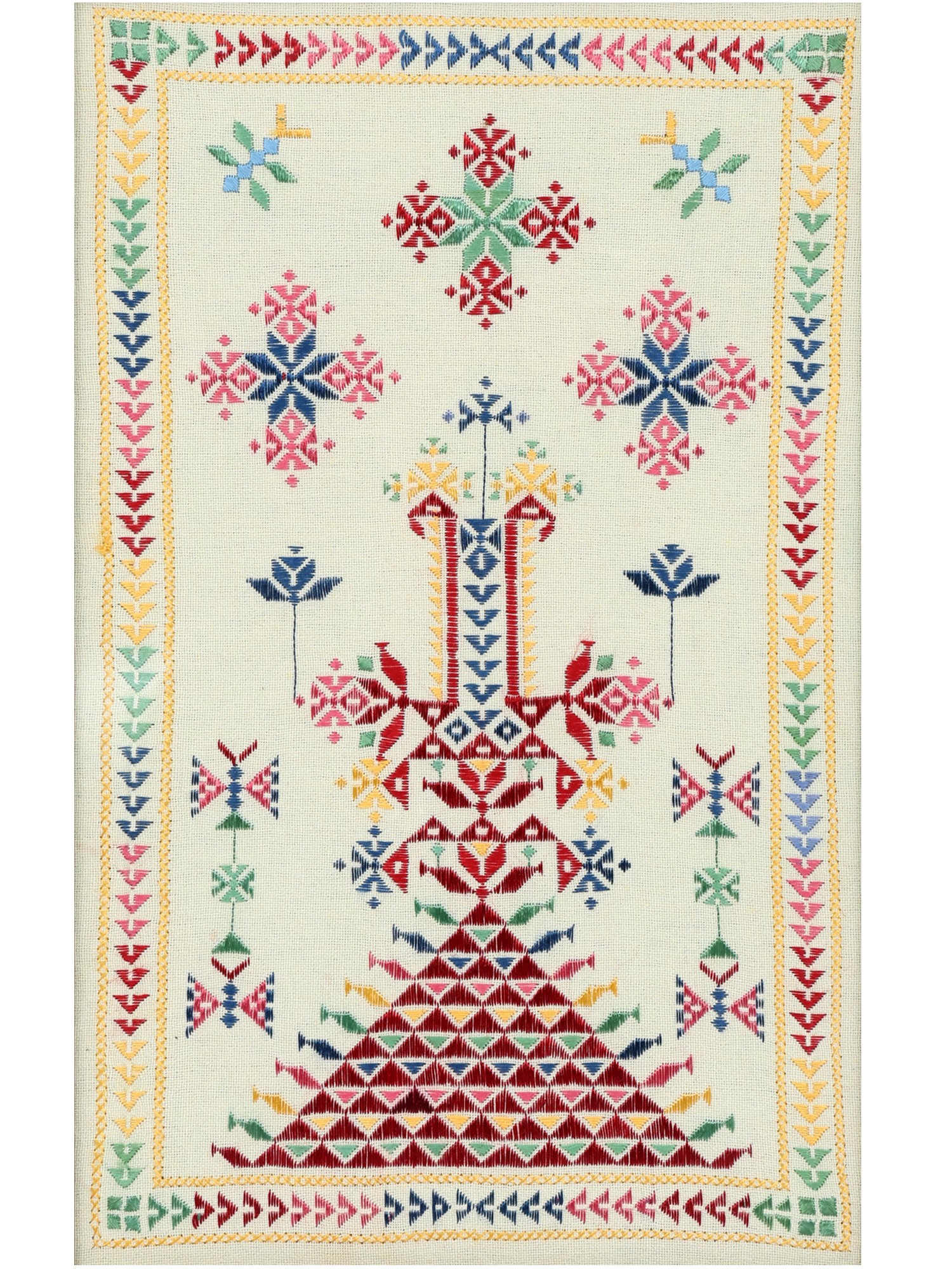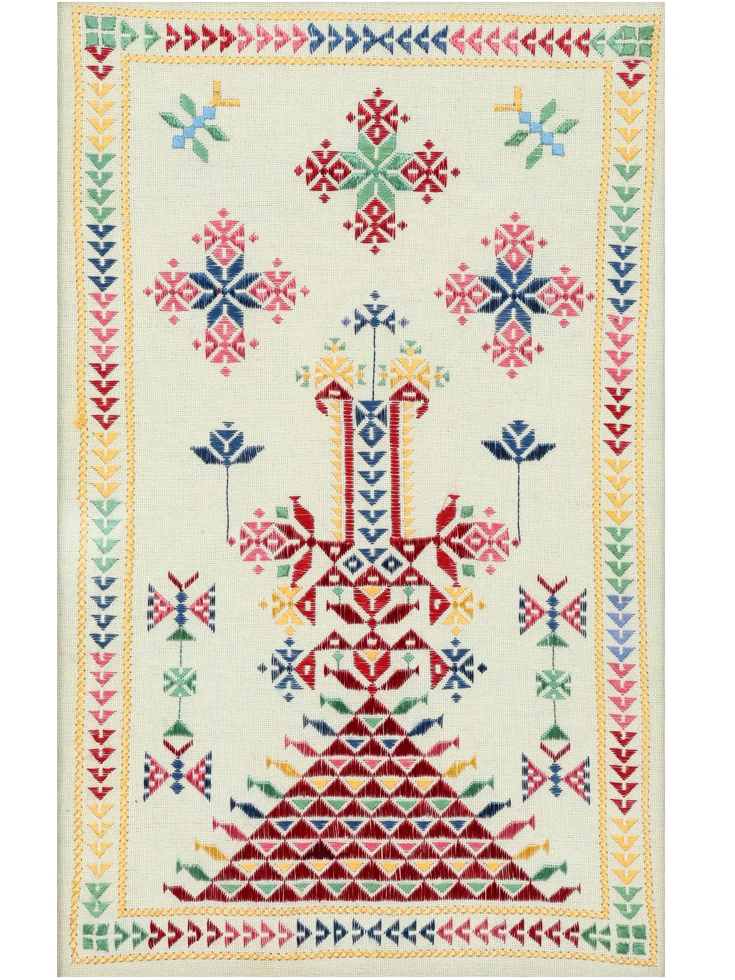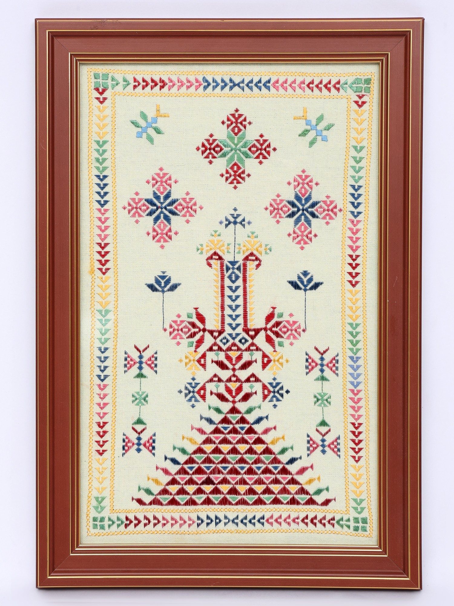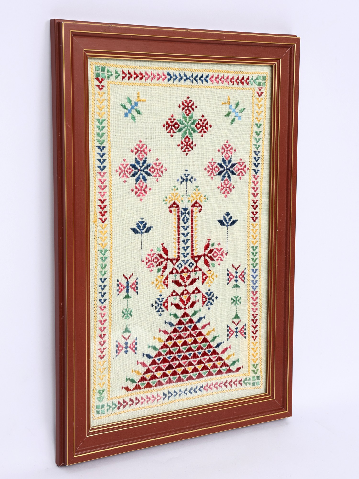 The artwork features a captivating central motif, meticulously rendered in a variety of vibrant hues. These hues are thoughtfully balanced, creating a harmonious visual symphony that pops against the soft, off-white background. The embroidery itself is a masterpiece of precision, with each stitch placed with intention and care. This hand-stitched detailing is complemented by a series of smaller, equally intricate patterns that frame the main design, adding depth and texture to the overall composition. The colors range from rich reds and deep blues to sunny yellows and calming greens, creating a kaleidoscope of tones that will bring life and warmth to any room. Consider it a burst of sunshine for your walls.