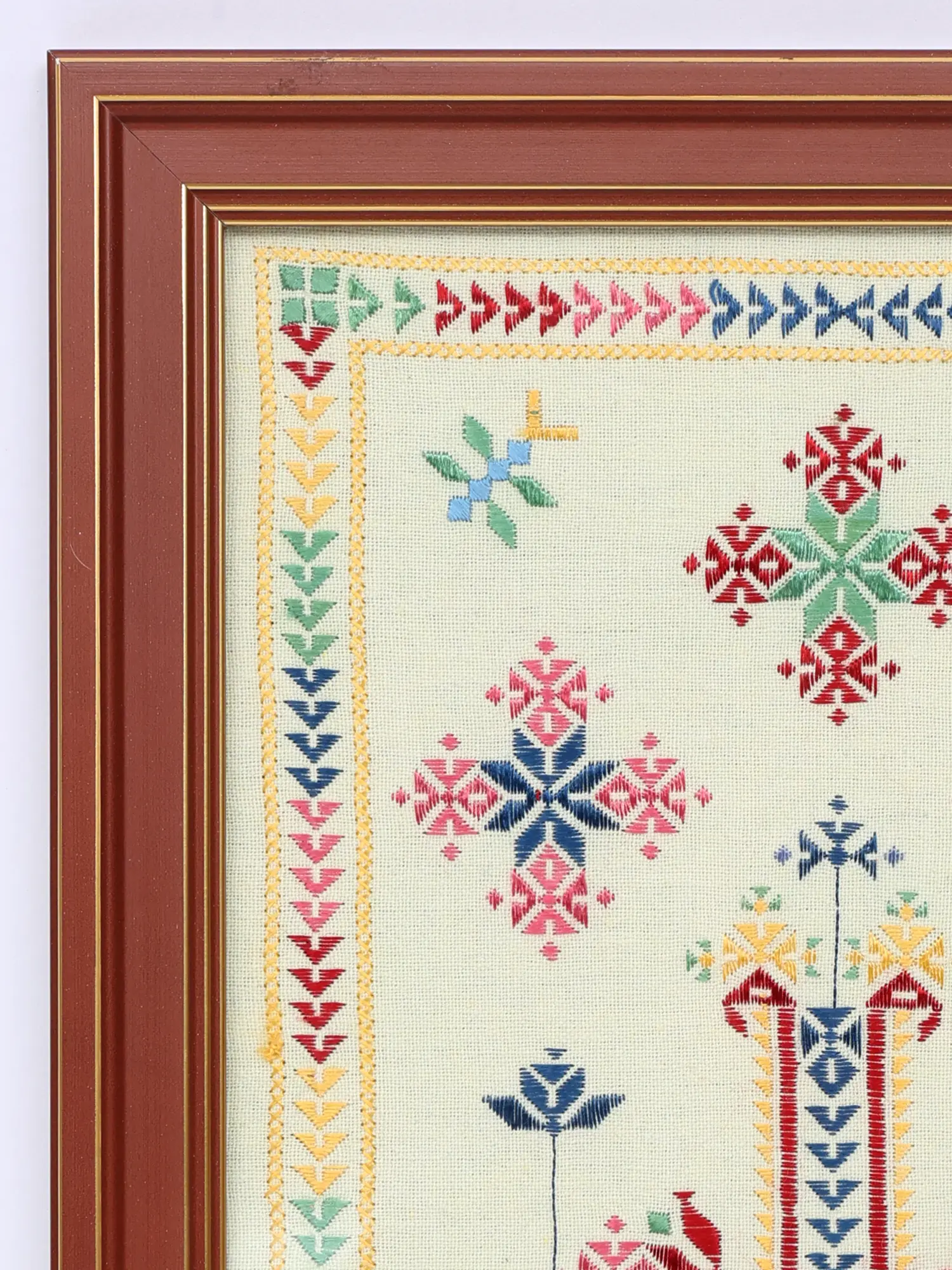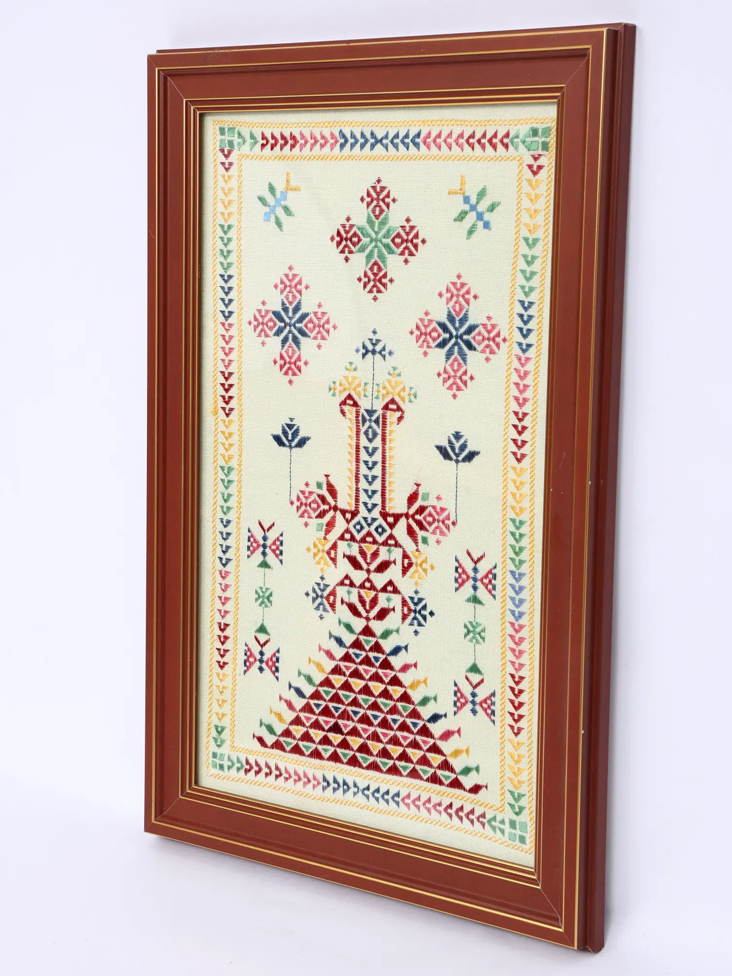 The high-quality cloth base provides a beautiful backdrop for the intricate embroidery, ensuring the colors remain vibrant and the design remains sharp for years to come. Furthermore, the piece is expertly framed in a rich, dark wood that complements the embroidered design without overpowering it. The frame is not only aesthetically pleasing but also robustly constructed, providing lasting protection for your treasured artwork. This thoughtful combination of materials and construction makes this hand-embroidered wall hanging a piece to be both admired and treasured for its quality and beauty. It's ready to hang and add immediate elegance to your home.