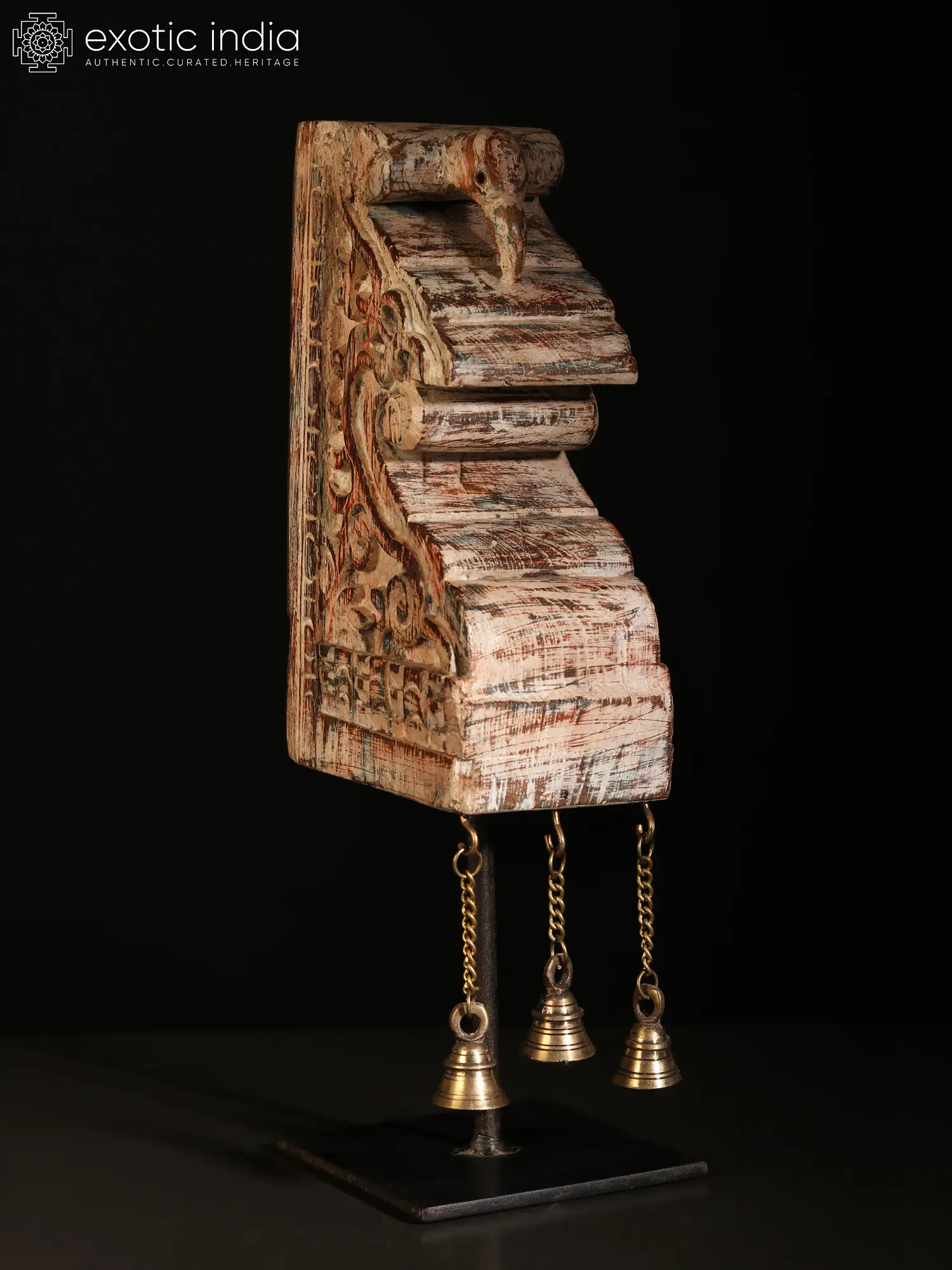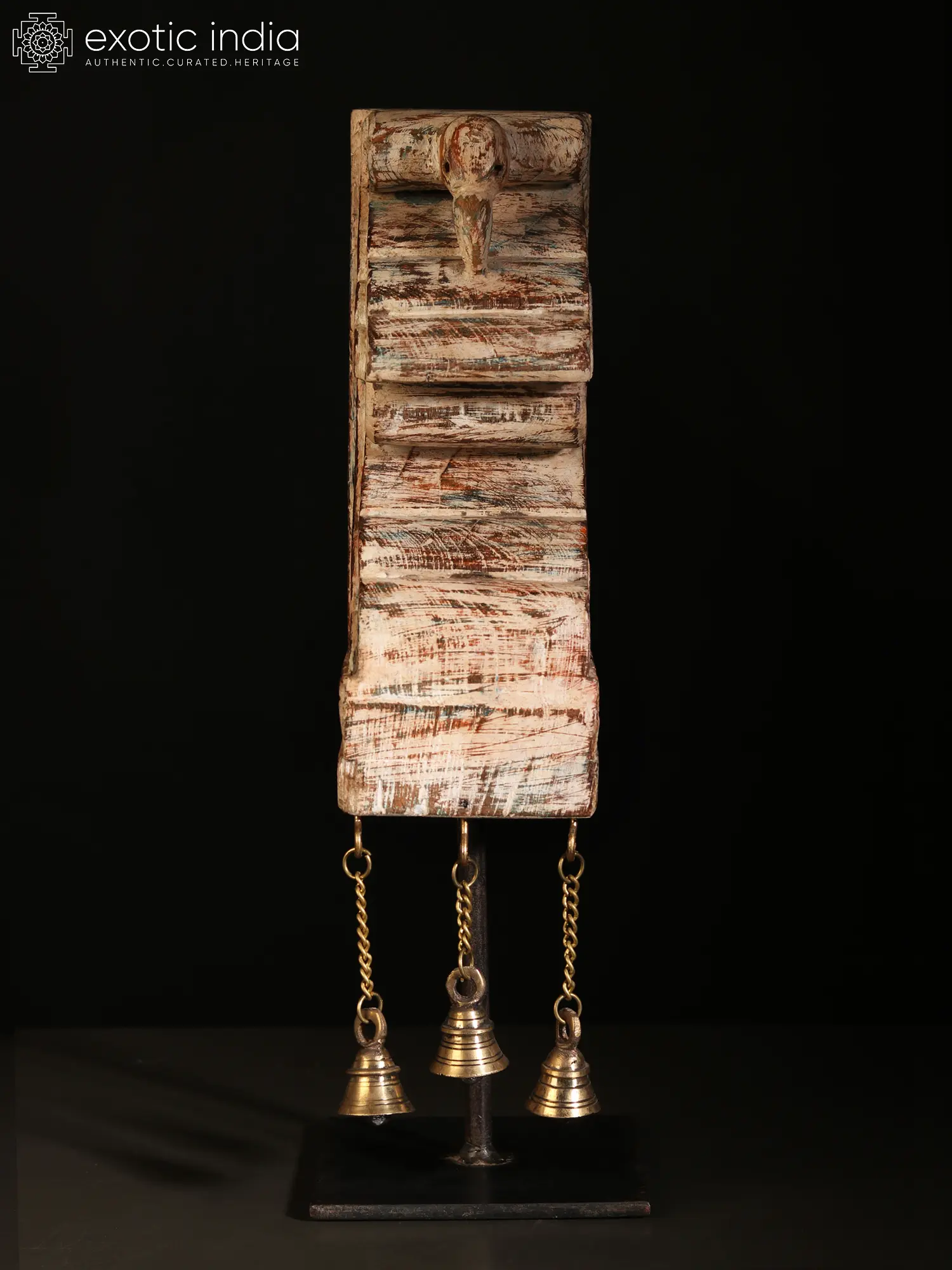 16" Wood Carved Designer Showpiece on Iron Stand with Brass Bells | Table Decor