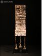 The wooden masterpiece is expertly complemented by a sturdy iron stand, providing a sophisticated contrast in textures and materials. The stand's minimalist design allows the intricate wood carving to take center stage, while its robust construction ensures stability and durability. Adding a touch of delicate melody are three brass bells delicately suspended from chains, their gentle chimes adding an auditory dimension to the visual splendor. The brass bells not only complement the color palette but also introduce an element of subtle movement and sound, creating a truly captivating sensory experience. The combination of wood, iron, and brass creates a rich, layered aesthetic that is both timeless and modern.