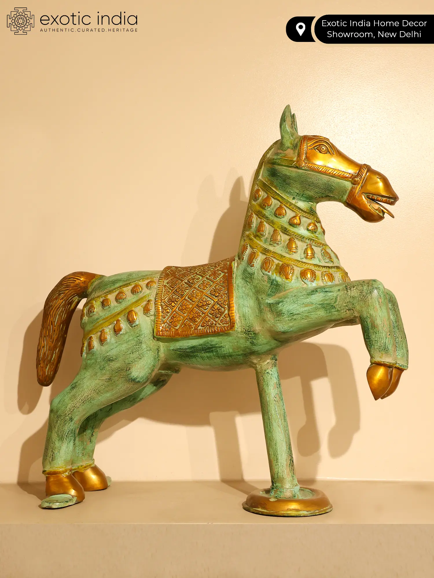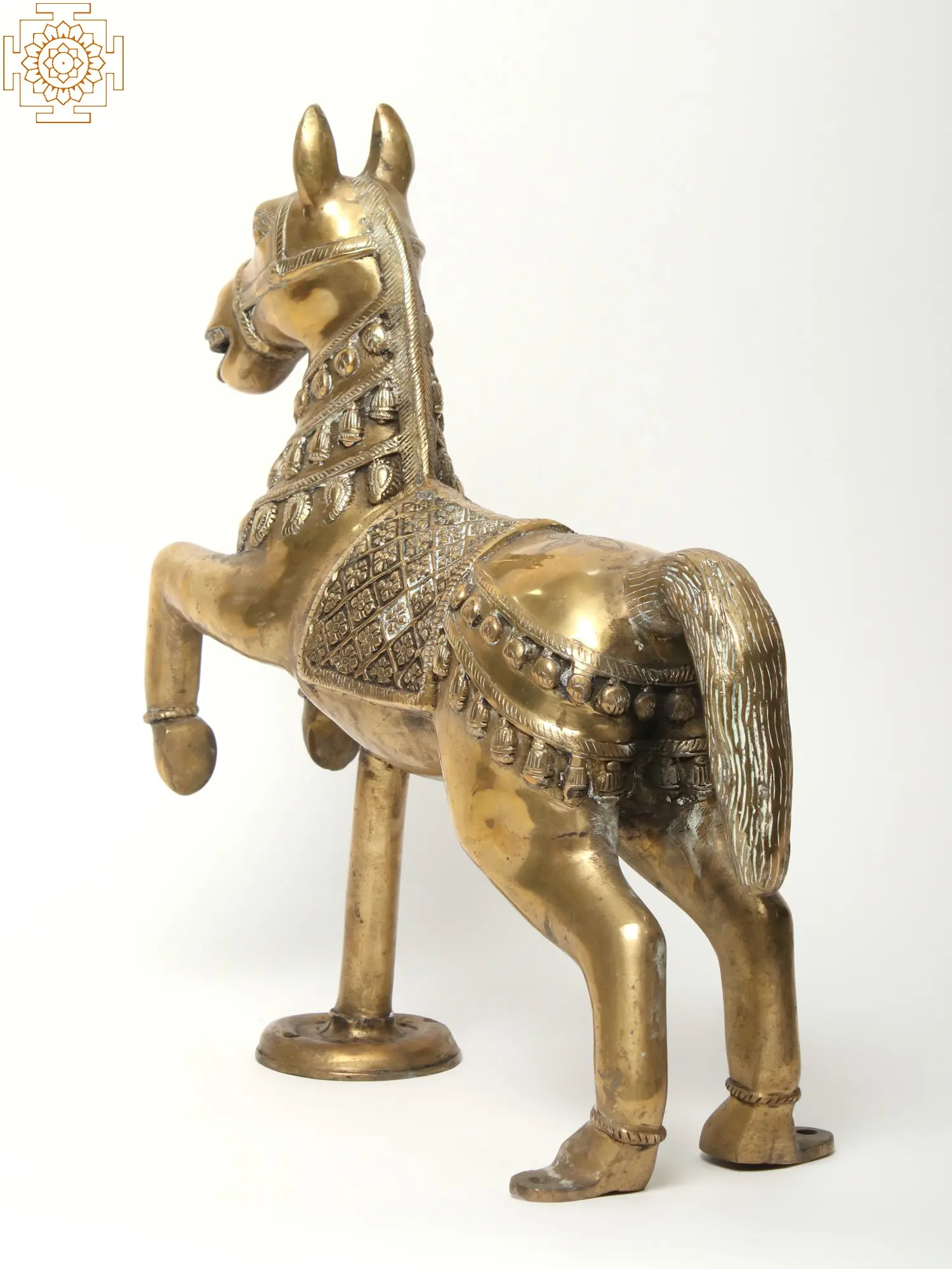 An Ashwa, or horse, appears in numerous Vedic and folk tales. This brass Decorative Horse statue adds to the millions of portrayals of the animal. The statue, which resembles a rocking horse, is a beautiful addition to any home's decor. It is embellished with exquisite ornamentation and depicted as a charging horse. The chain with bells around its neck is a beautiful piece of craftsmanship. Its tongue is protruding as though screaming with rage. This painting is an excellent illustration of a horse's major characteristics, speed and attention.