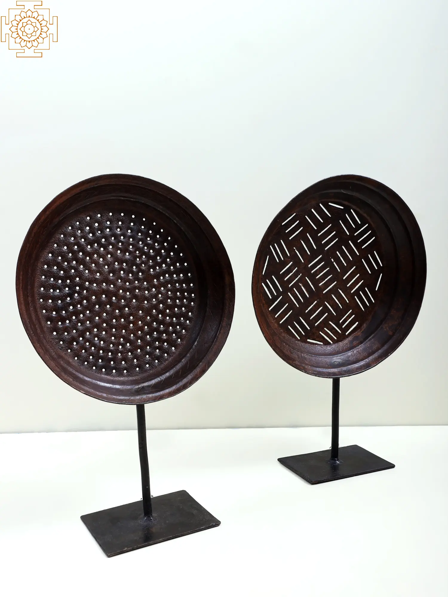 This Lattice Design Table Decor (pair) is an output of the concept of assemblage. Assemblage is a form of art practiced by famous artists like Marcel Duchamp. During an exhibition, Marcel displayed items as sculptures, including a urinal, a bottle-drying rack, and a snow shovel. To make artwork, artists also sew materials and find things together. Here in this assemblage, there are two sieves, one with dot perforation and the other with line perforation, painted in a brown patina tint. They are set on an iron stand with an iron rod connected. This is the kind of new-age art that makes us think about ordinary items in novel and unexpected ways, making viewers wonder about their place in the universe.