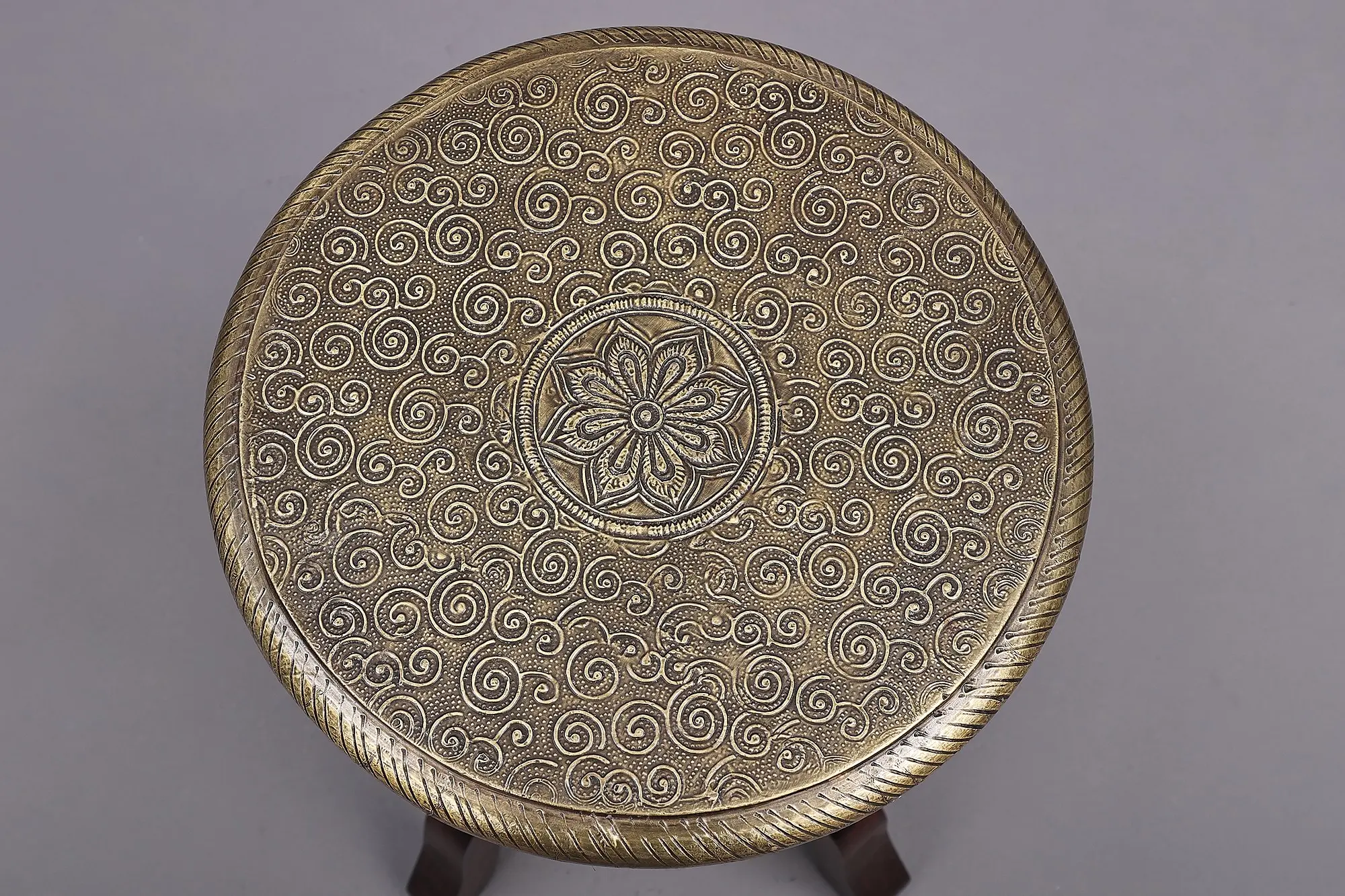 This Wood Stool features a Brass Carved sheet work and is a masterpiece that seamlessly blends woodwork and brass embossing to bring one of the unique items into existence. Adorned in traditional Bael Buta designs, this sitting table is a Timapni drum, supported by three legs intricately decorated with brass embossing. The regal combination of dark brown wood and silver-toned brass creates a unique and captivating aesthetic. Each detail, from the tabletop to the legs, is a testament to the harmonious marriage of craftsmanship and design. Elevate your space with this extraordinary piece, where cultural heritage and contemporary elegance converge in a symphony of beauty.