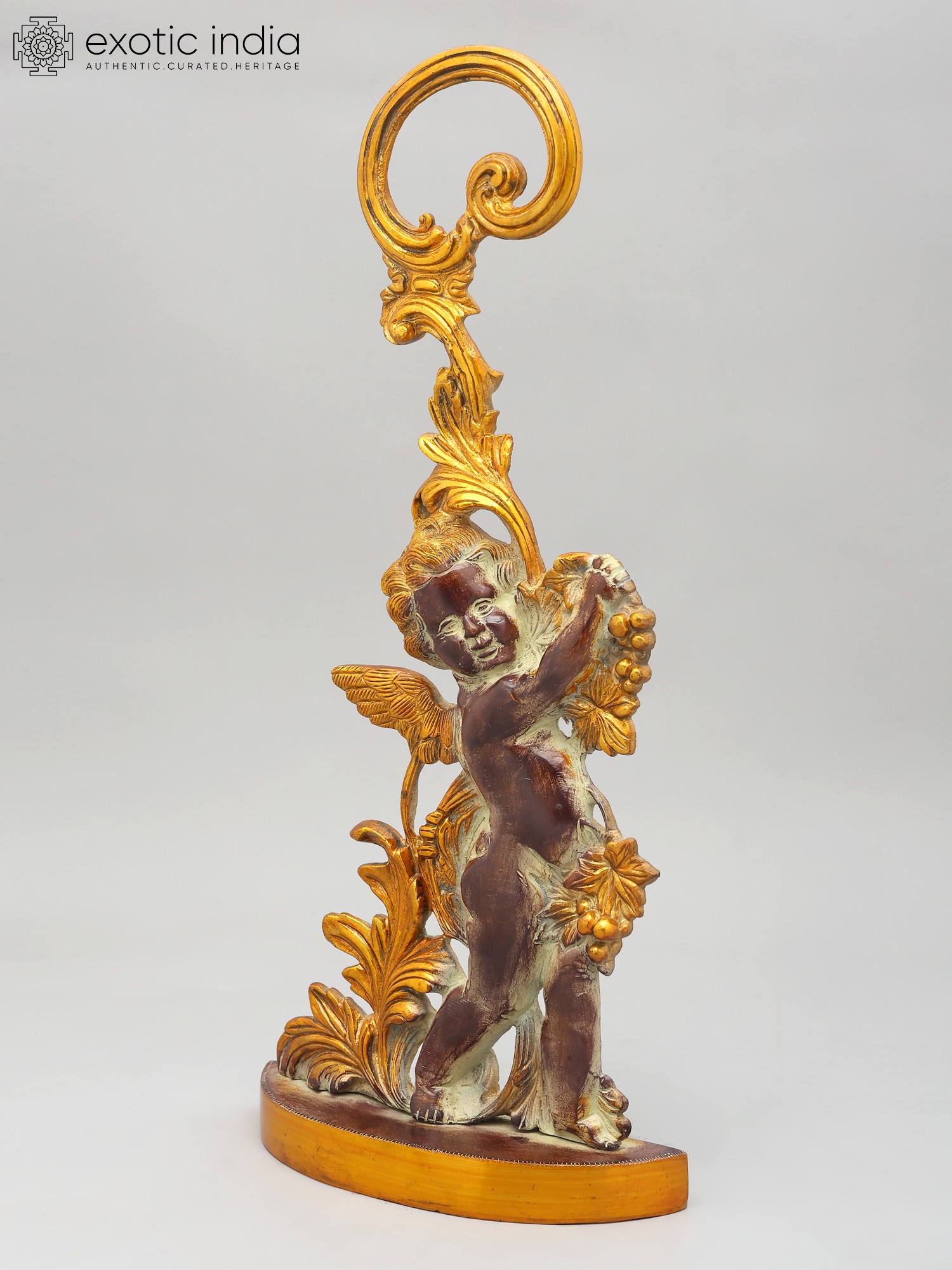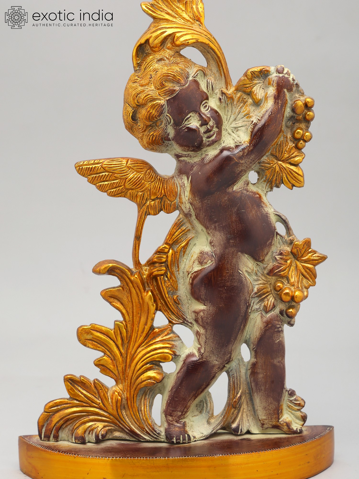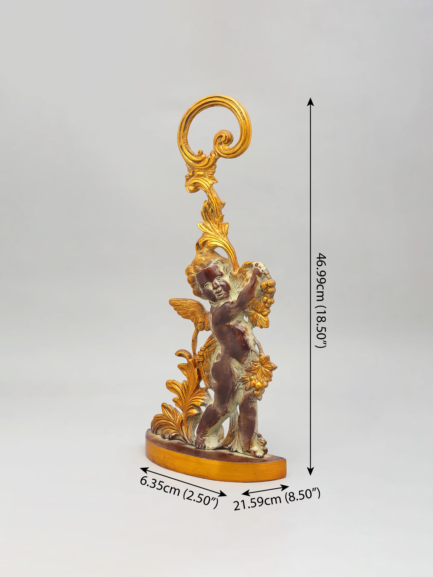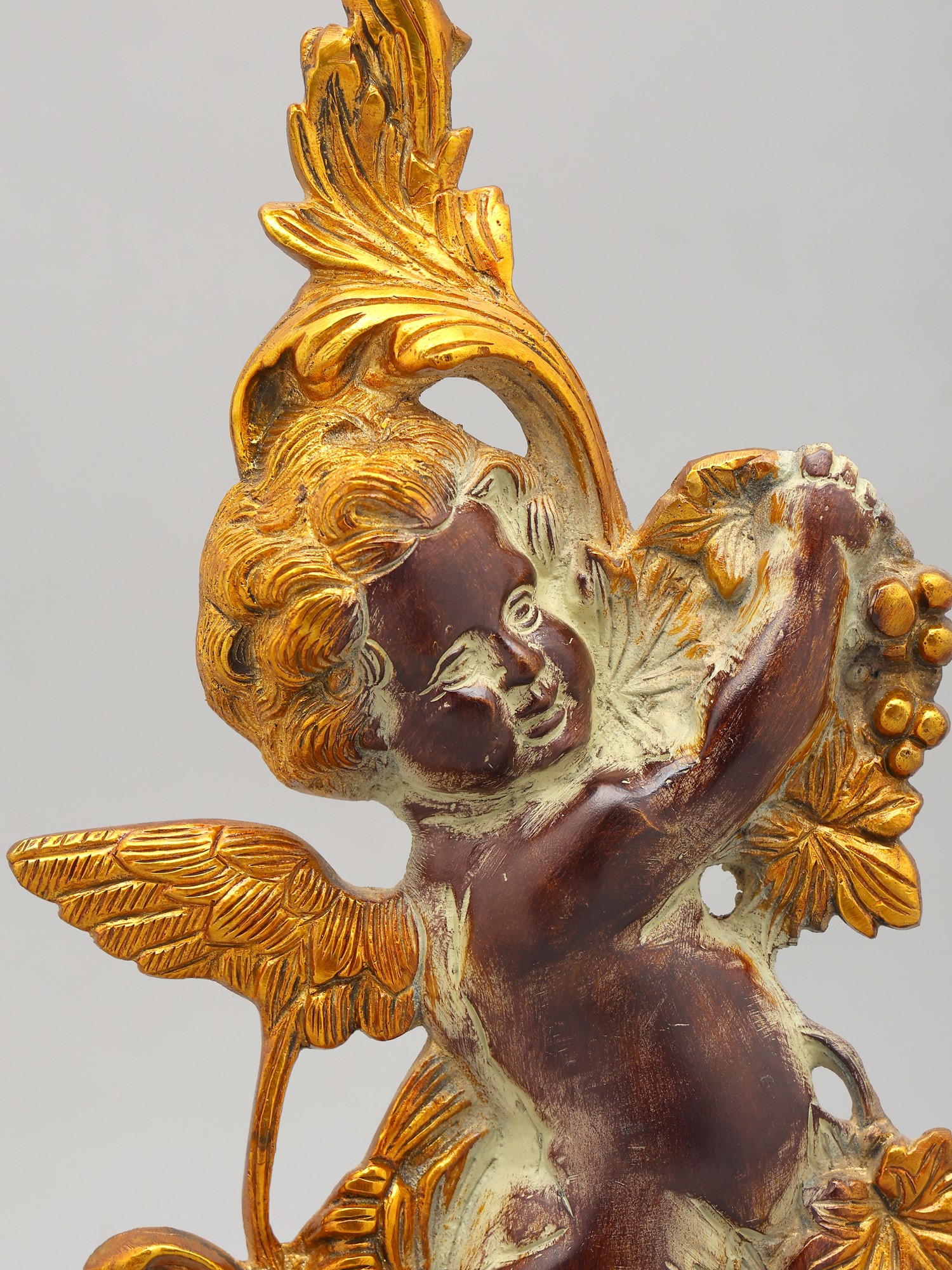This statue is made of brass, ensuring durability and a long-lasting shine. Every detail has been carefully considered, from the delicate feathers of the cherub's wings to the intricately sculpted leaves and fruit. The smooth, polished finish adds to the overall sense of luxury and refinement. This item showcases the skill and artistry of traditional craftsmanship. The attention to detail and quality of materials ensure that this piece will be treasured for generations to come. Its unique design and timeless appeal make it a perfect addition to any home decor style, from classic to contemporary.