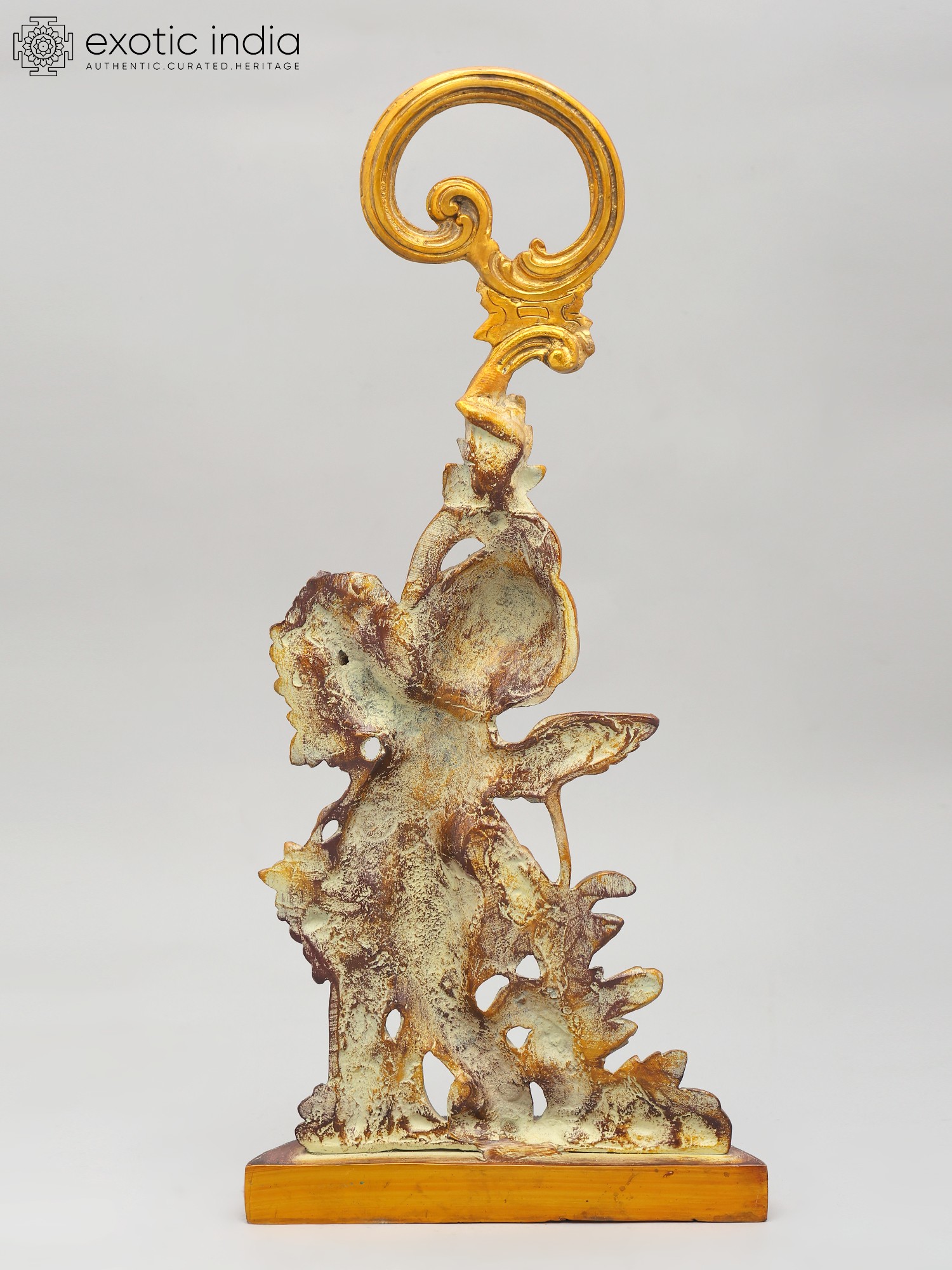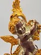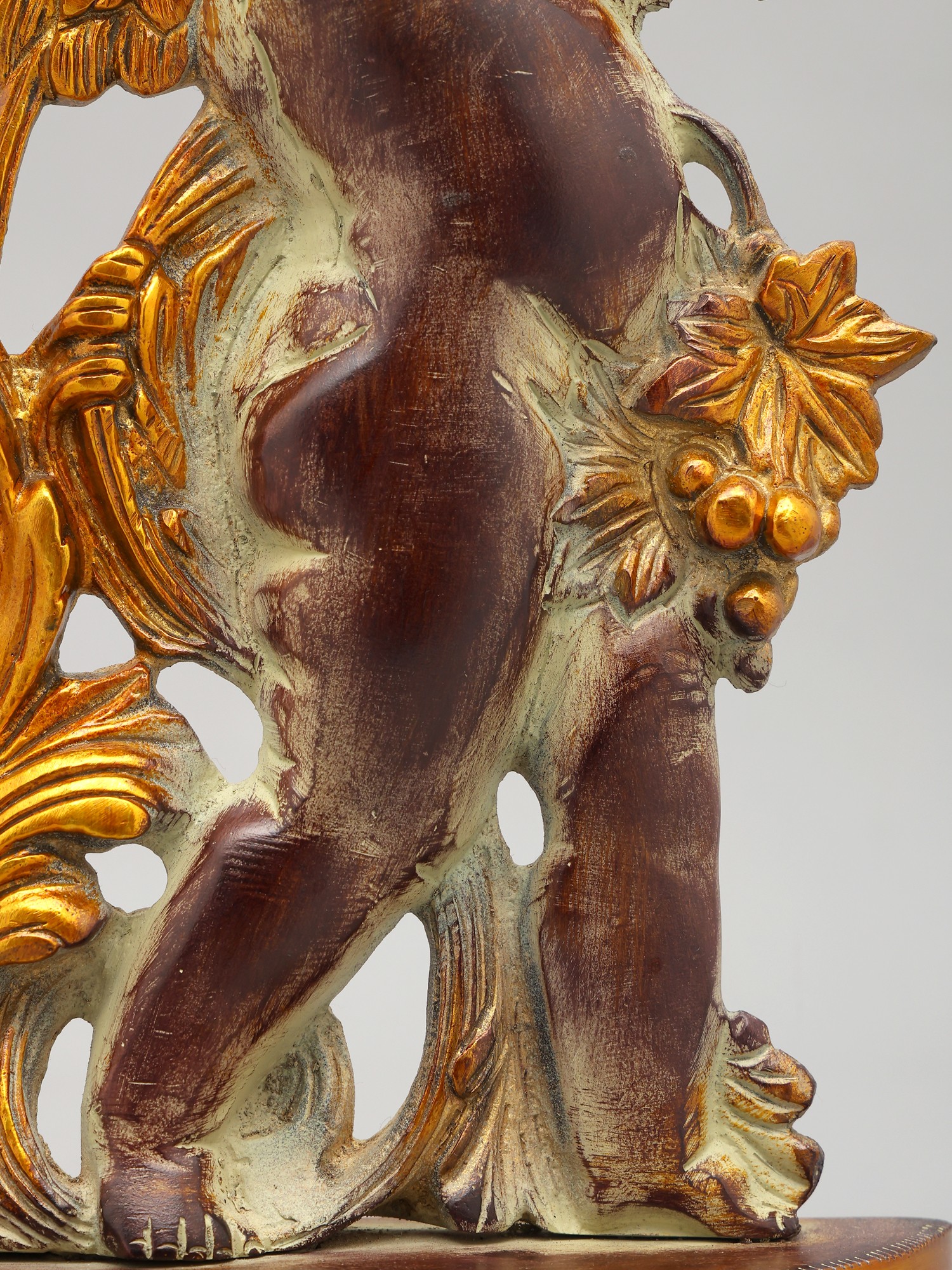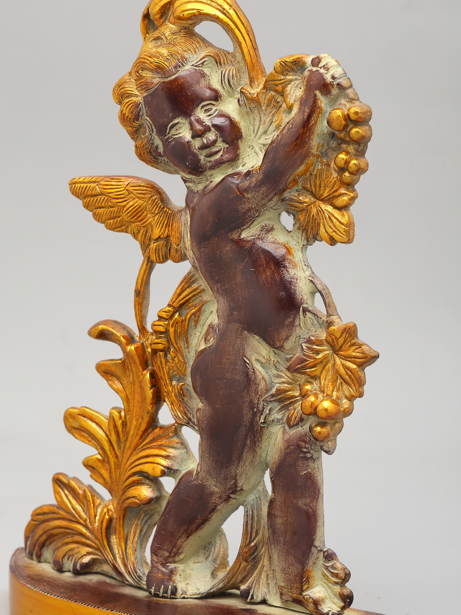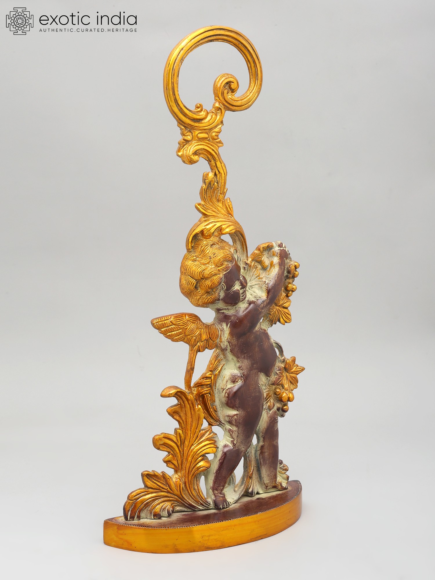 This statue is made of brass, ensuring durability and a long-lasting shine. Every detail has been carefully considered, from the delicate feathers of the cherub's wings to the intricately sculpted leaves and fruit. The smooth, polished finish adds to the overall sense of luxury and refinement. This item showcases the skill and artistry of traditional craftsmanship. The attention to detail and quality of materials ensure that this piece will be treasured for generations to come. Its unique design and timeless appeal make it a perfect addition to any home decor style, from classic to contemporary.