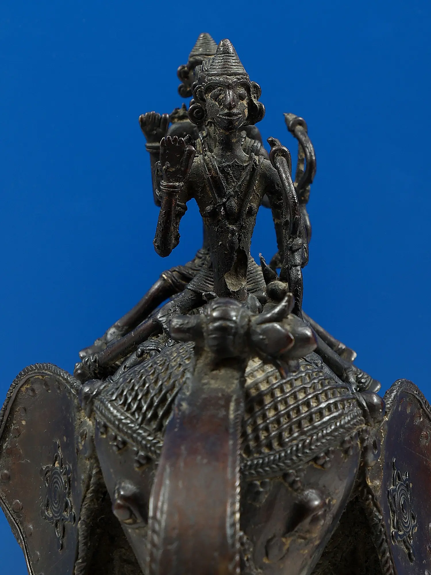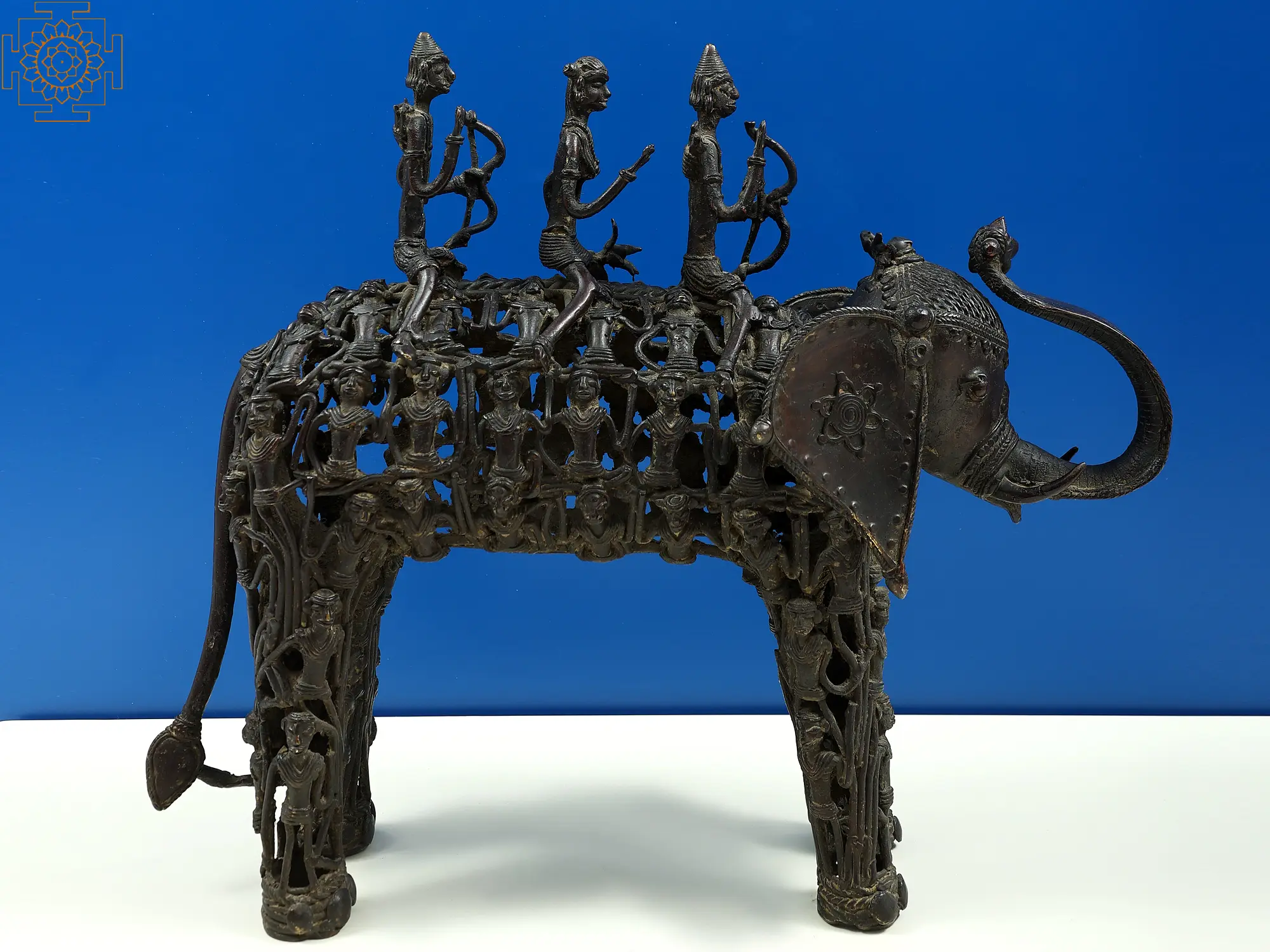 This spectacular brass artwork is a masterwork that transcends time and culture. Crafted with precision, this magnificent sculpture portrays tribal warriors, armed and poised, sitting on a majestic elephant, its trunk uplifted as a sign of might.