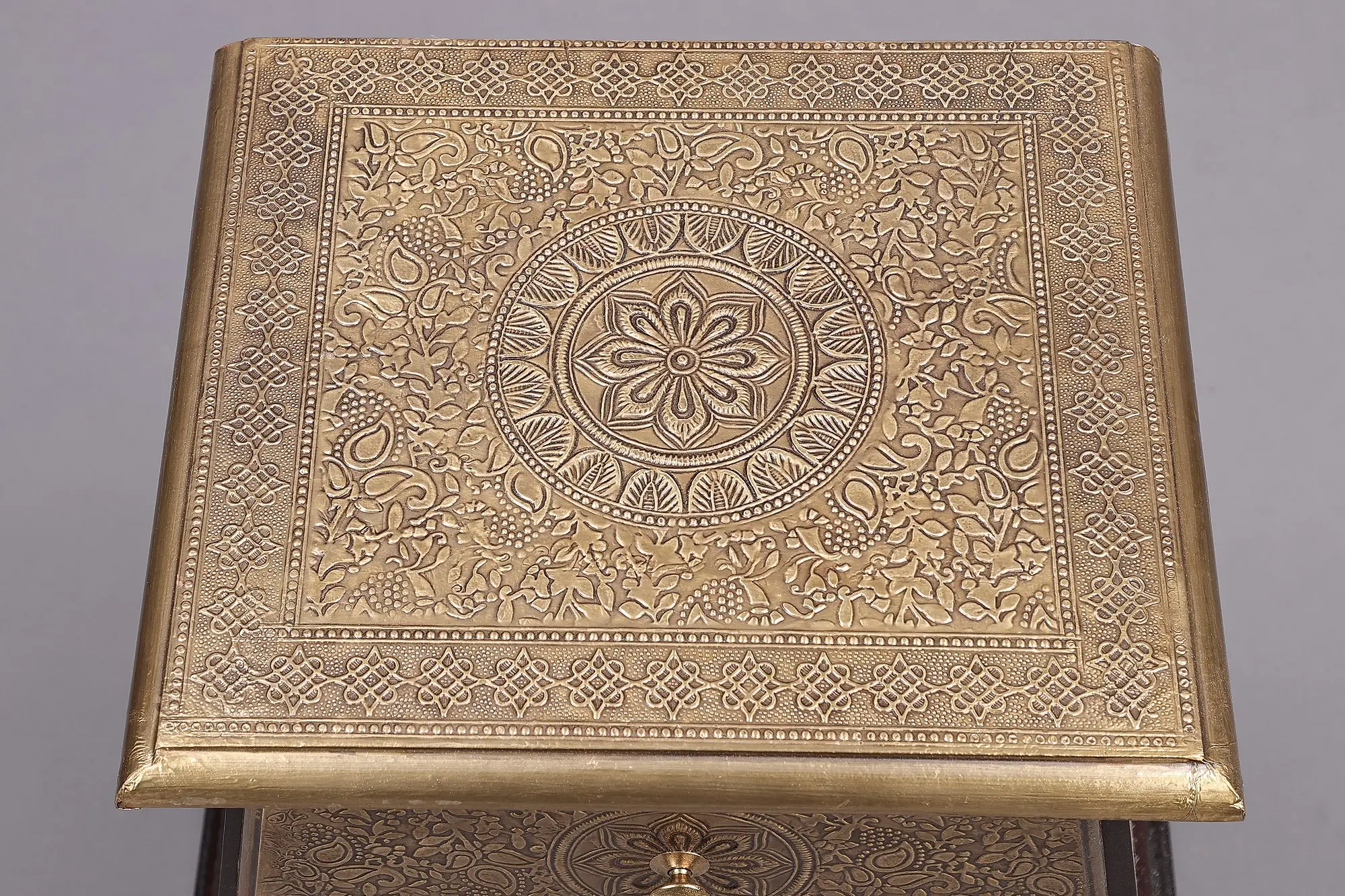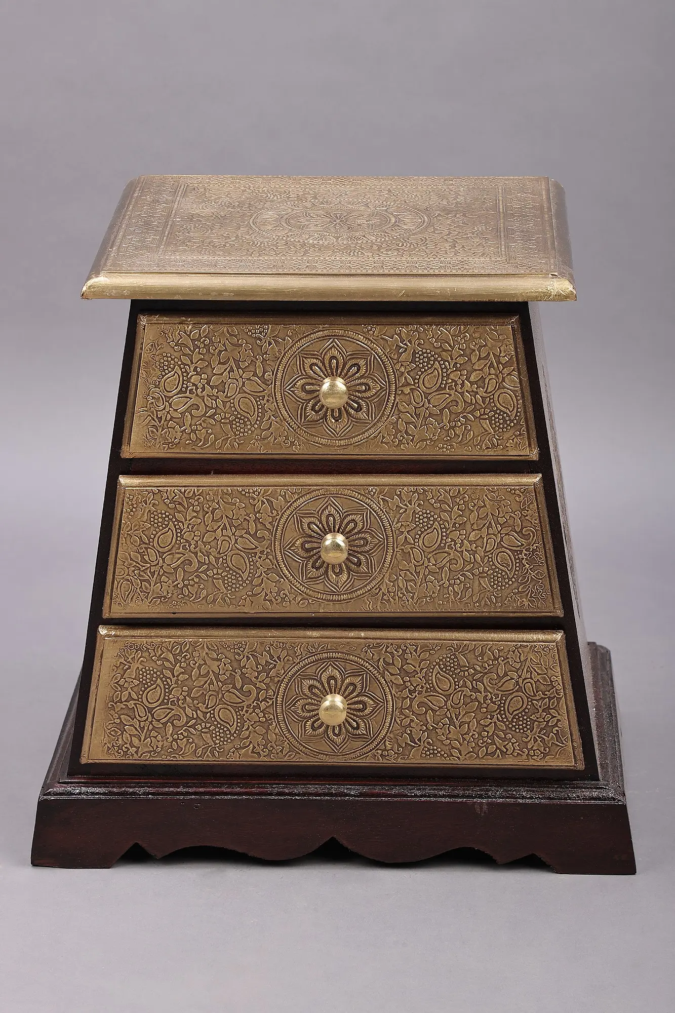 The pyramidal shape has been used in many art forms to represent a sustainable shape. This Brass-fitted wooden pyramid-shaped drawer is a tribute to the shape. This is a geometric masterpiece with three drawers that rise in sophistication like stairs. Elegant brass inlay adorns the frame and drawers, telling stories of luxury and artistry. Every drawer, topped with a knob, invites investigation and combines style and utility. A striking addition to any environment, the pyramid silhouette is a tribute to geometric expertise. Discover the beauty of order in this wooden work of art, where pyramid design and brass accents come together to create a storage symphony that is both carefully elegant and visually arresting.