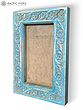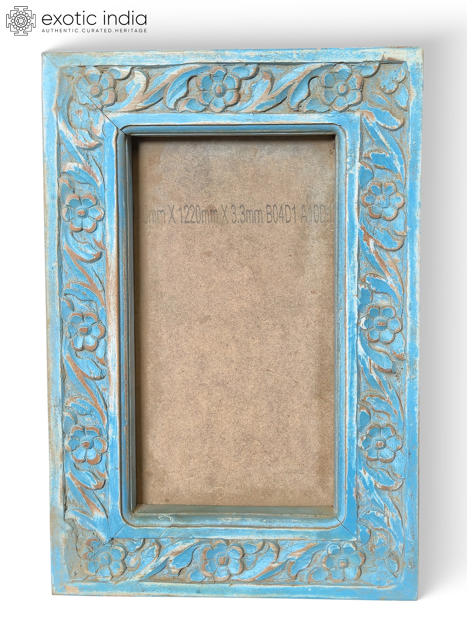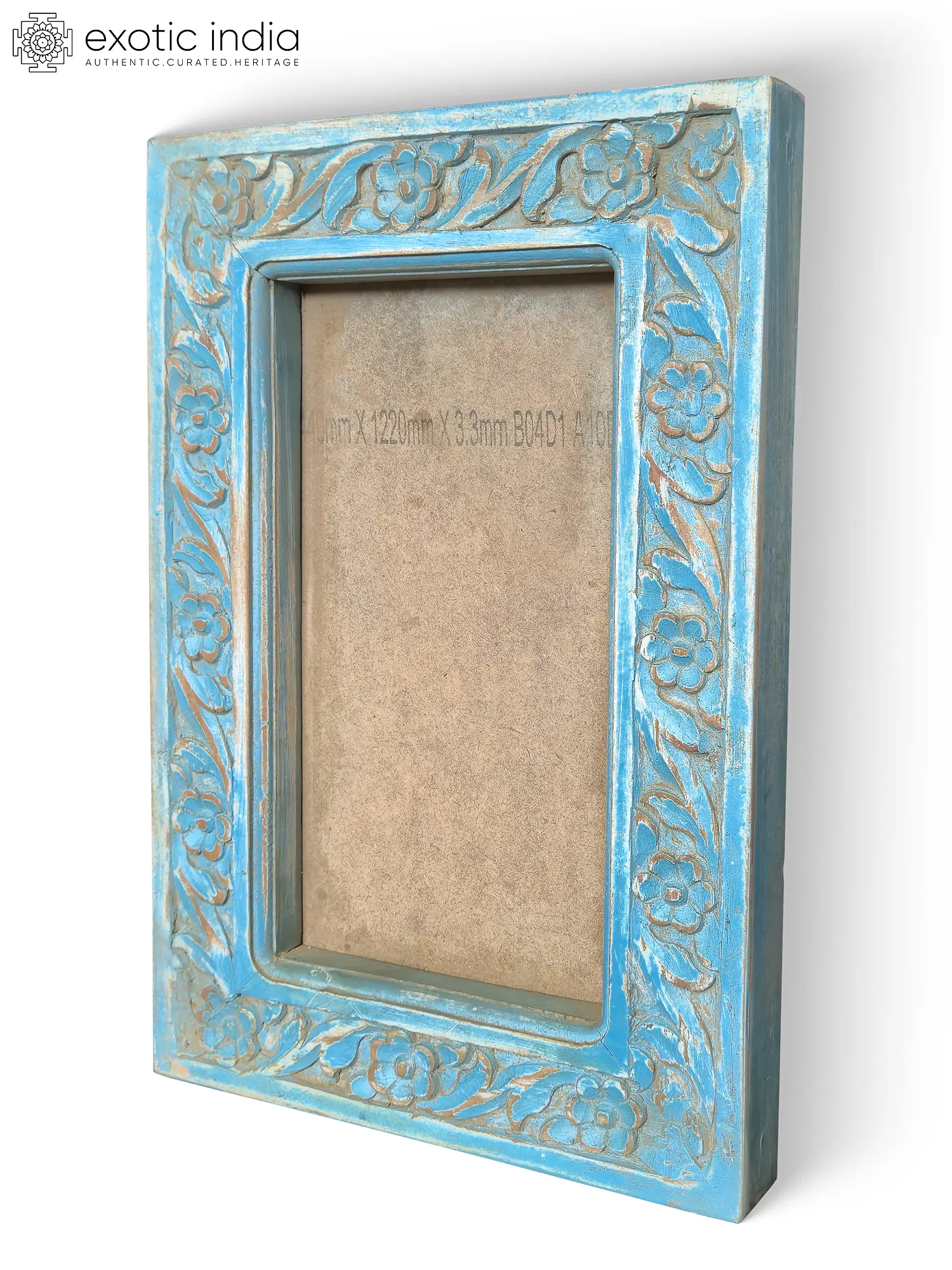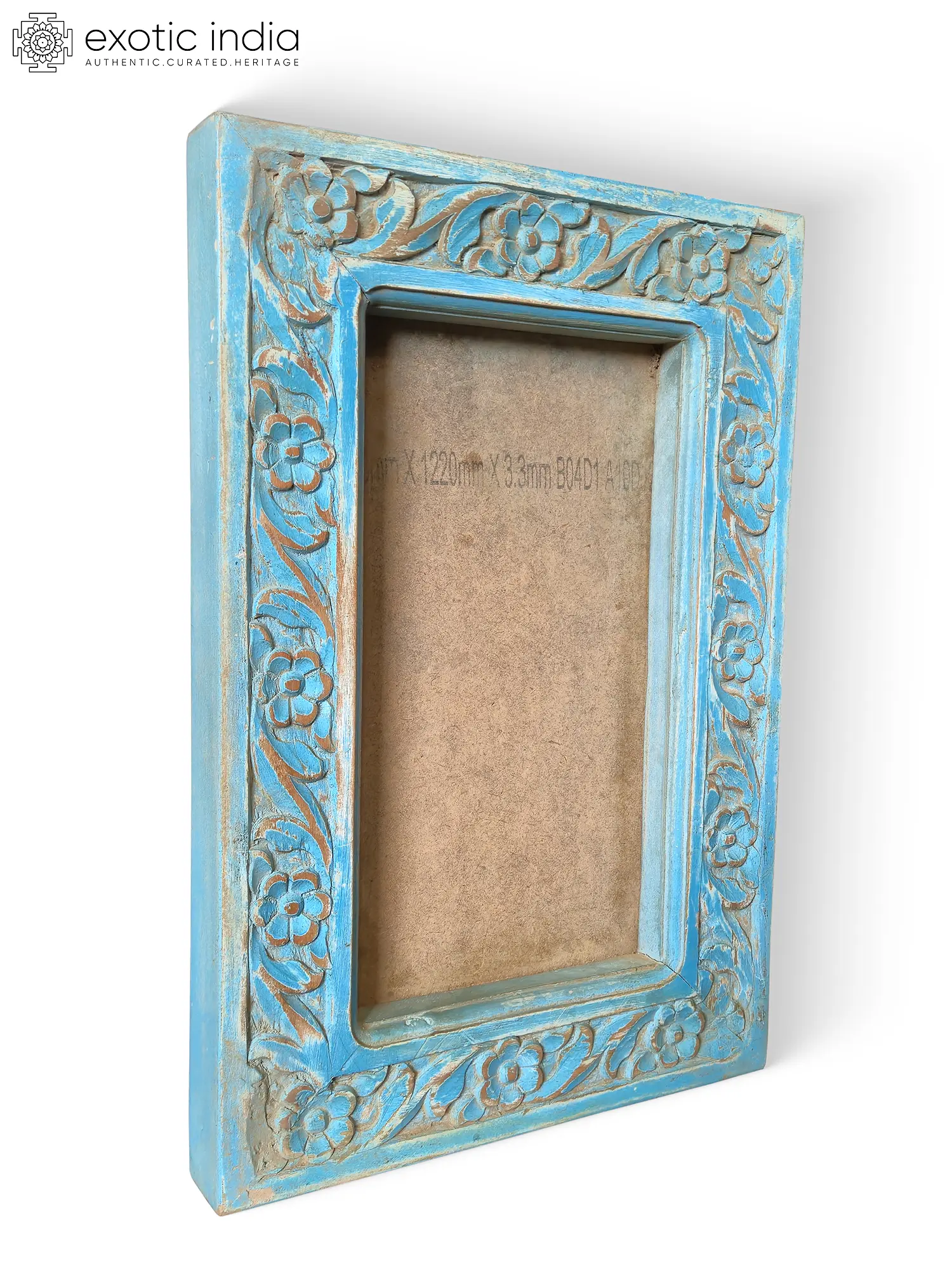 The frame is finished in a striking, distressed blue hue that enhances its antique appeal. The paint has been applied in a way that suggests layers of time, with hints of the underlying wood peeking through in places. This weathered finish lends the piece a charmingly imperfect, lived-in look, making it a perfect addition to bohemian, rustic, or shabby chic decor styles. It's a color that evokes the sky, the sea, or perhaps the faded elegance of a bygone era, bringing a serene yet vibrant presence to any space.