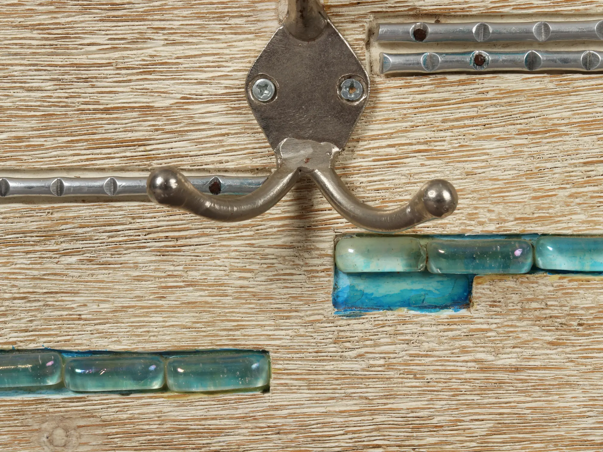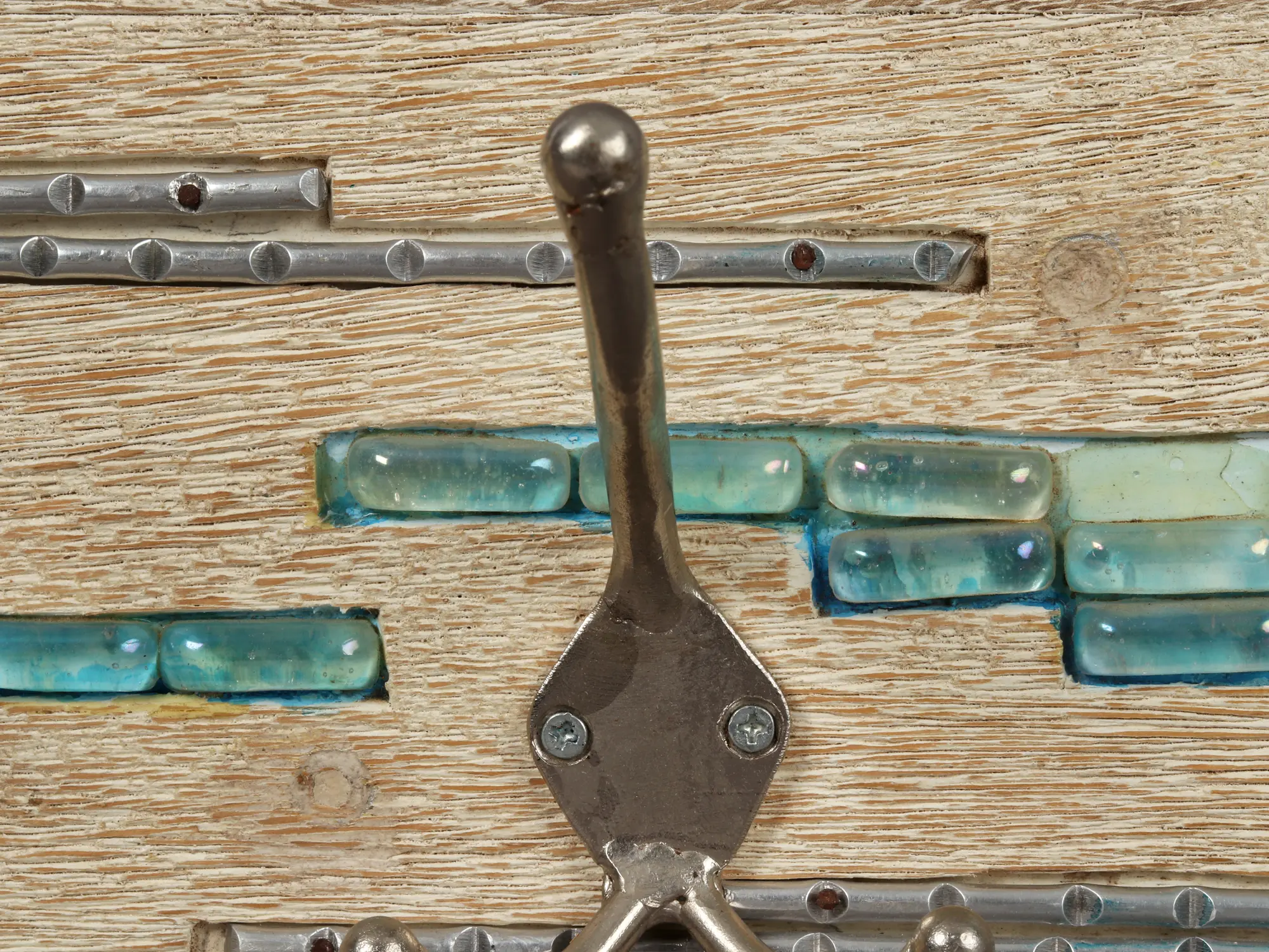 The true artistry of this hook rack lies in its innovative combination of materials. Integrated into the wood are channels filled with shimmering, translucent glass tiles. These tiles, in varying shades of cool blues and aquas, catch the light and create a mesmerizing visual effect, reminiscent of gentle waves or a serene sky. This striking contrast between the organic wood and the polished glass adds depth and a touch of unexpected luxury. Complementing the glass are robust iron hooks, designed with a classic, double-pronged silhouette. The brushed metal finish of the hooks provides a sturdy and reliable anchor for coats, bags, hats, and more, while their clean lines echo the understated elegance of the overall design.
