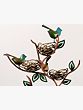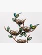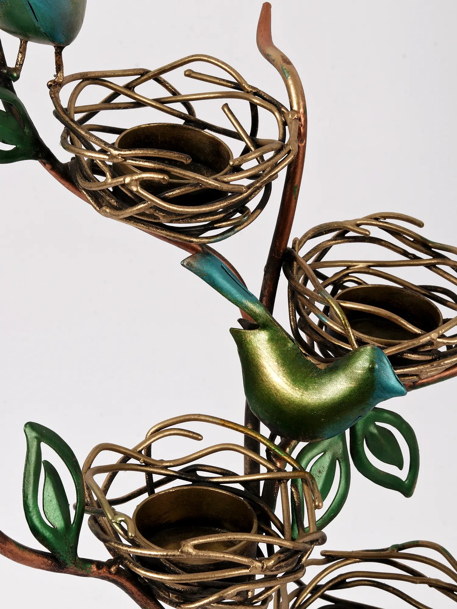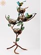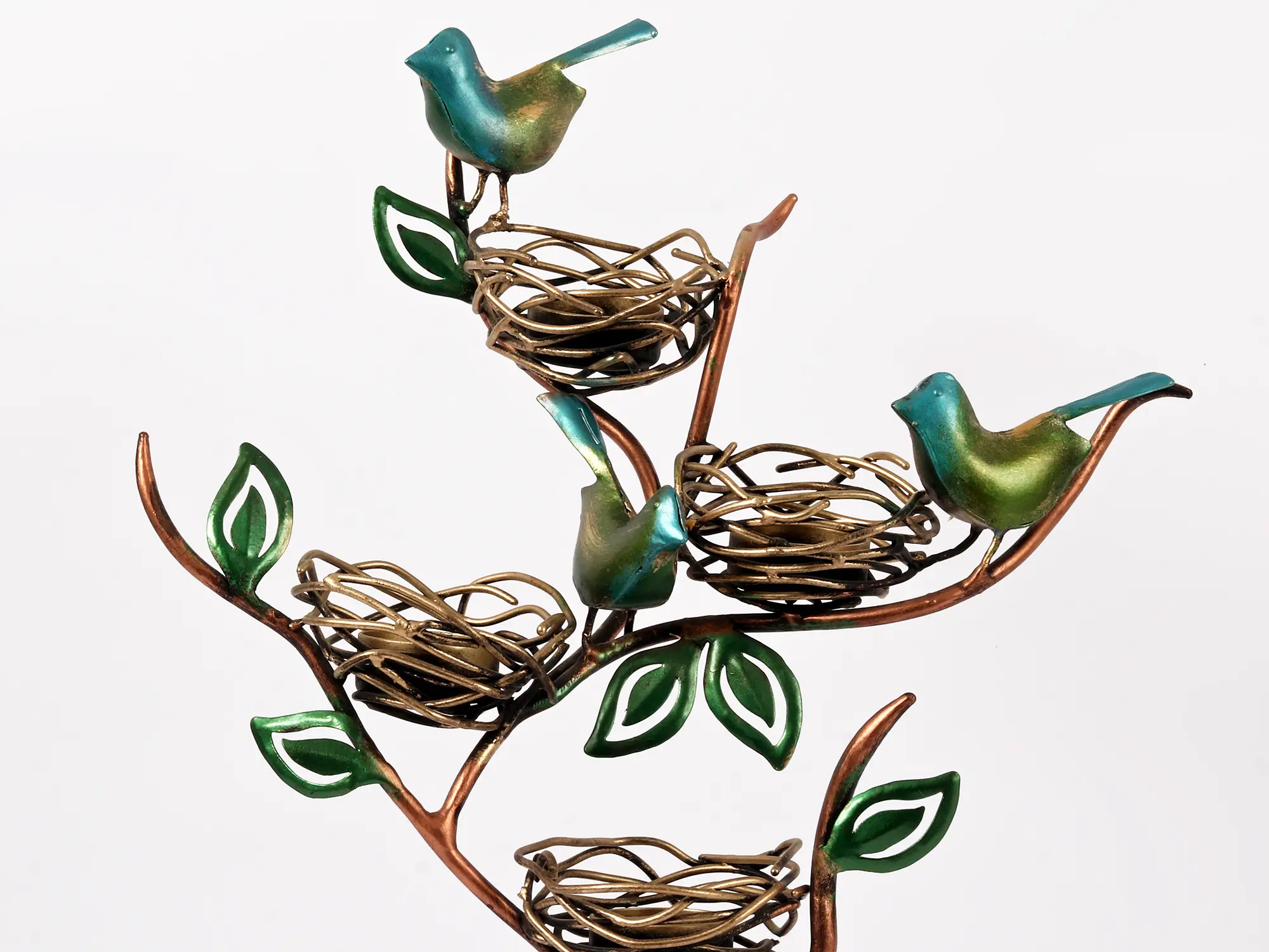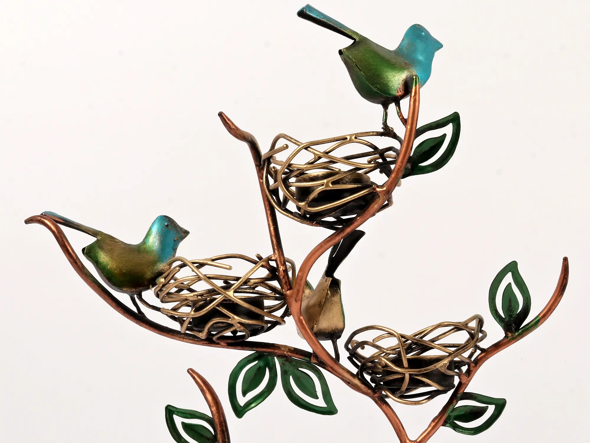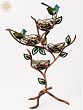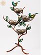 The four nests are elegantly woven and feature a beautiful gold finish that beautifully contrasts with the deep copper tones of the branches and the vibrant teal and green hues of the birds. The leaves are delicately crafted and add a touch of natural elegance to the overall design. The stand itself is designed to resemble a stylized tree, with gracefully curving branches supporting the nests and birds, creating a sense of balance and organic harmony. Each detail, from the tiny bird's beak to the intricate weave of the nests, demonstrates the superior craftsmanship of this piece. The metal is durable and well-finished, promising years of enjoyment.