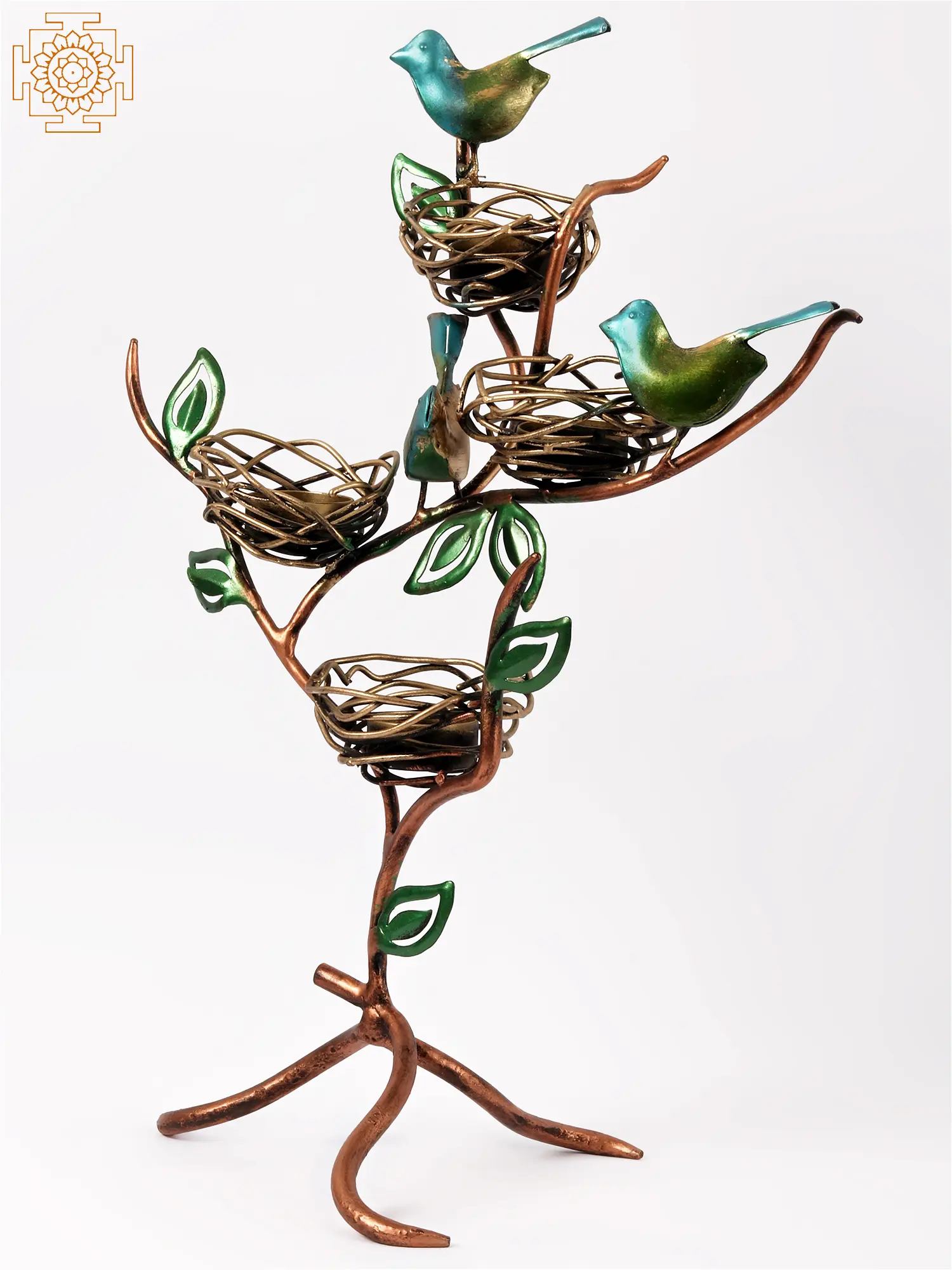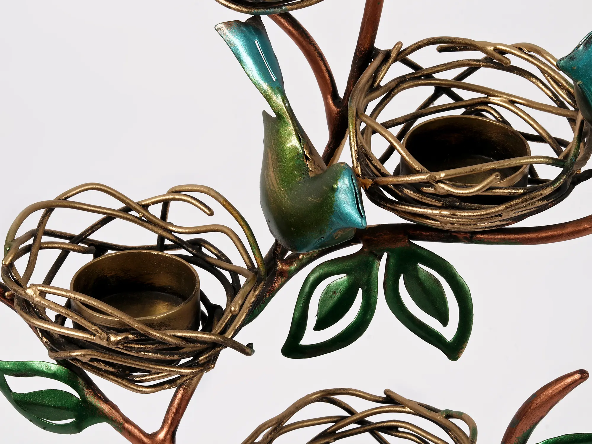 Bring the beauty of nature indoors with this enchanting 19-inch tall candle stand. Crafted from iron and meticulously designed, this piece showcases four intricately detailed bird nests nestled amongst leafy branches, each occupied by a vibrant, jewel-toned bird. The combination of copper and green tones creates a warm, inviting aesthetic that complements a wide range of interior styles, from rustic farmhouse to modern minimalist. This charming decorative accent is more than just a candle holder; it's a statement piece that adds character and visual interest to any room. Its unique design makes it a perfect conversation starter and a delightful focal point for your coffee table, mantelpiece, or bookshelf.