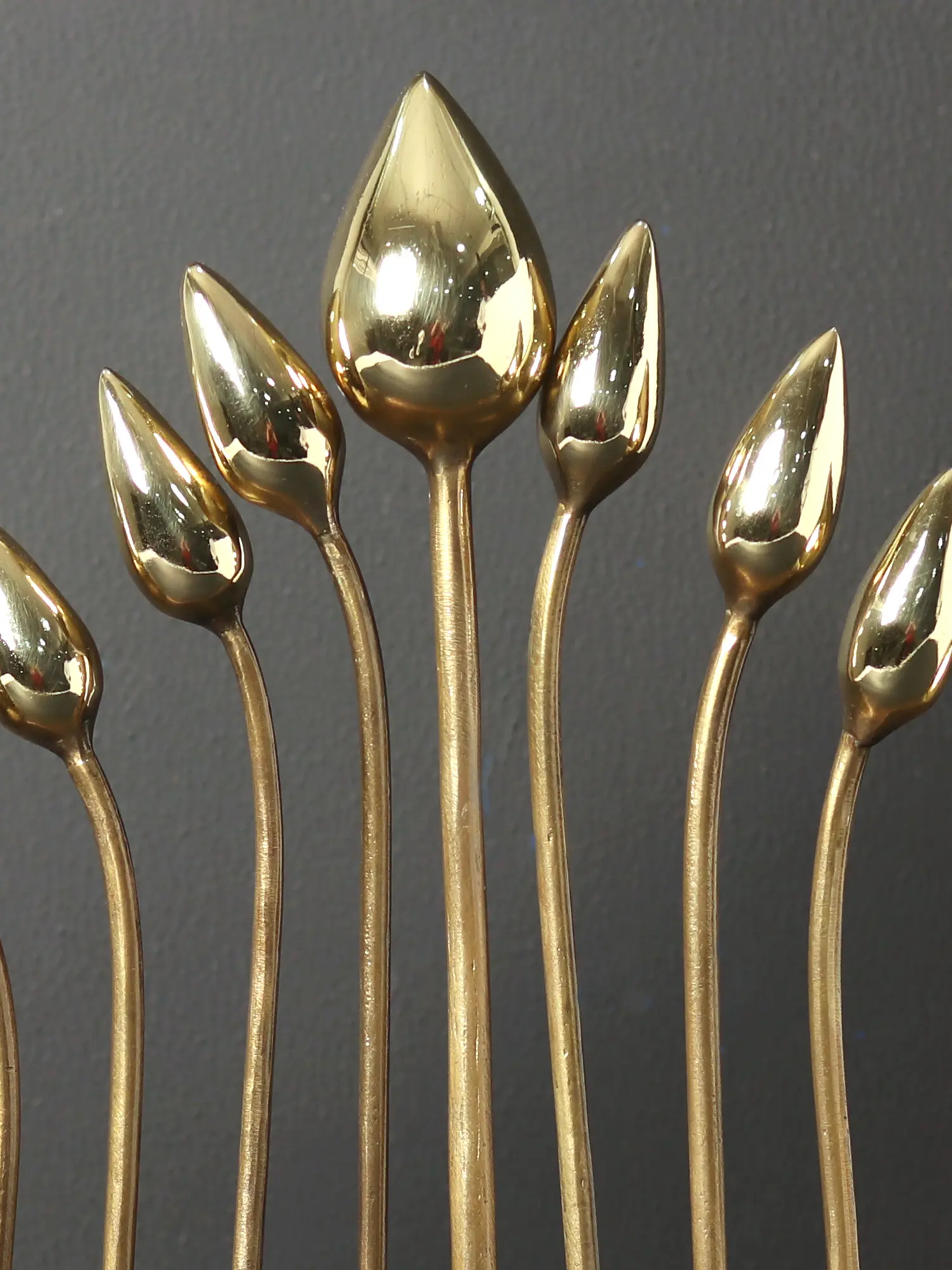 Crafted from high-quality brass, this piece is more than just a decoration; it's a testament to fine artistry. The smooth, polished surface reflects light beautifully, creating a warm and inviting ambiance. Each bud is meticulously formed, with a sleek, elongated shape that adds a modern edge to the overall design. The piece stands firmly on a solid base, providing stability and a sense of groundedness. The arrangement of the buds in varying heights creates a dynamic visual effect, drawing the eye and inviting closer inspection.