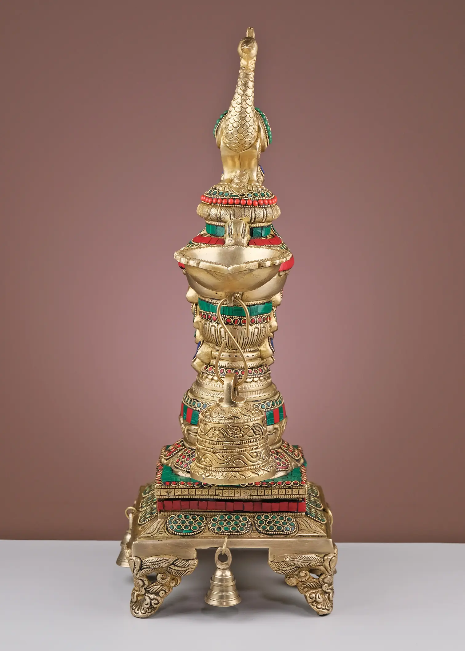 Adorned with inlay work and forged in brass, this ravishing artwork showcases a regal peacock perched atop a magnificent array of “Kalashas,” resting on an ornate chowki embellished with captivating carvings and dangling bells. Symbolizing prosperity and protection, the peacock carries a diya beneath which a bell gently sways, evoking serenity and grace.