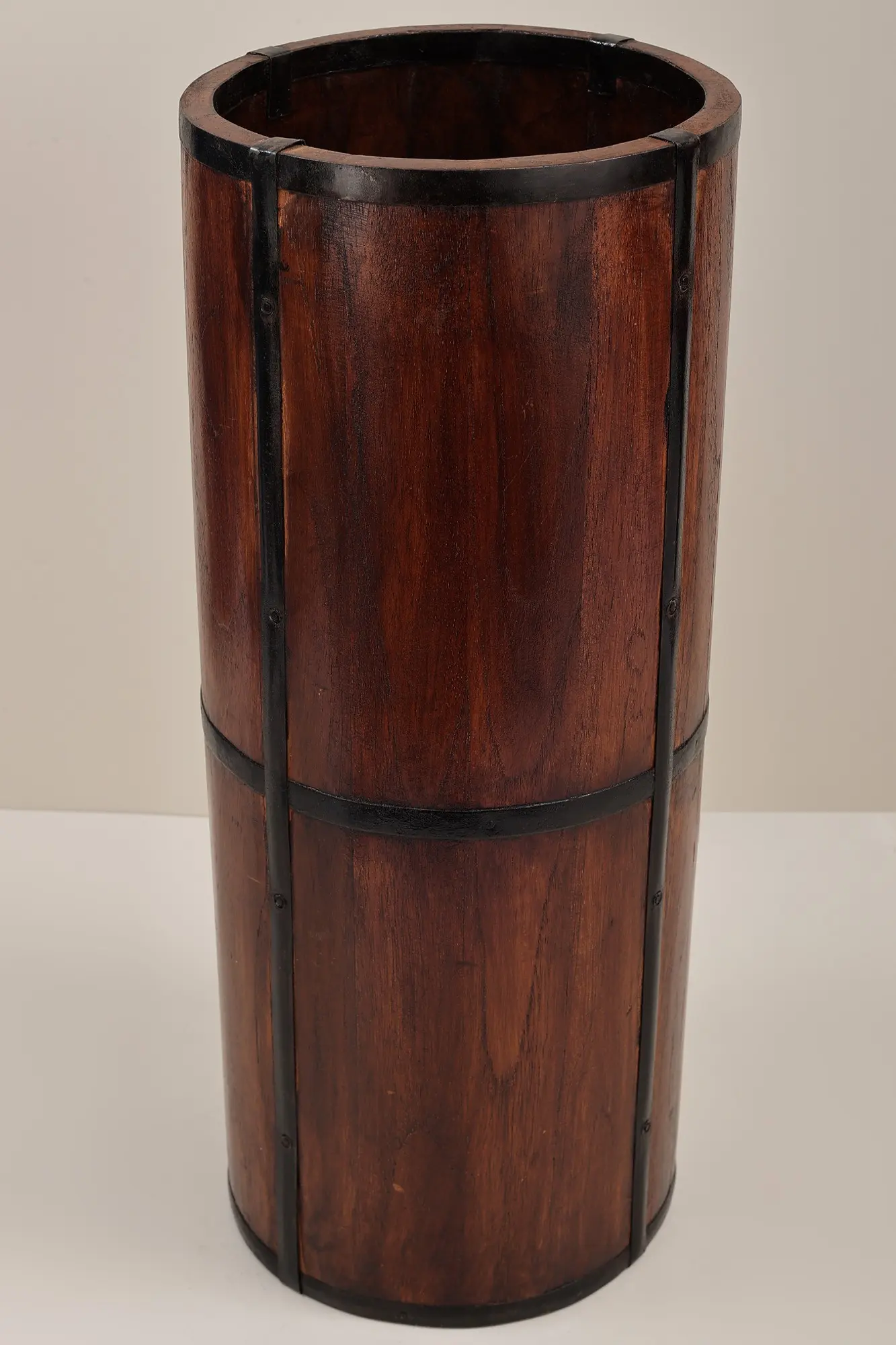 Wooden planters are lovely gardening accessories that may also be utilized as house decor. With these Round Wooden Planters made of sturdy Mango wood, you can embrace rustic charm. The tubular shape, which resembles ancient gunpowder barrels, emanates a traditional charm. Metal straps in black color enhance the planter's beauty by mimicking the original construction and reflecting the industrial vibe of a bygone period. The sculpture is painted in a dark brown wood tone, giving it a genuine and rustic appearance. A sturdy structure and timeless style combine to produce a one-of-a-kind vase for your botanical arrangements. These round planters will elevate your foliage while invoking nostalgia and bringing a touch of antique elegance to your indoor or outdoor environments.
