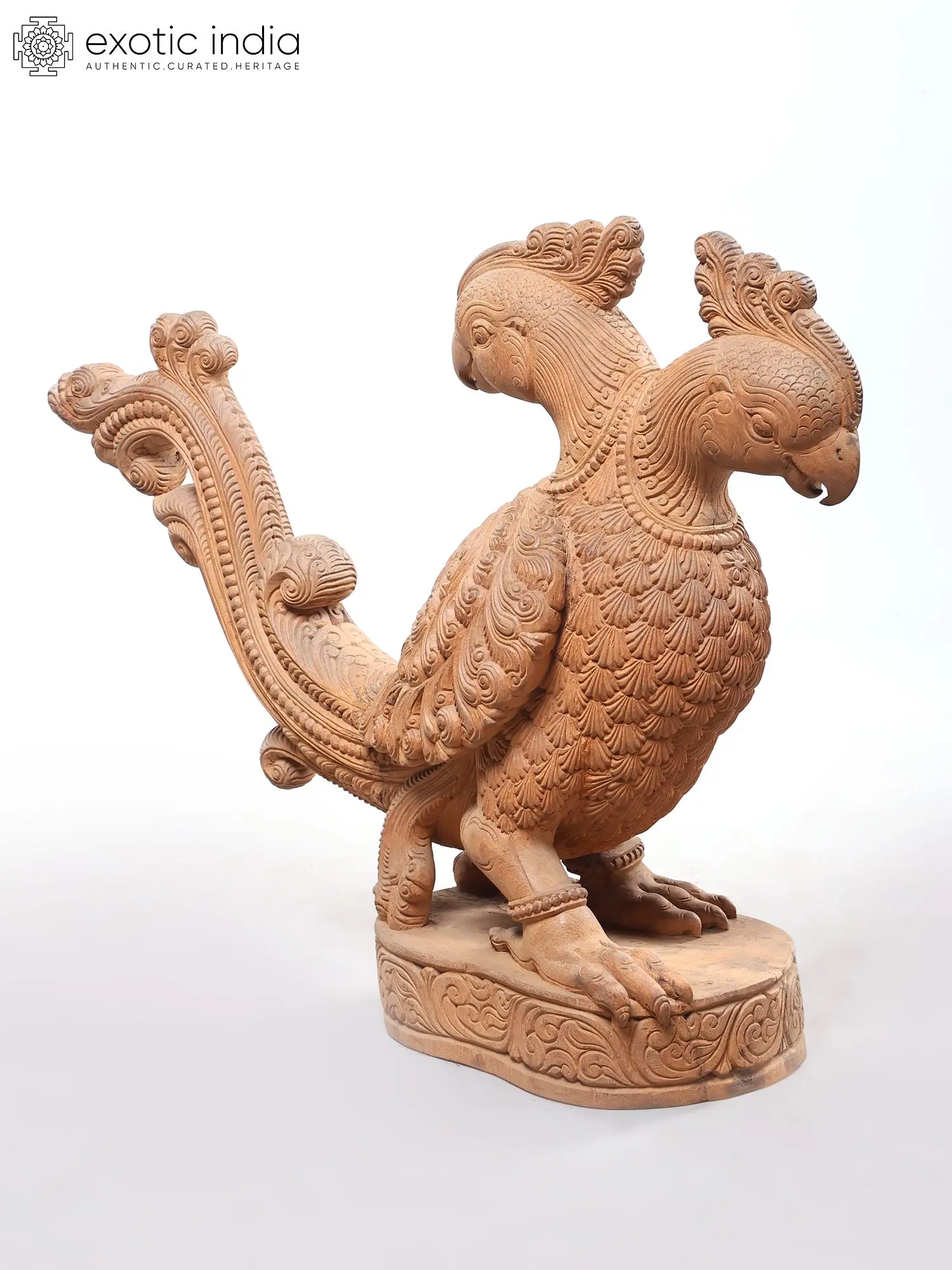 Showcases a striking two-headed parrot design, meticulously carved from wood.