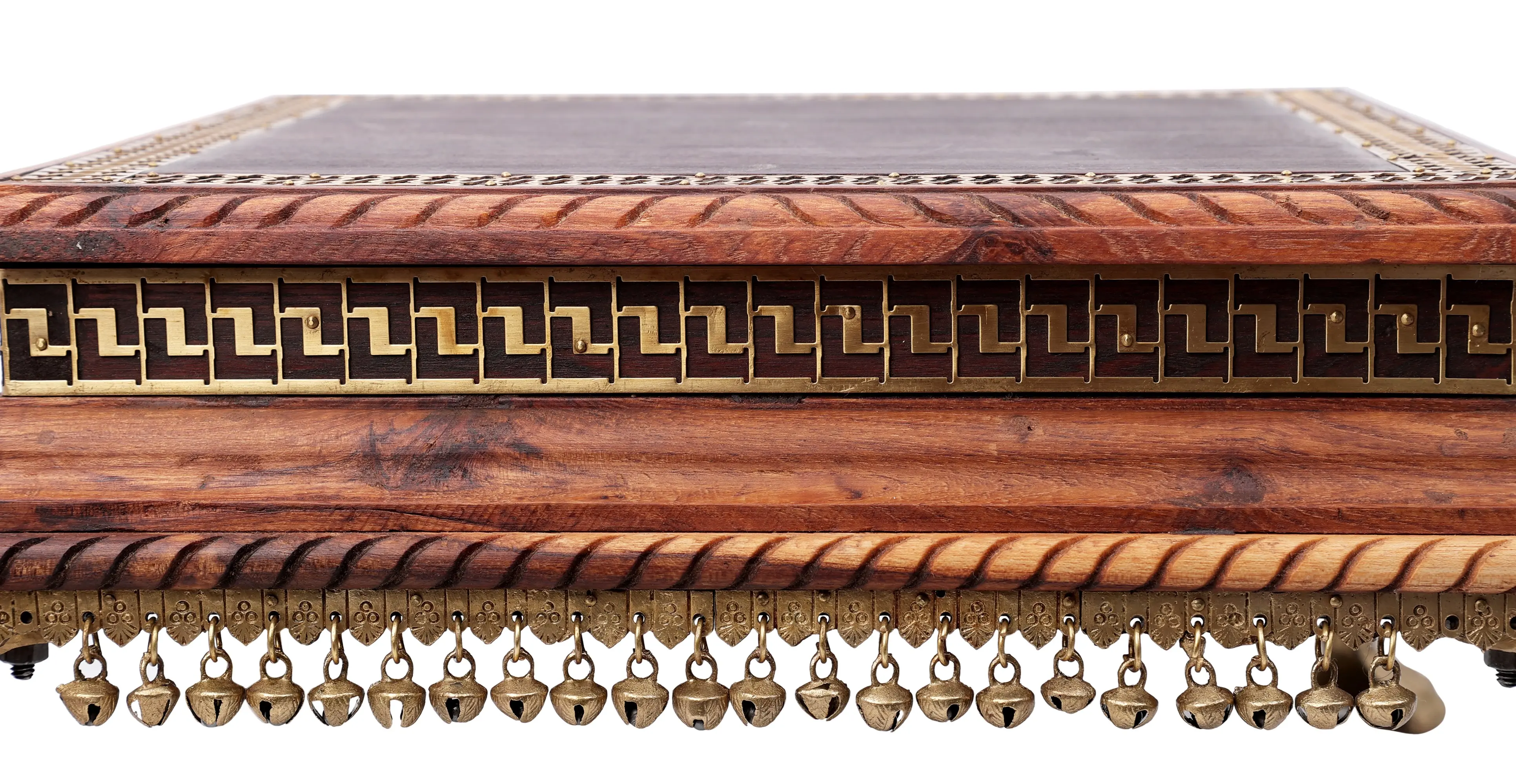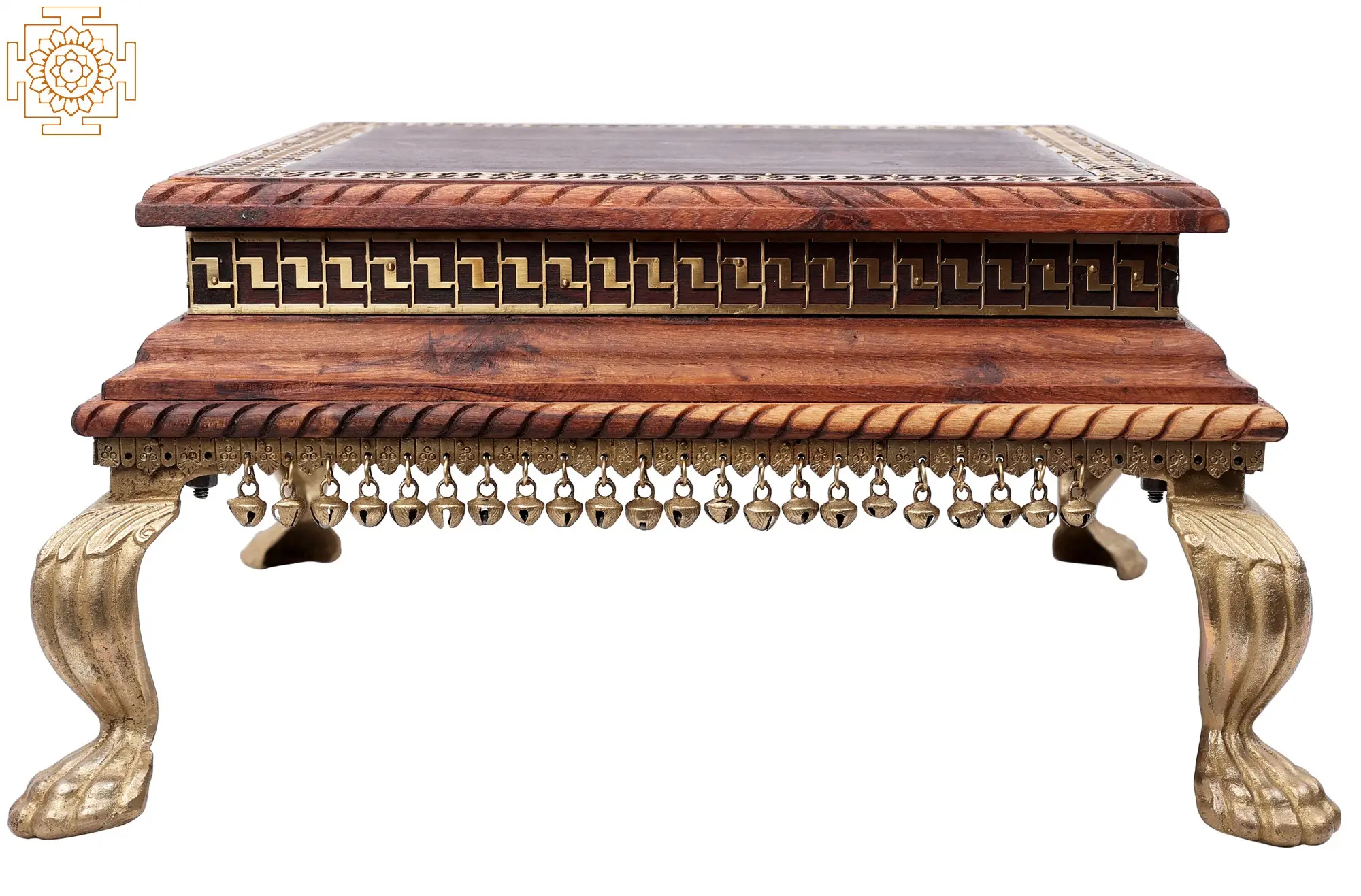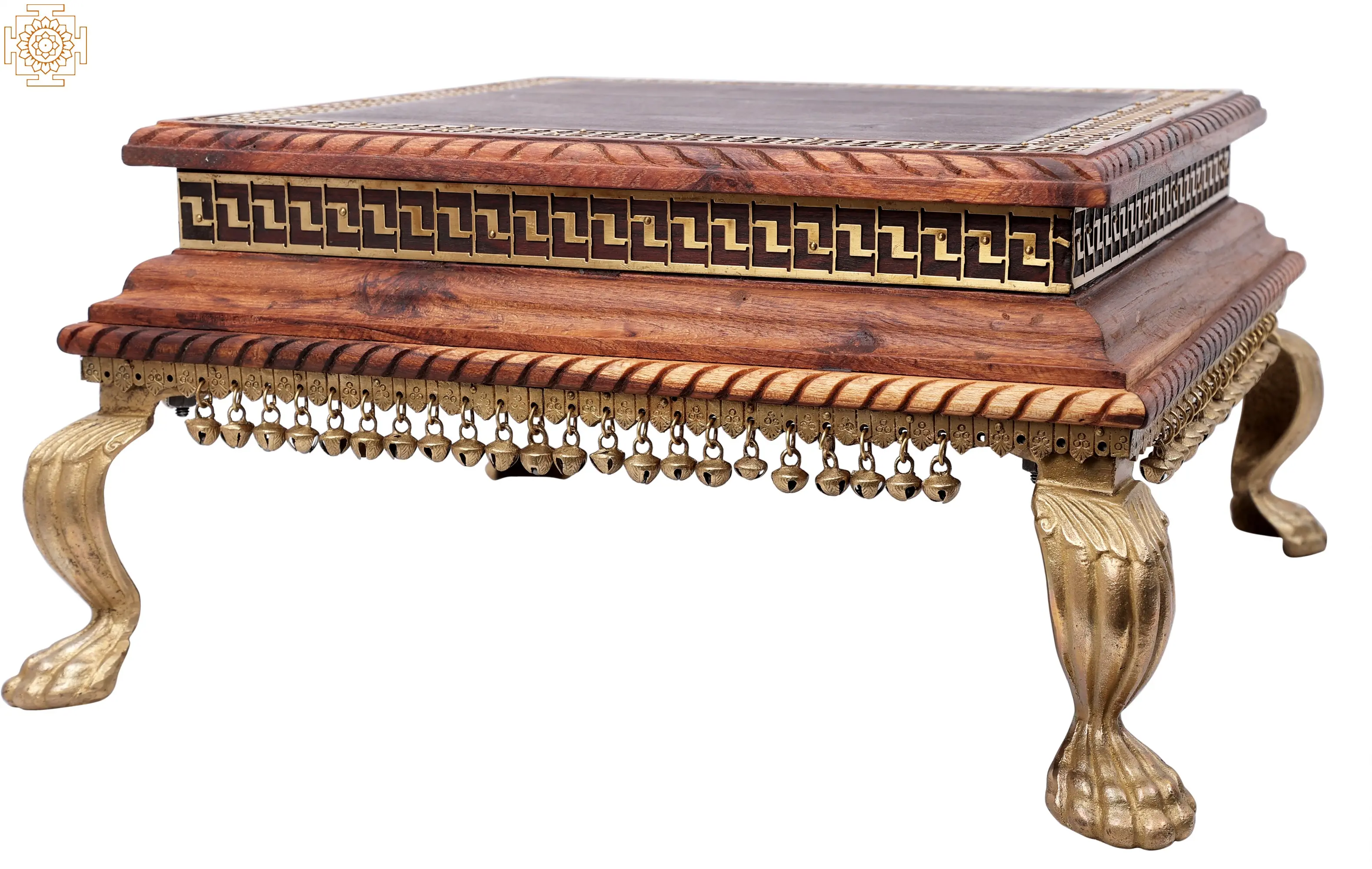 A six-layered high profiled squared chowki (wooden pedestal) hand-made by very skilled artisans, having no match. Edges on all sides of each layer are molded in a circular or V-shape. The top and platform beneath it have sophisticated brass inlay work in geometric patterns. Fringes of medium size bells (ghunghru) are hanging, tied with a garland decorated with brass flowers attached on the lower layer. The whole flattering structure stands on four legs designed in the lion's paws. An authentic possession for your dwelling.