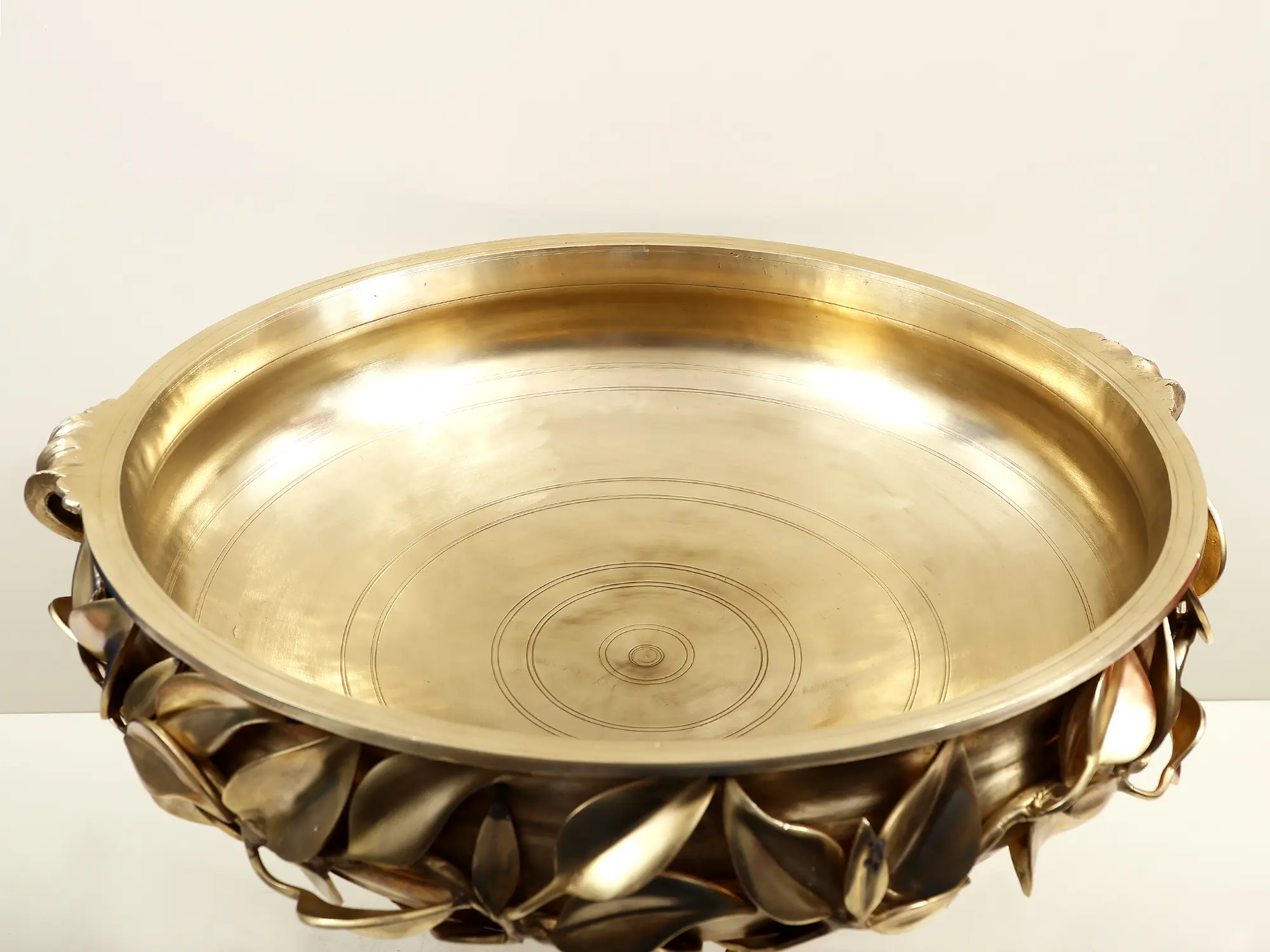The exterior of the Urli is adorned with a breathtaking, three-dimensional floral and leaf motif. Each petal and leaf is meticulously sculpted, appearing to gracefully cascade around the rim, creating a sense of organic movement and natural elegance. This intricate detailing evokes the beauty of a blooming garden, adding a lush and vibrant feel to your living space. The interplay of light and shadow across these sculpted elements highlights the rich texture and depth of the design, making it a visual delight from every angle. ––––––––––––––––––––